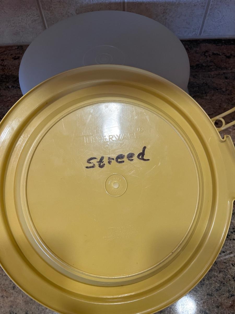 TUPPERWARE TRAVELING CAKE TOTE, SERIAL CONTAINER WITH HANDLE, AND A NICE SIZED RUBBRRMAID CONTAINER