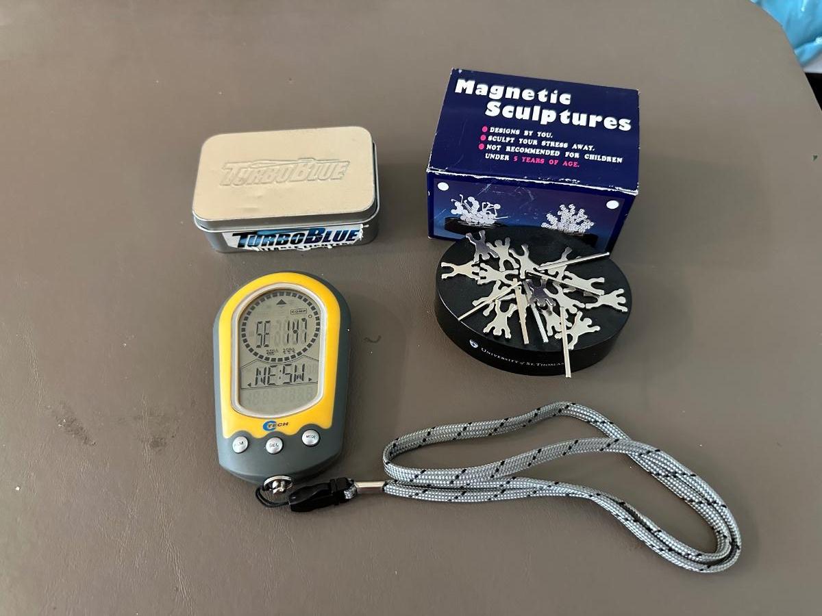 TURBOBLUE CAMCORDER TORCH, MAGNETIC SCULPTURES DESK ART AND C TECH OUTDOORSMAN DIGITAL COMPASS