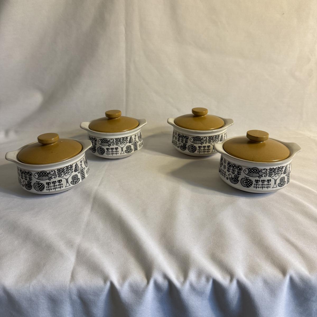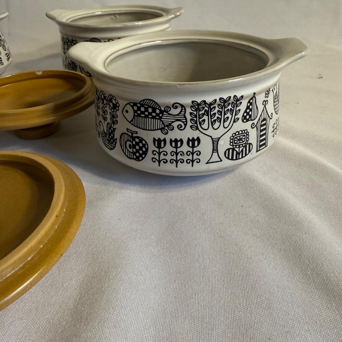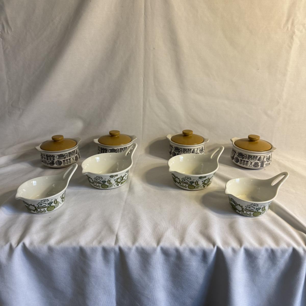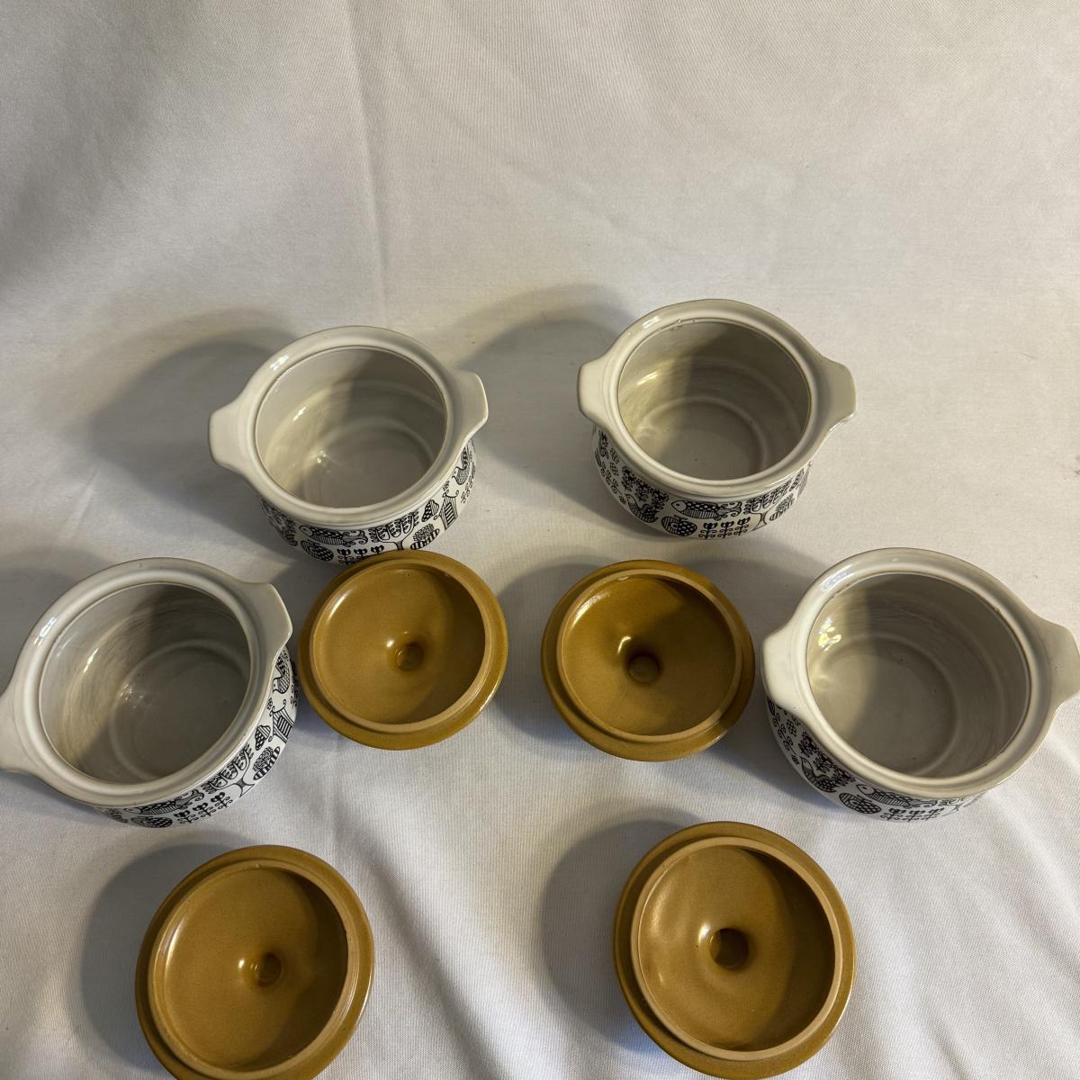 This lot contains a total of eight items, four sauce bowls and four casserole dishes. Starting with the sauce bowls they appear to be ceramic and all four are stamped with “Tori-Design” and “Market” on the bottom. There are two medium sized bowls and two smaller sized bowls. Each one has a handle and a pouring spout for sauces or gravies. They all have a matching green designs. The larger bowls measure 5”D x 2”H. The smaller bowls measure 4.25”D x 2”H. Moving on to the casserole dishes. These precious dishes come each come with mustard lids and while they do appear to be mid-century modern, with their black and white design, they do not have a stamp on them. Each one appears to be ceramic and measures 4.5”D x 2.5”H without lid and 3.5”H with lid. Shipping available. Shipping can be costly. We suggest contacting our preferred local shipping provider, Postage Express, with dimensions and getting an estimate before bidding: (828) 255-9250 or shipping@postageexpressnc.com.