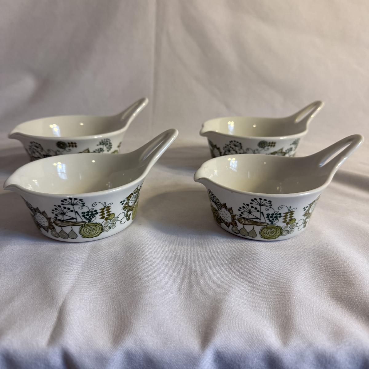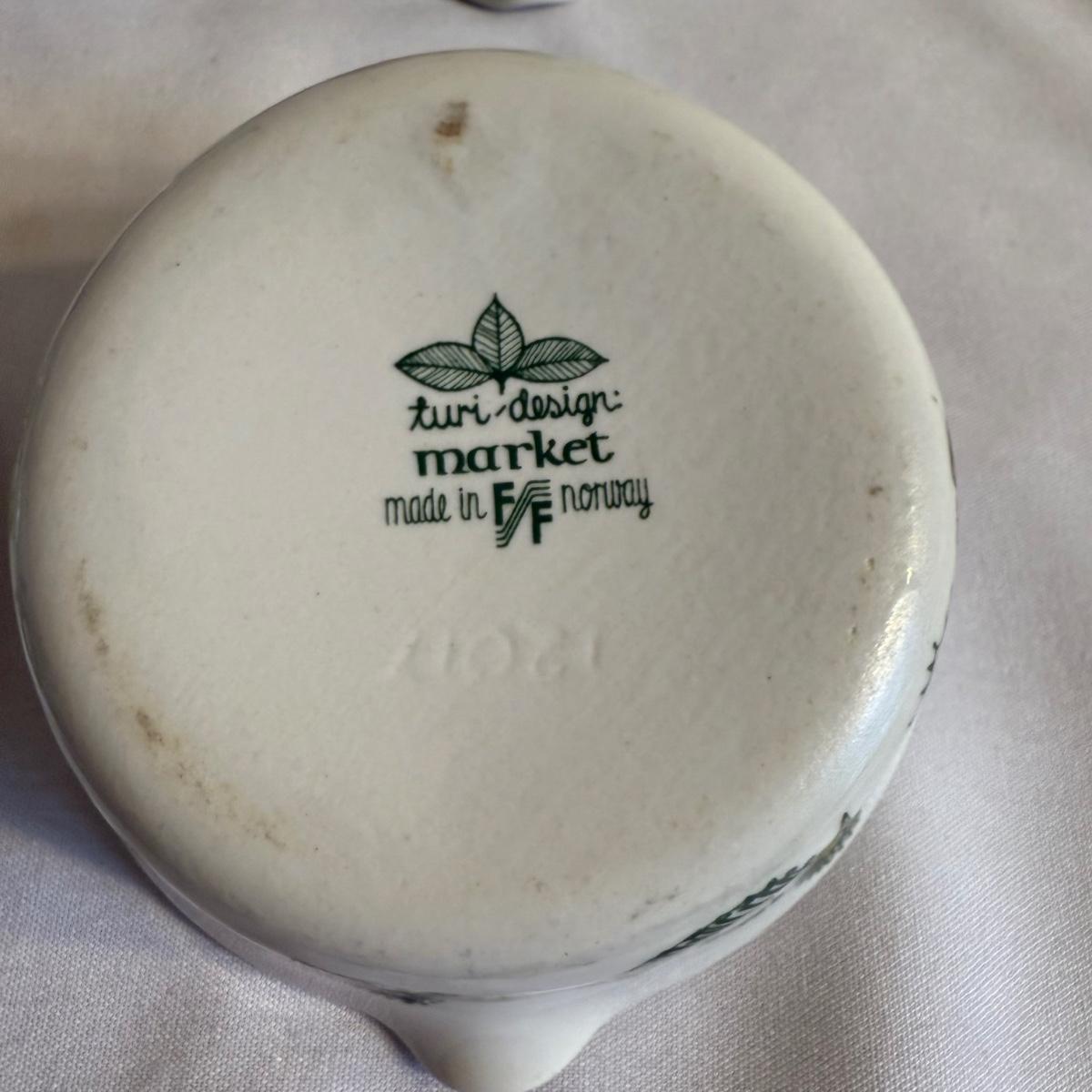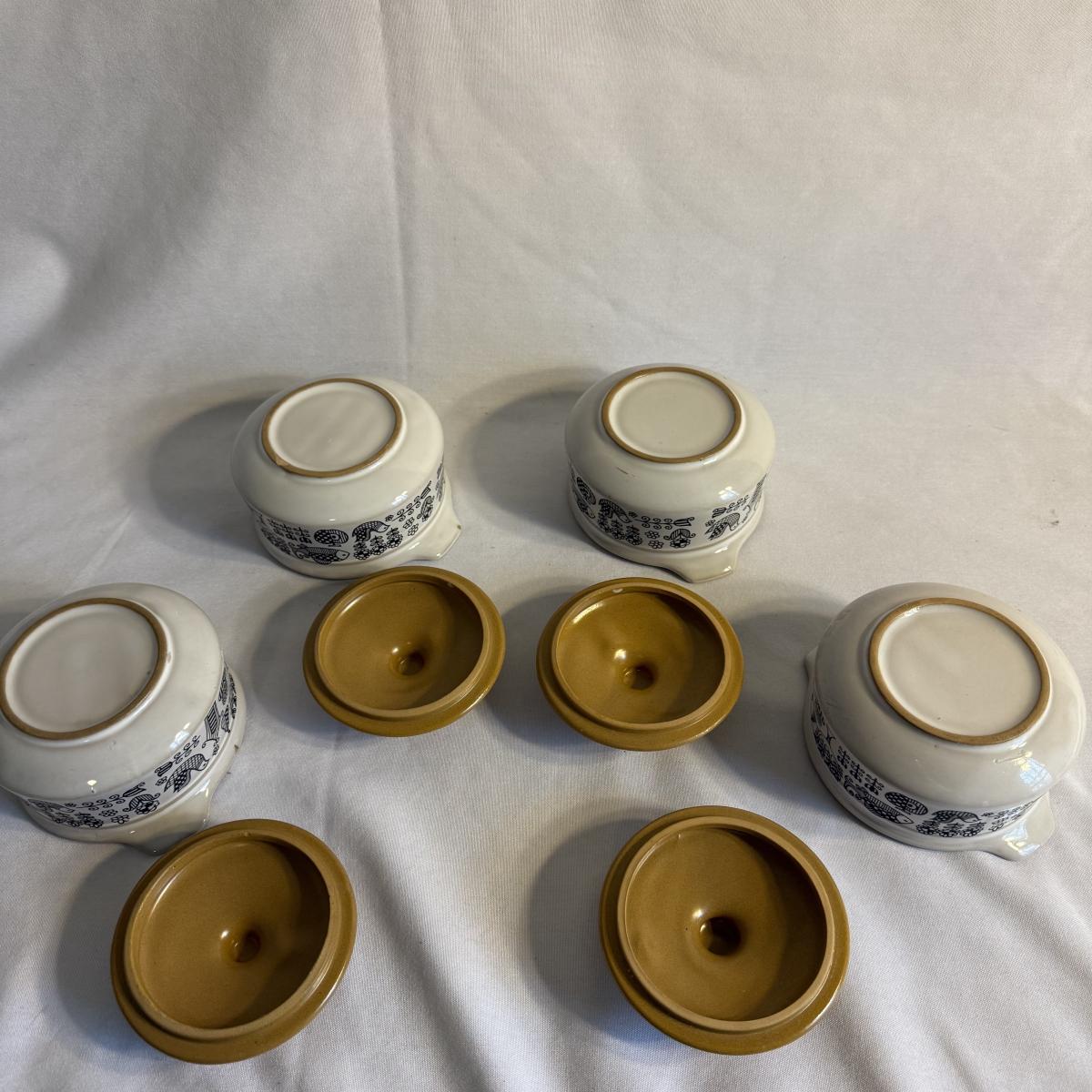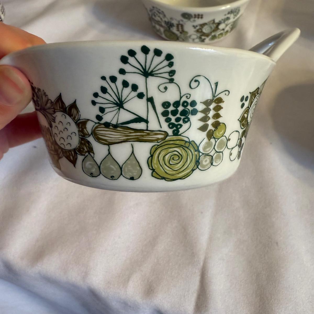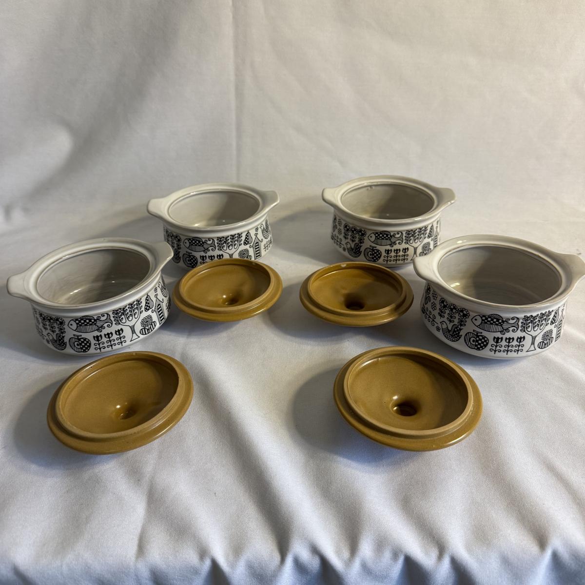This lot contains a total of eight items, four sauce bowls and four casserole dishes. Starting with the sauce bowls they appear to be ceramic and all four are stamped with “Tori-Design” and “Market” on the bottom. There are two medium sized bowls and two smaller sized bowls. Each one has a handle and a pouring spout for sauces or gravies. They all have a matching green designs. The larger bowls measure 5”D x 2”H. The smaller bowls measure 4.25”D x 2”H. Moving on to the casserole dishes. These precious dishes come each come with mustard lids and while they do appear to be mid-century modern, with their black and white design, they do not have a stamp on them. Each one appears to be ceramic and measures 4.5”D x 2.5”H without lid and 3.5”H with lid. Shipping available. Shipping can be costly. We suggest contacting our preferred local shipping provider, Postage Express, with dimensions and getting an estimate before bidding: (828) 255-9250 or shipping@postageexpressnc.com.