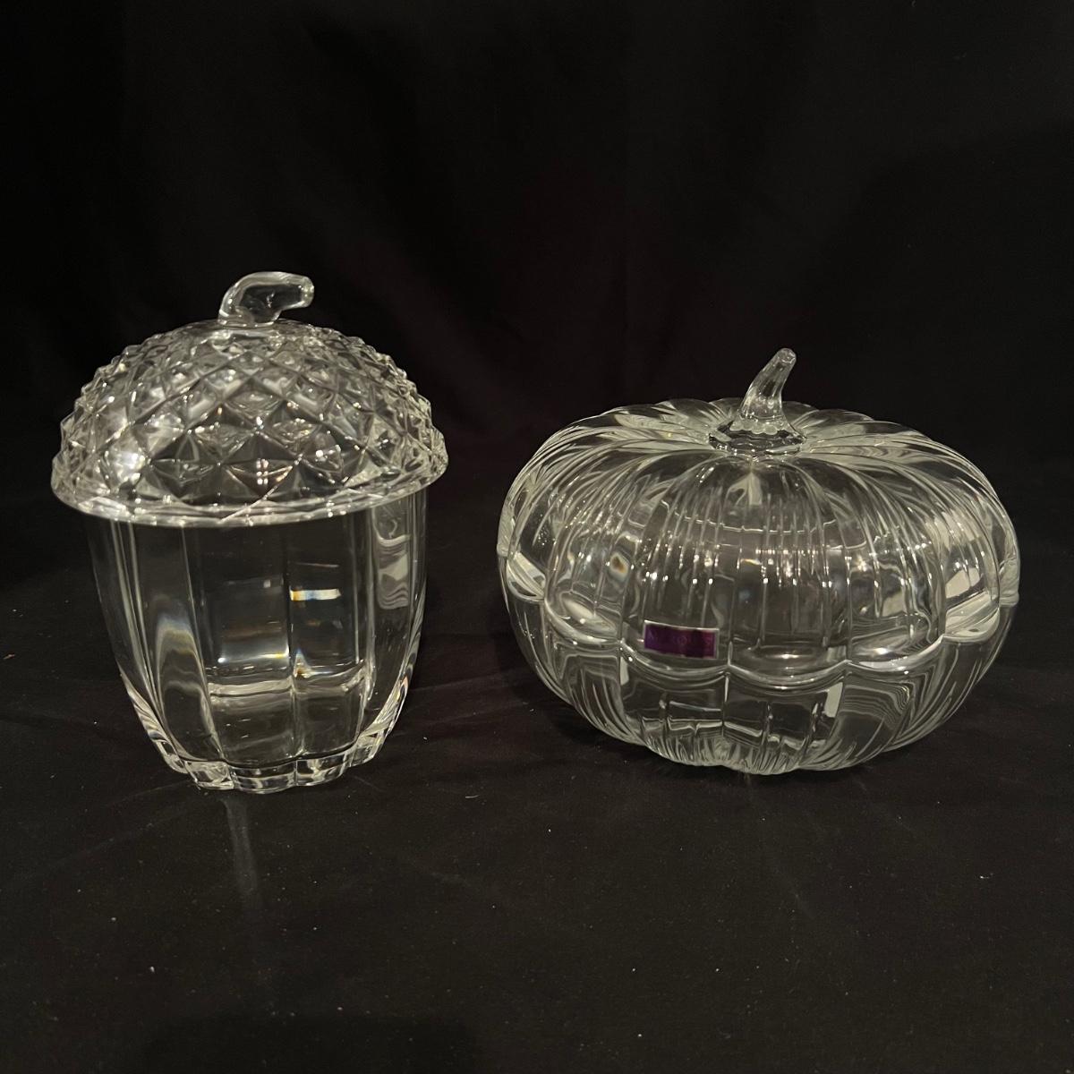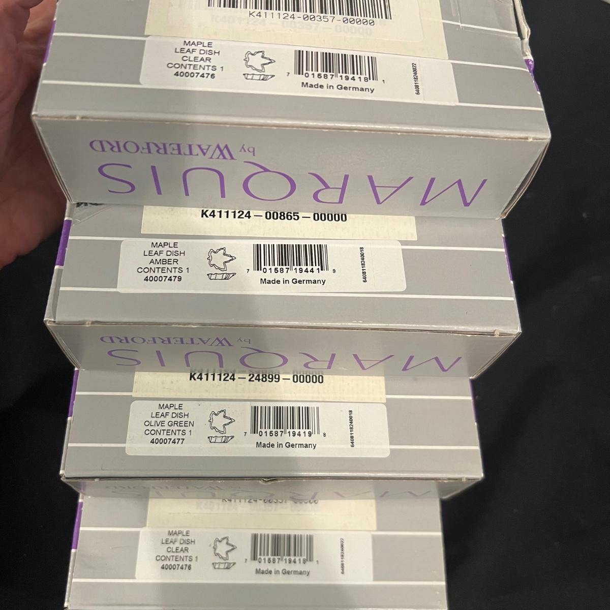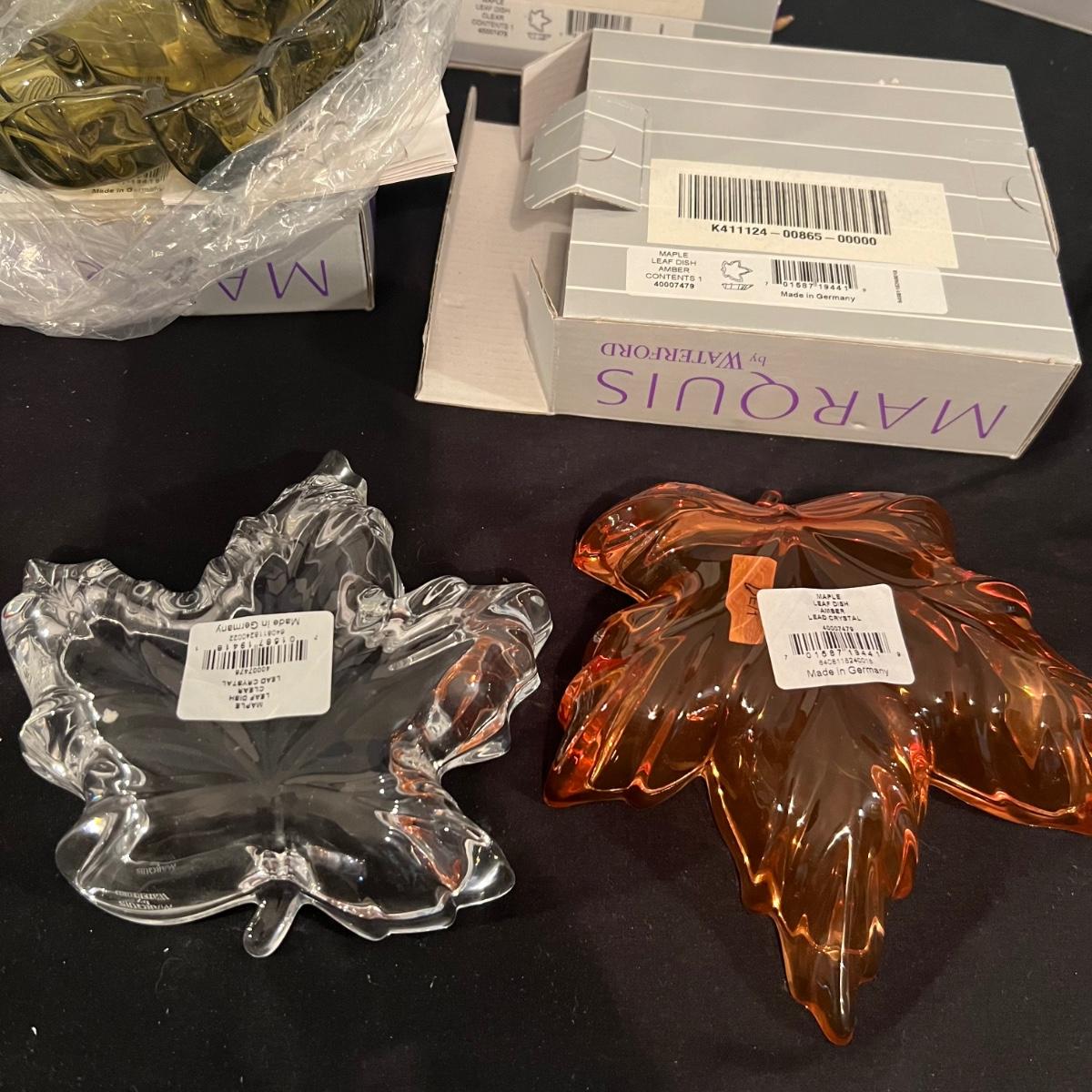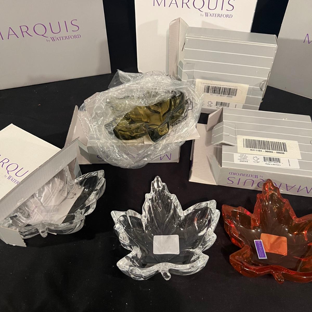 All Waterford Crystal, these eight items includes four matching Maple Leaf dishes, a Cornucopia vase plus a Pumpkin, Turkey and acorn lidded vessels. All items appear to be new in box but please note the moisture damage to the pumpkin box. Box size is indicative of its contents.