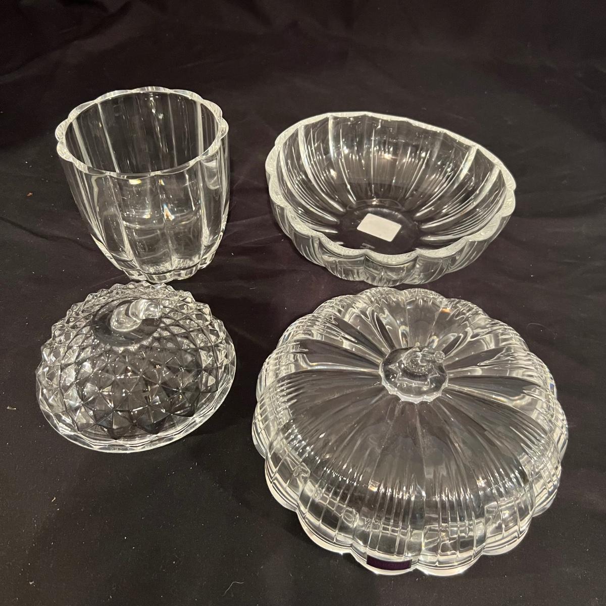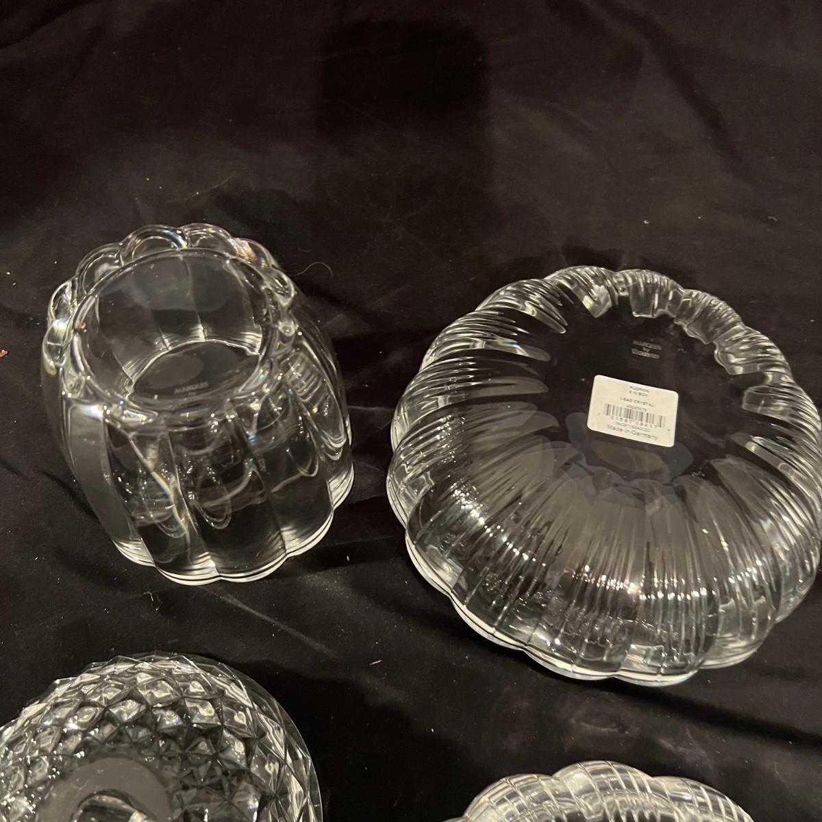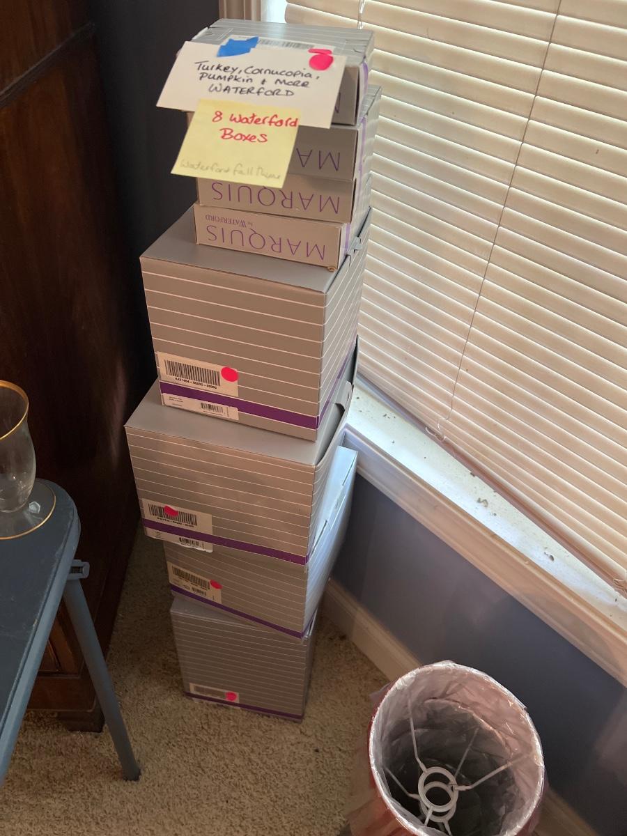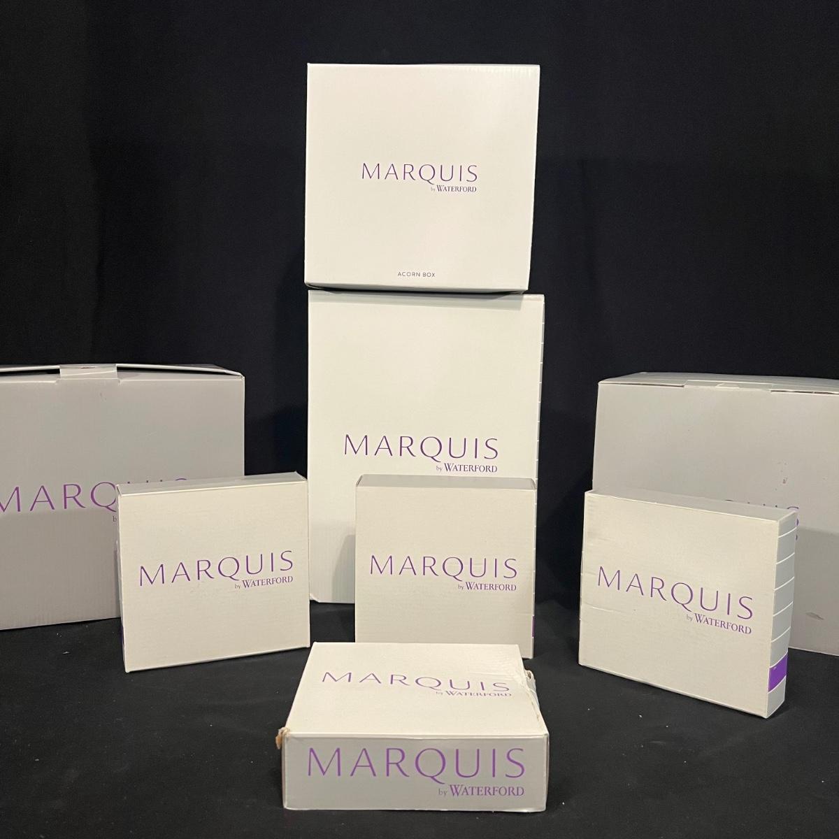 All Waterford Crystal, these eight items includes four matching Maple Leaf dishes, a Cornucopia vase plus a Pumpkin, Turkey and acorn lidded vessels. All items appear to be new in box but please note the moisture damage to the pumpkin box. Box size is indicative of its contents.