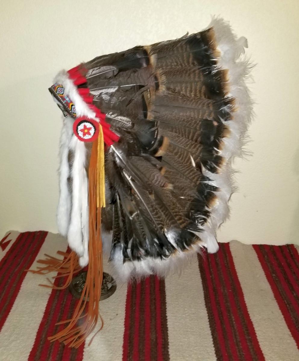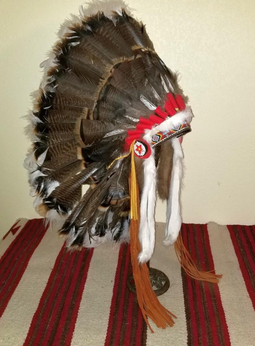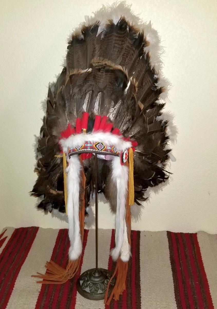 Beaded, with leather accents. Measures 27” tall and 19” wide at the back. Made for an adult.