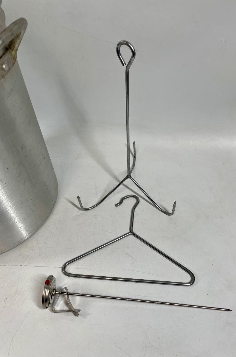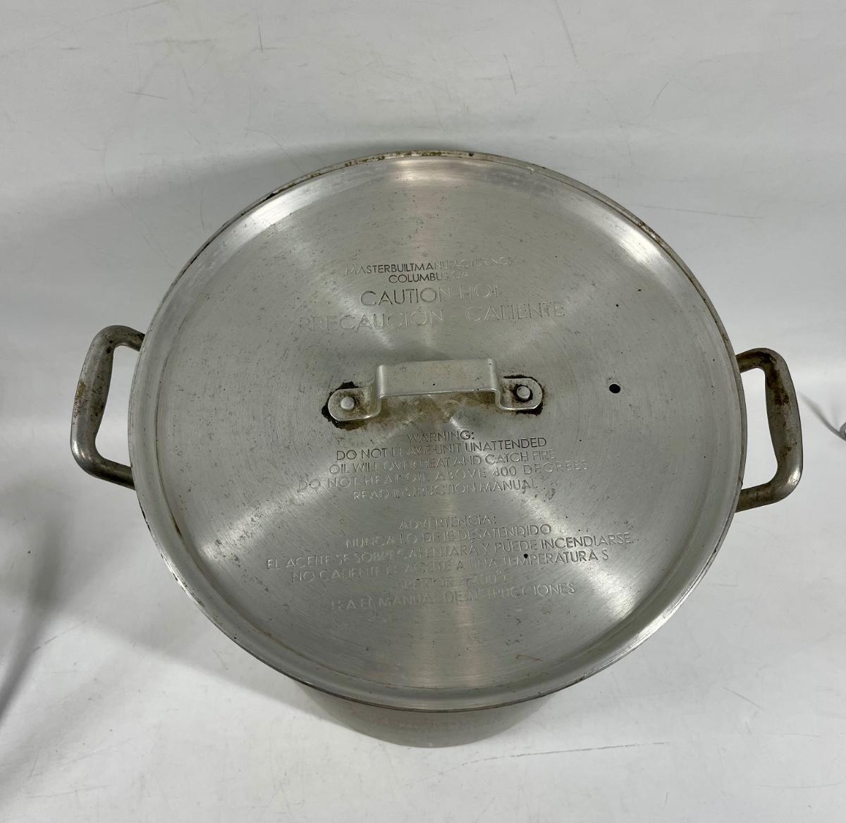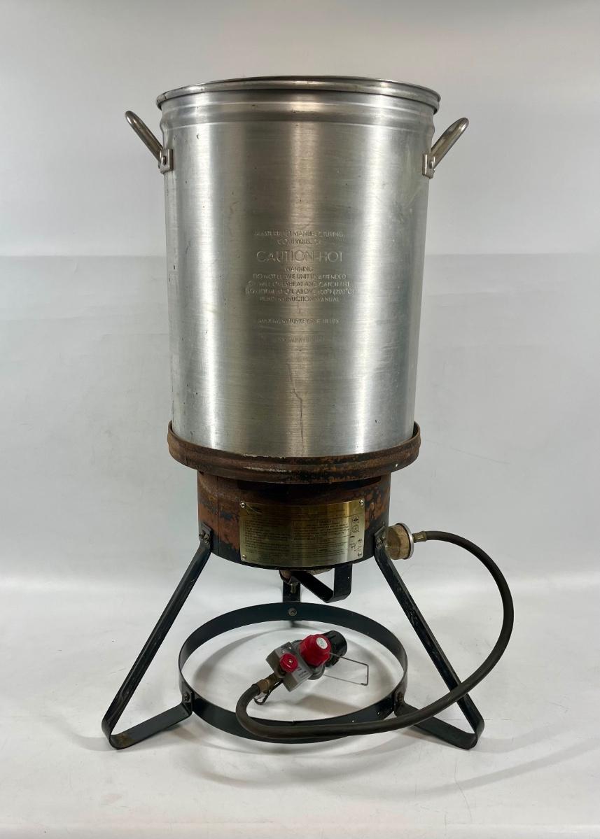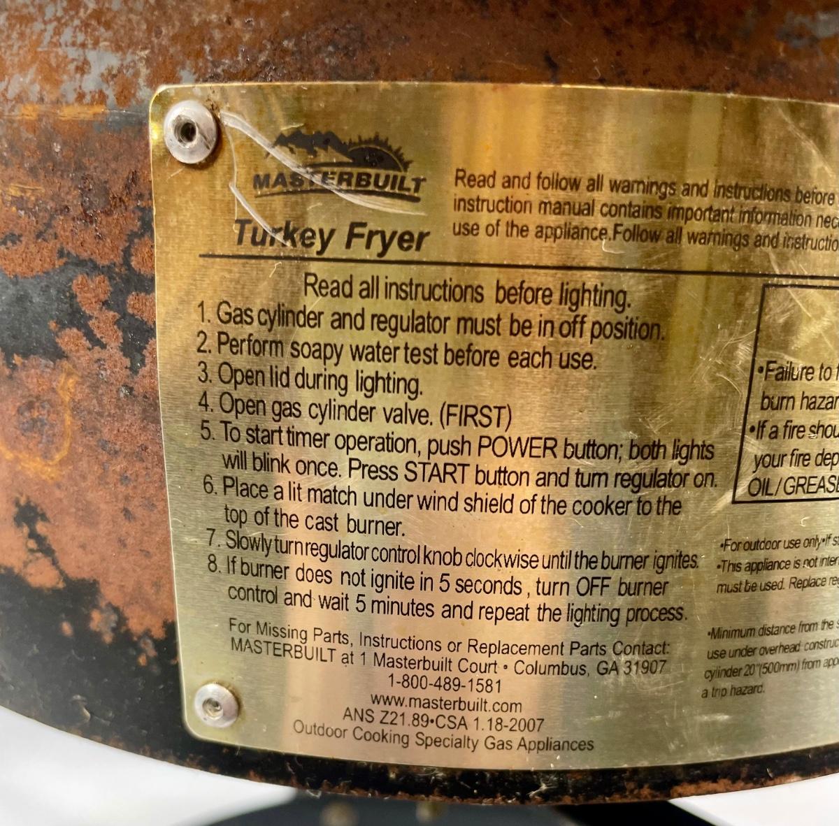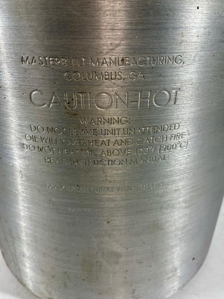 Masterbuilt propane powered turkey fryer. Model 20020107. Includes burner stand, tall aluminum fryer pot with lid, temperature probe, and turkey handling accessories. In solid used condition.