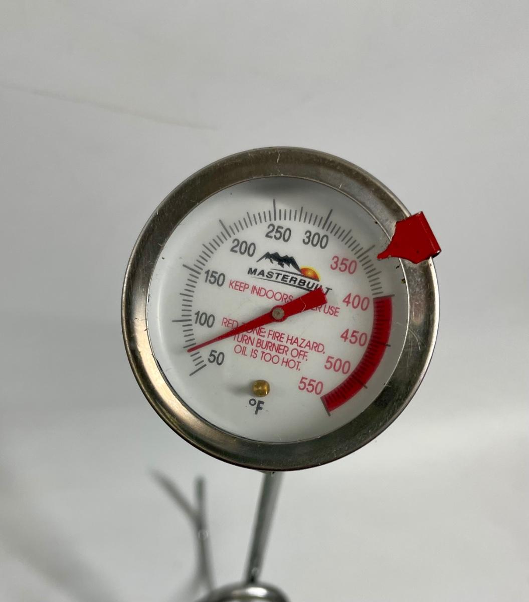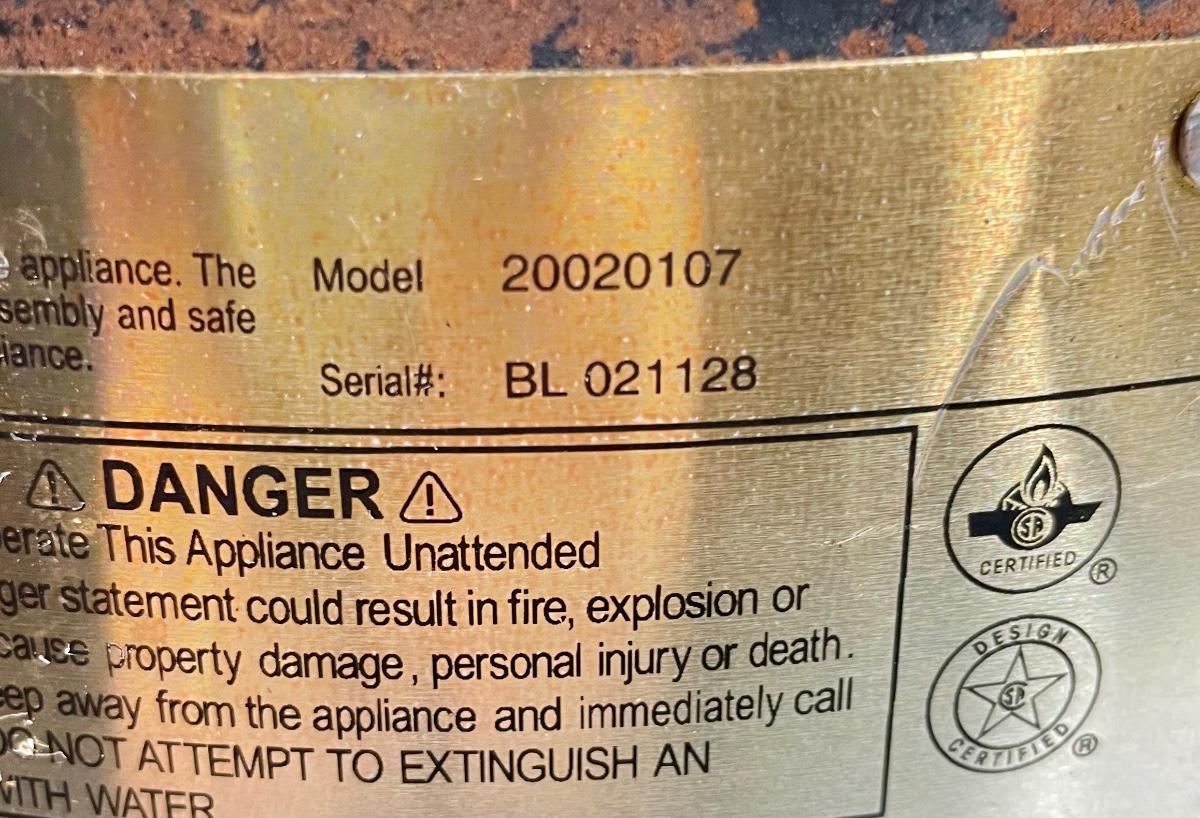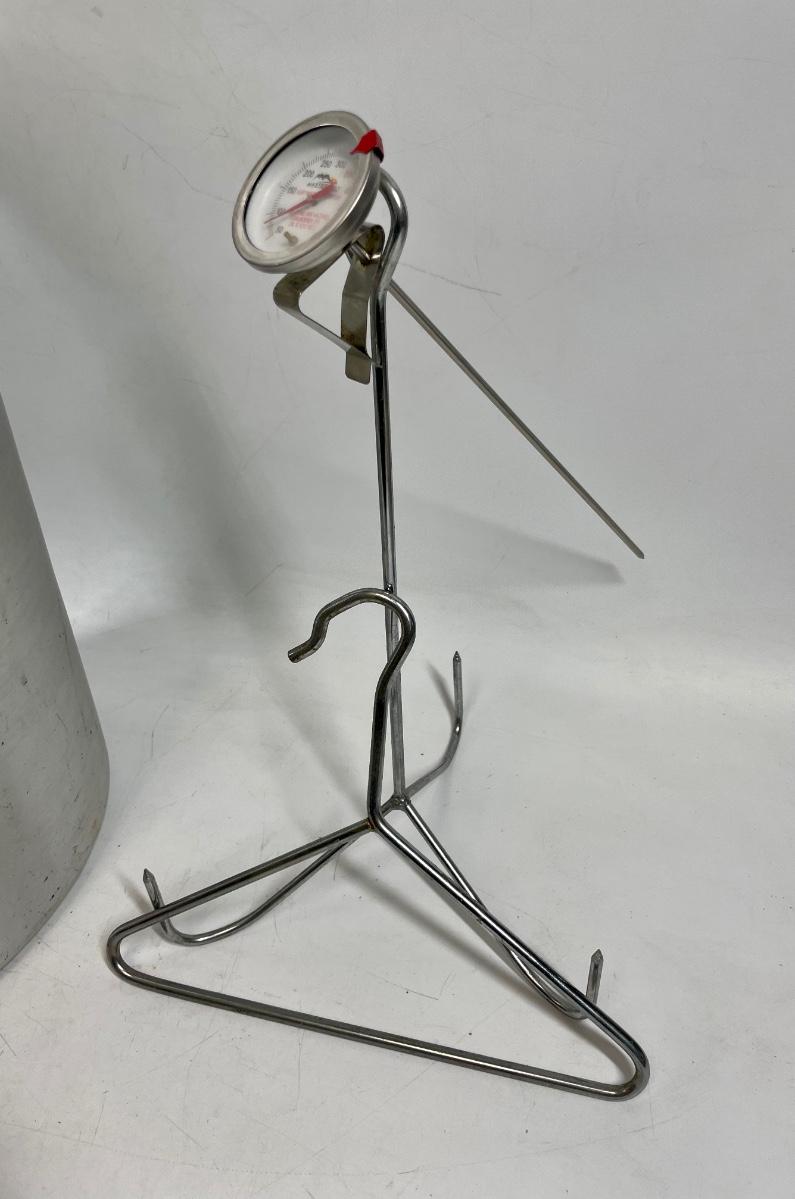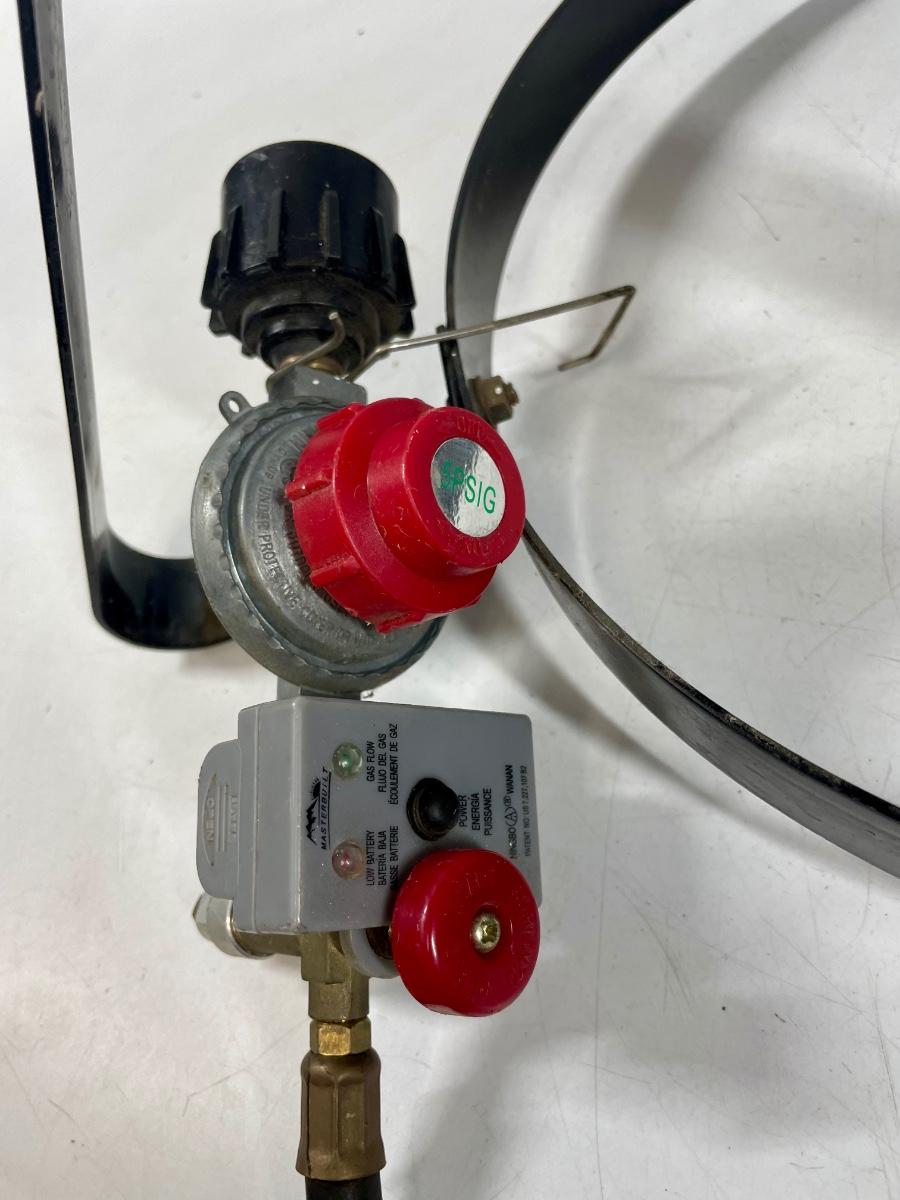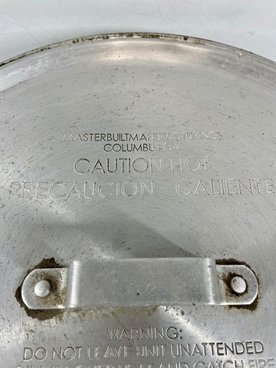 Masterbuilt propane powered turkey fryer. Model 20020107. Includes burner stand, tall aluminum fryer pot with lid, temperature probe, and turkey handling accessories. In solid used condition.