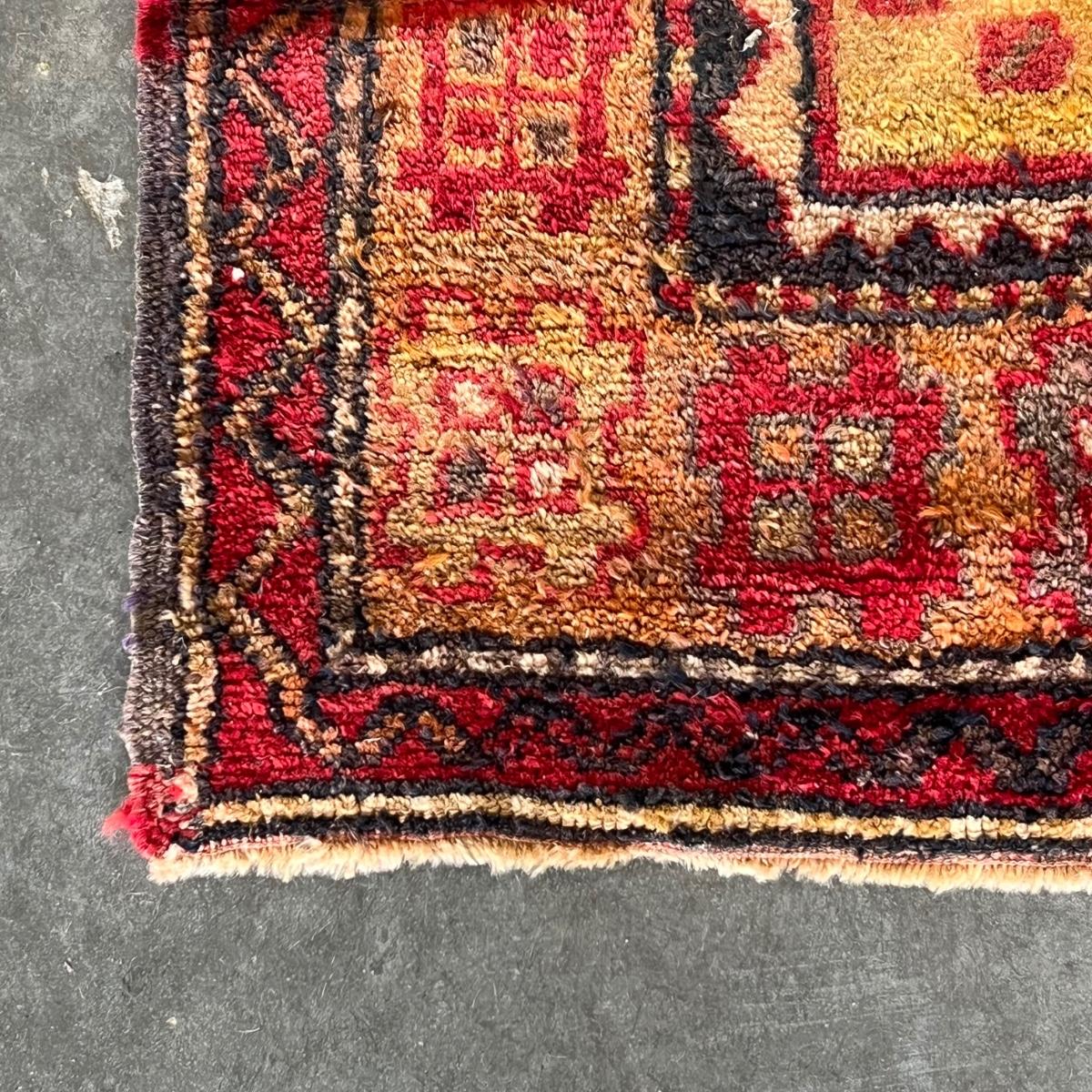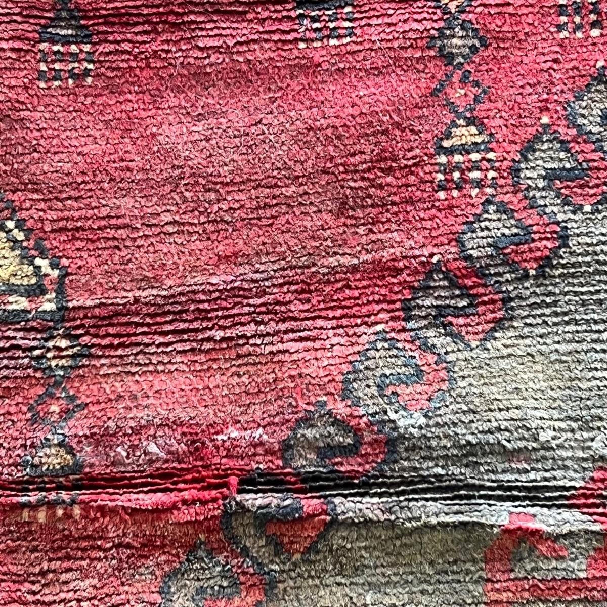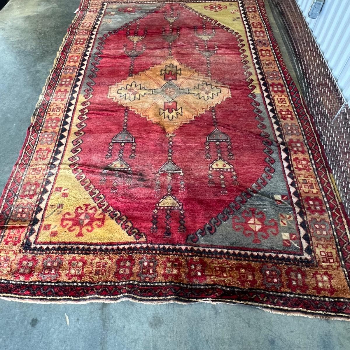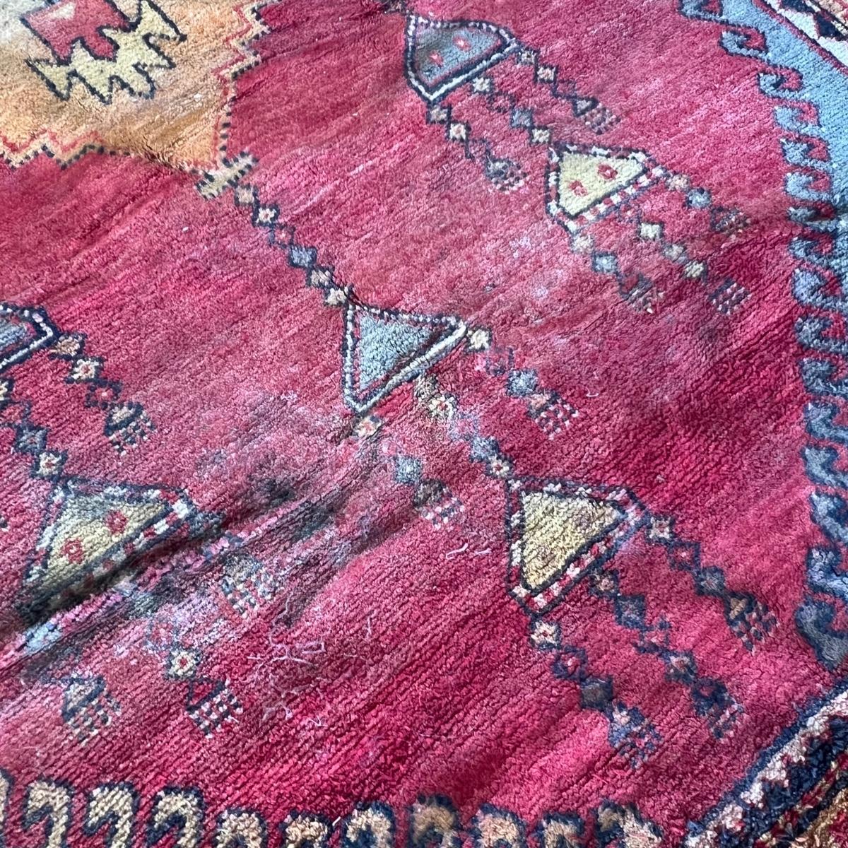 This fringeless Turkish wool rug is an attractive dark red. It will need a thorough cleaning as it has some mildew; photos show light grey smudges which are mildew spots. It does not come with any pad.