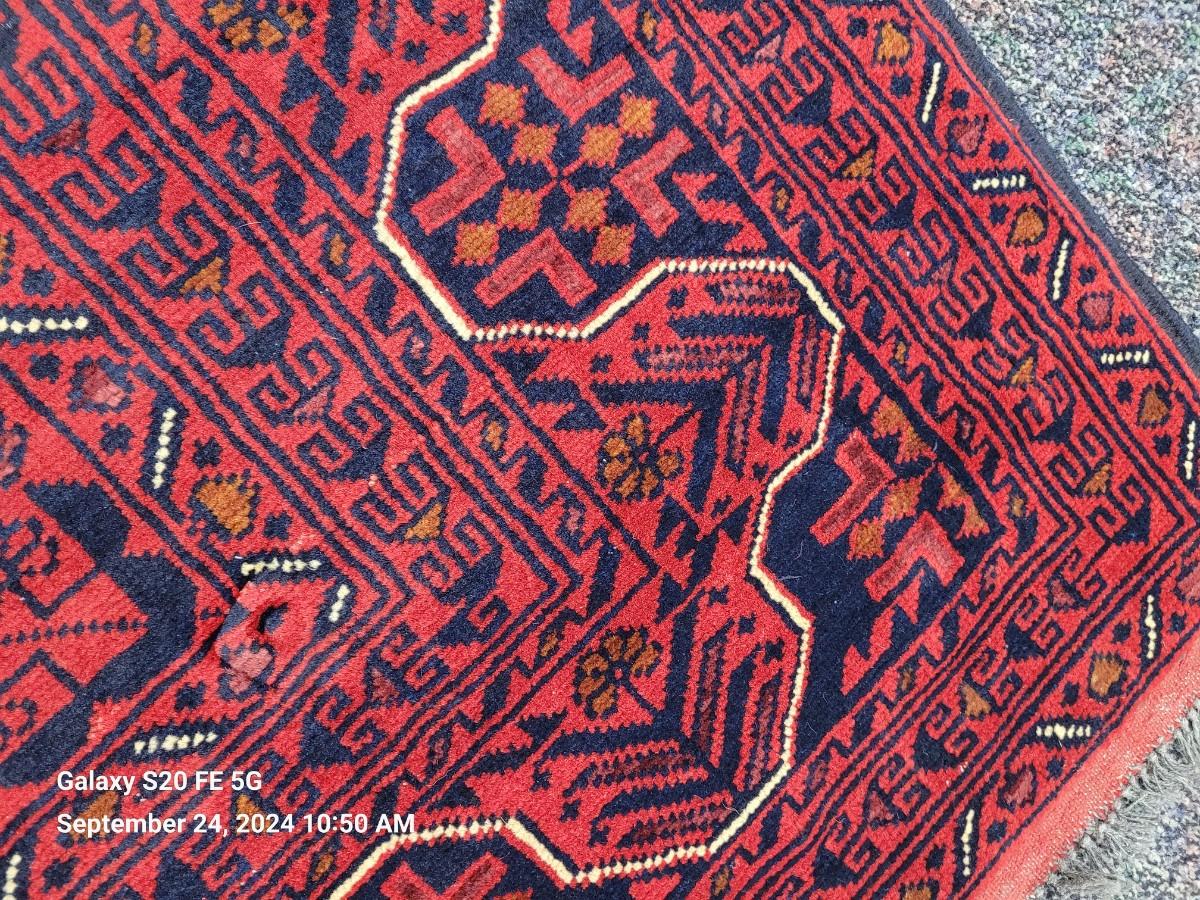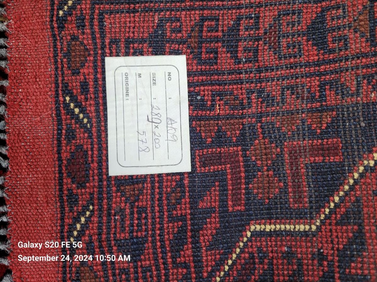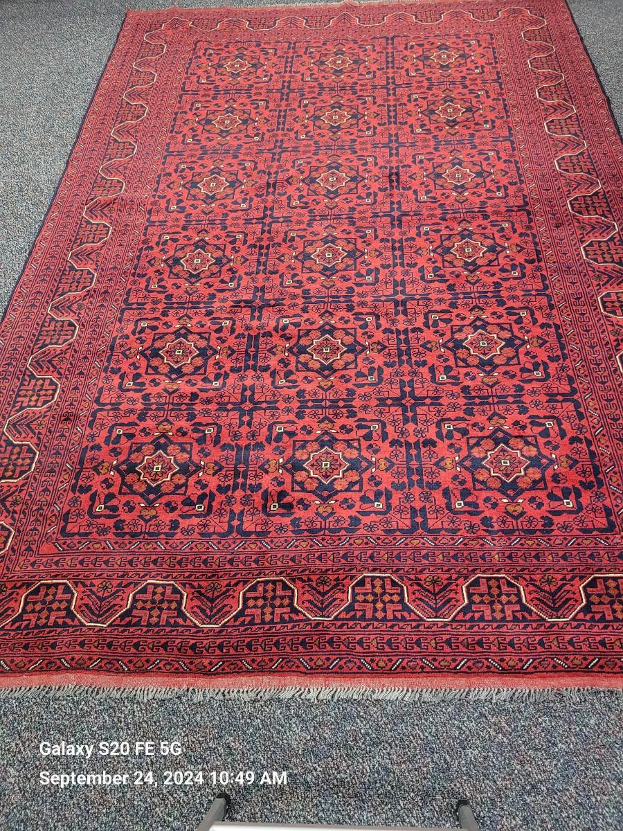 This is a very elegant rich wool rug, it has a beautiful sheen to it. 117 inches by 80 inches.