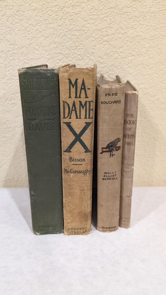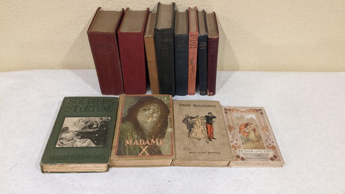 12 titles in varied condition. Some first edition, some are just neat turn of the century pieces. Includes Madame X, Son of the Gods, Soldiers of Fortune with a rare cover, Riley Love Lyrics with pictures. and more! Please note books with wear in photos.