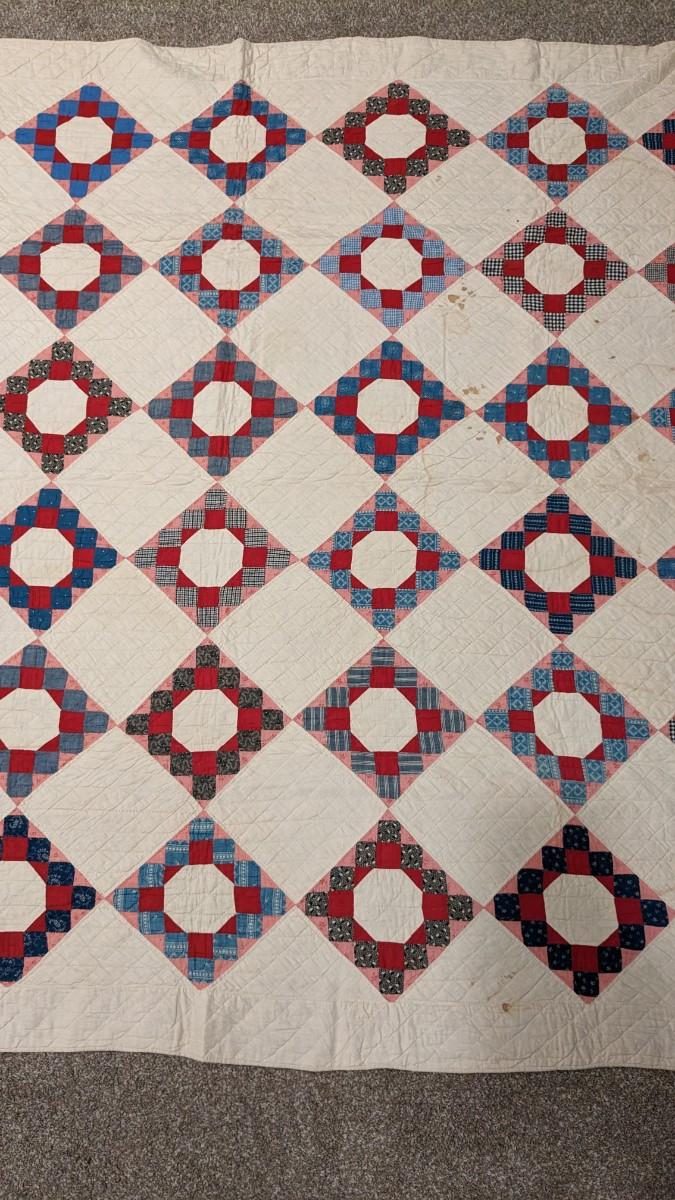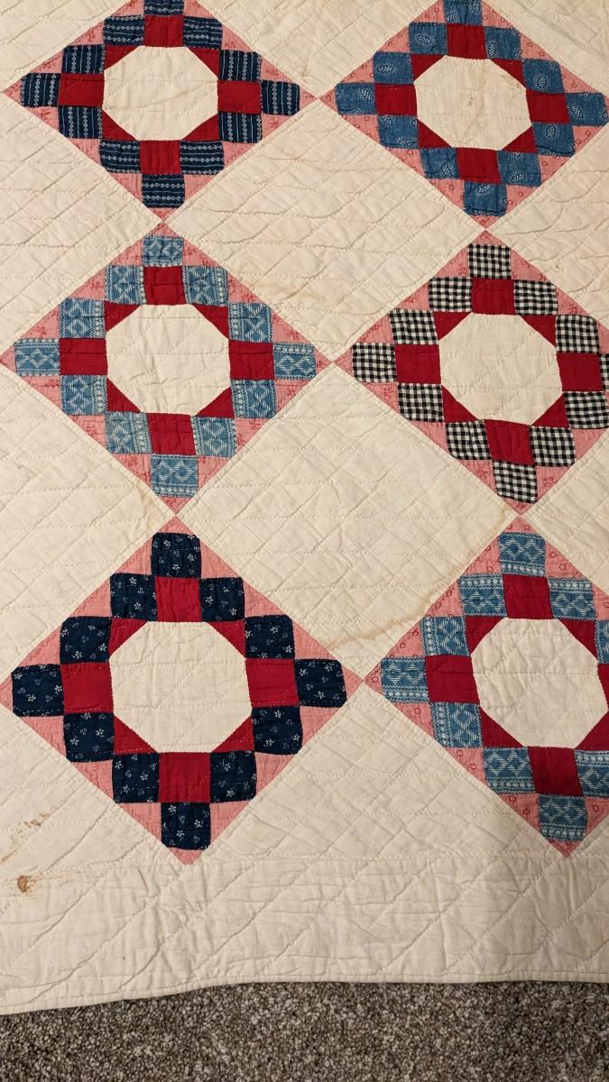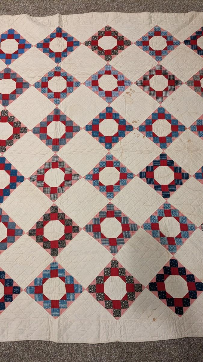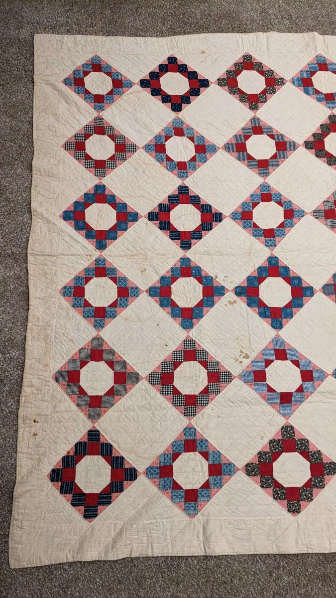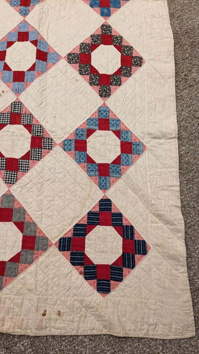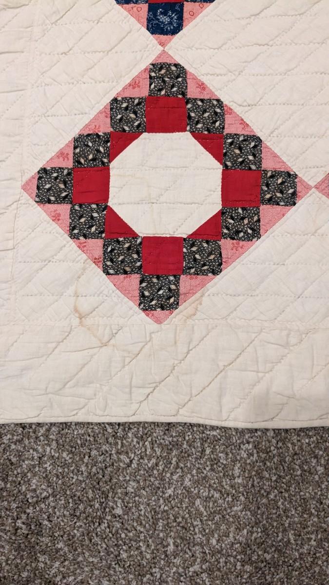 83.25"x68.5". Very early pink square quilt. No holes or tears detected but significant spotting and discoloration is present. Another stunning early example of this time honored craft. Note, bag is marked that it was made in 1898