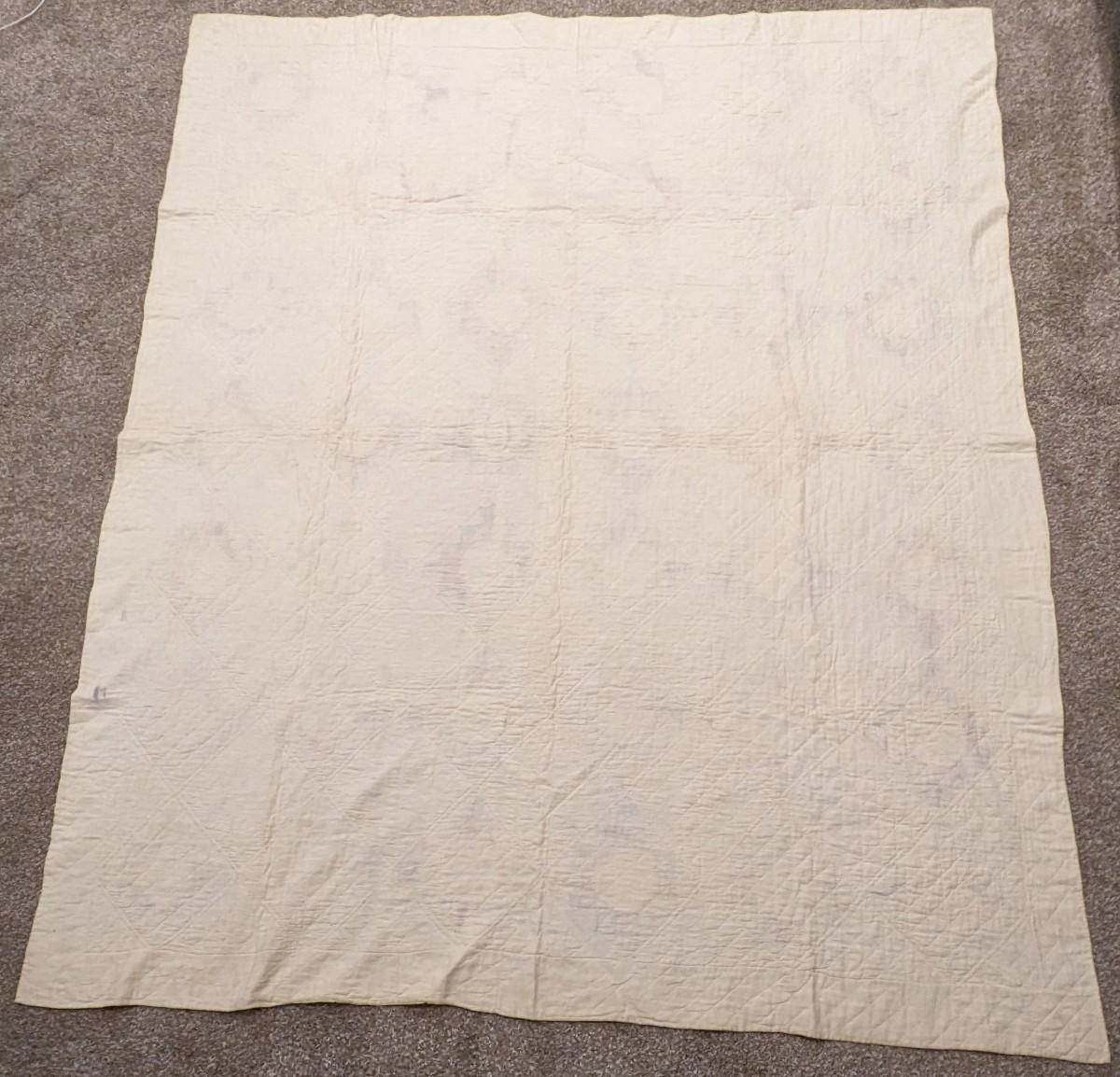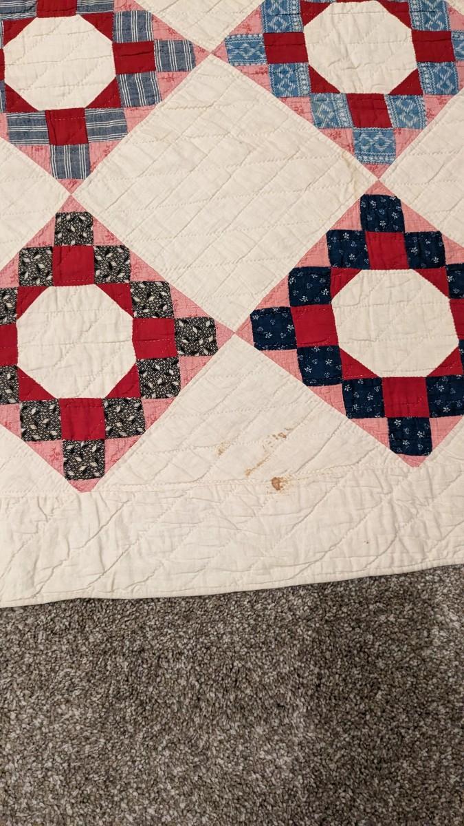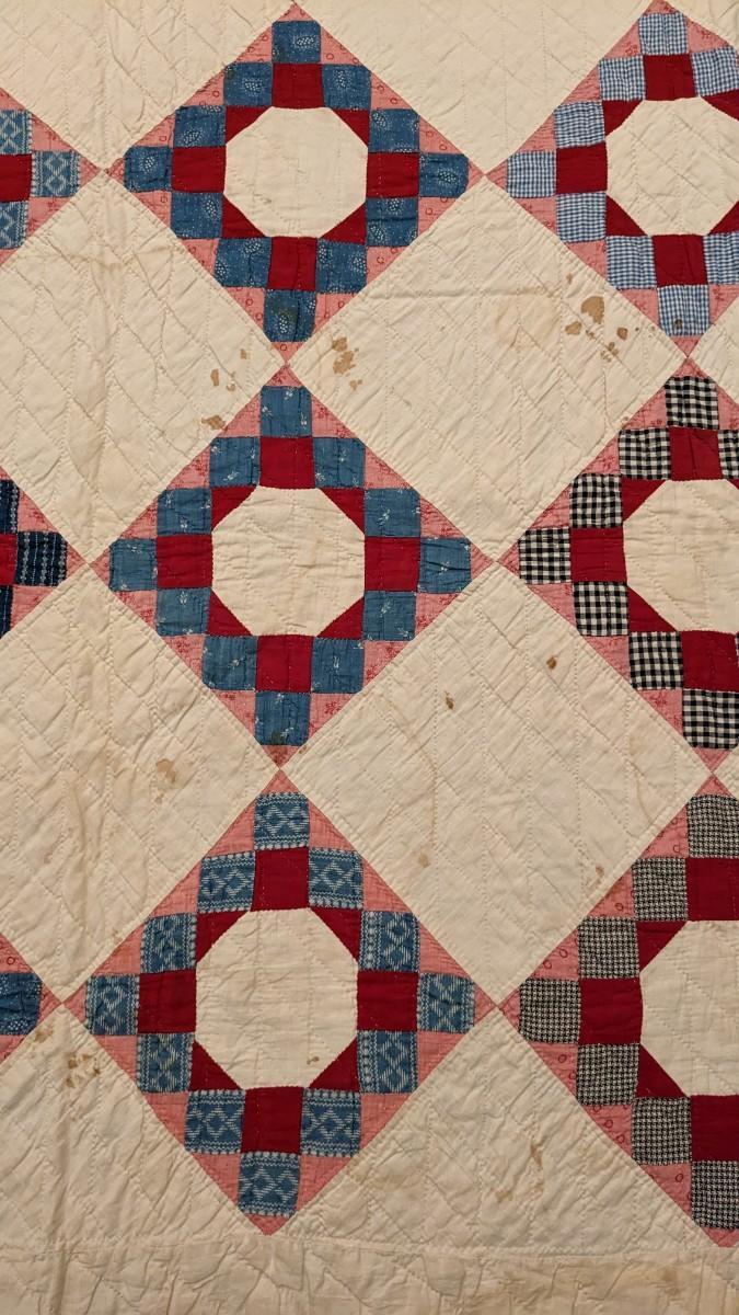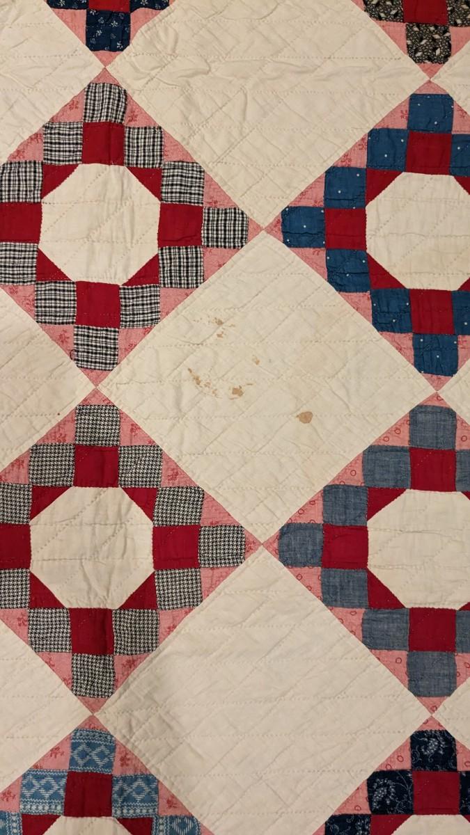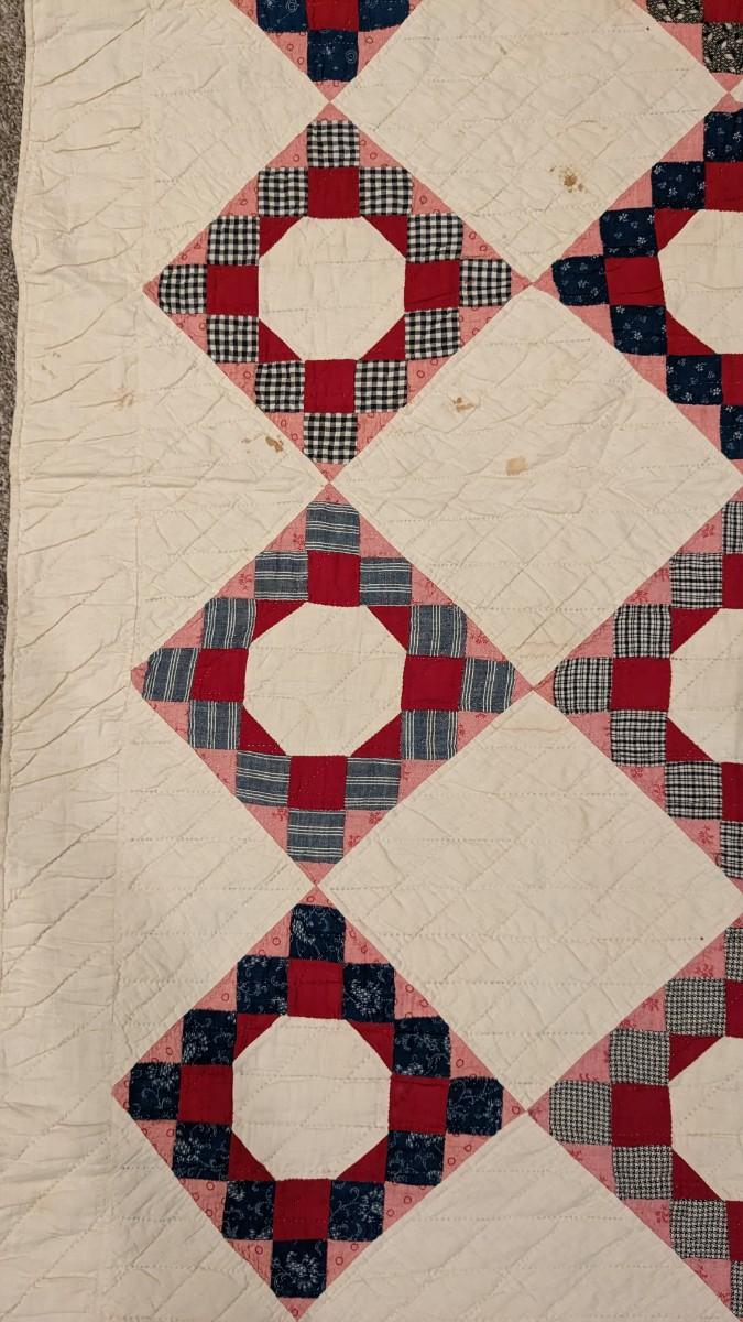 83.25"x68.5". Very early pink square quilt. No holes or tears detected but significant spotting and discoloration is present. Another stunning early example of this time honored craft. Note, bag is marked that it was made in 1898