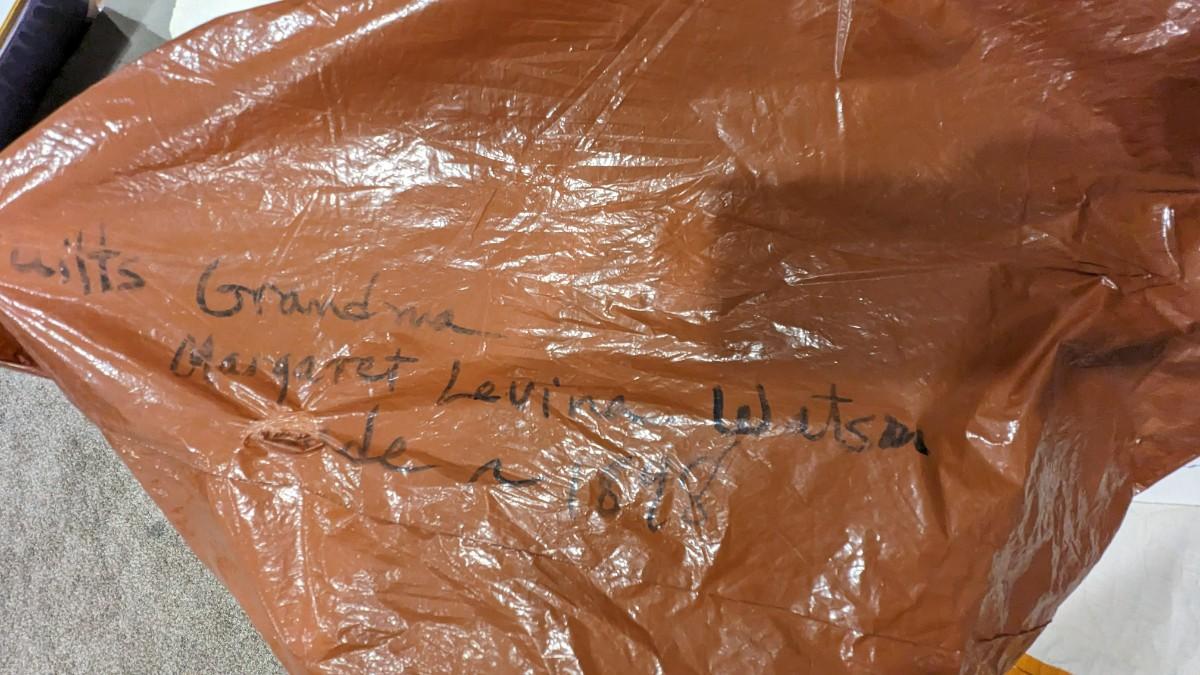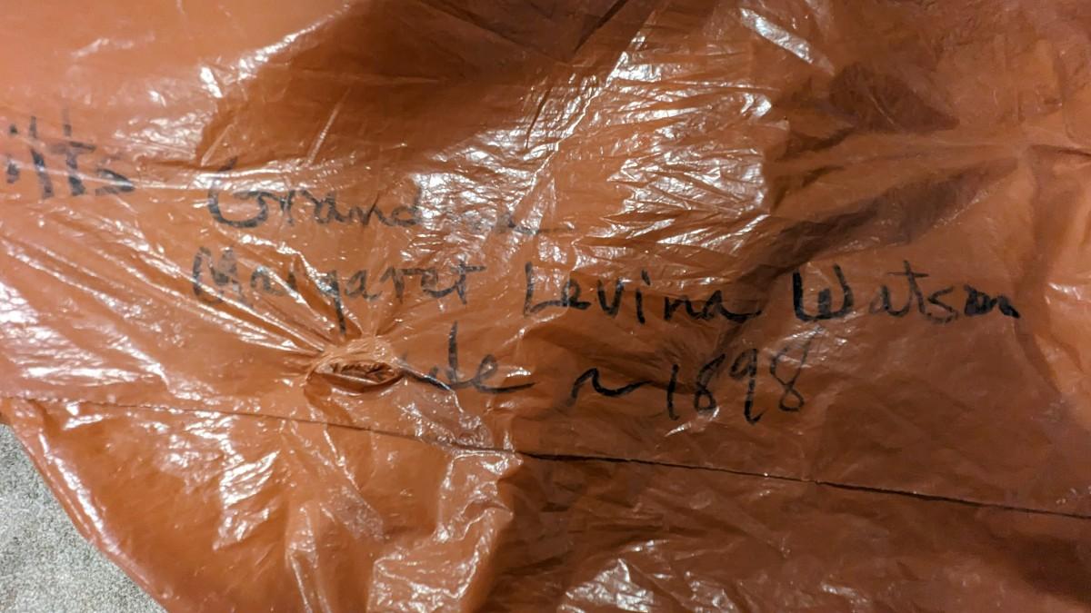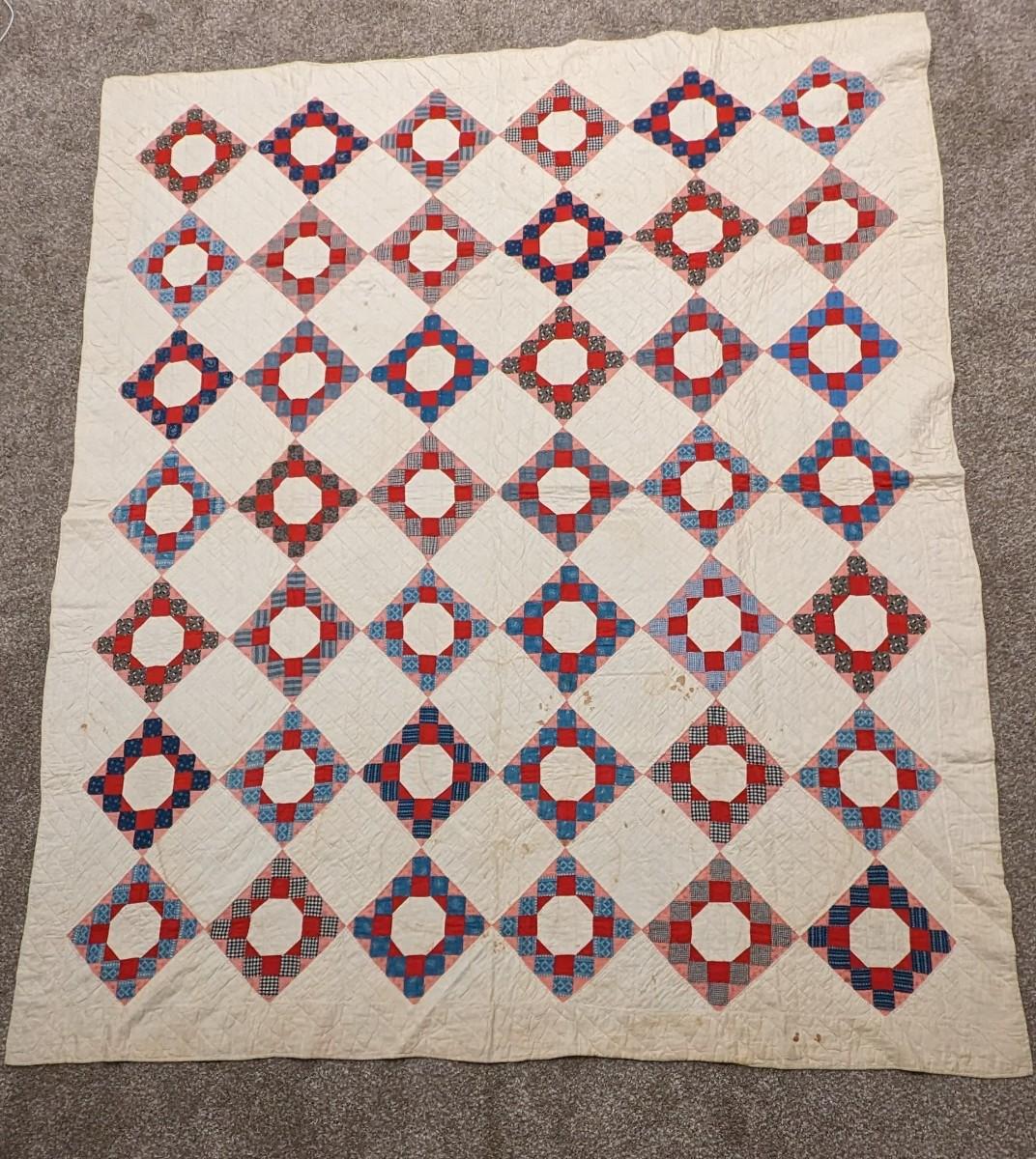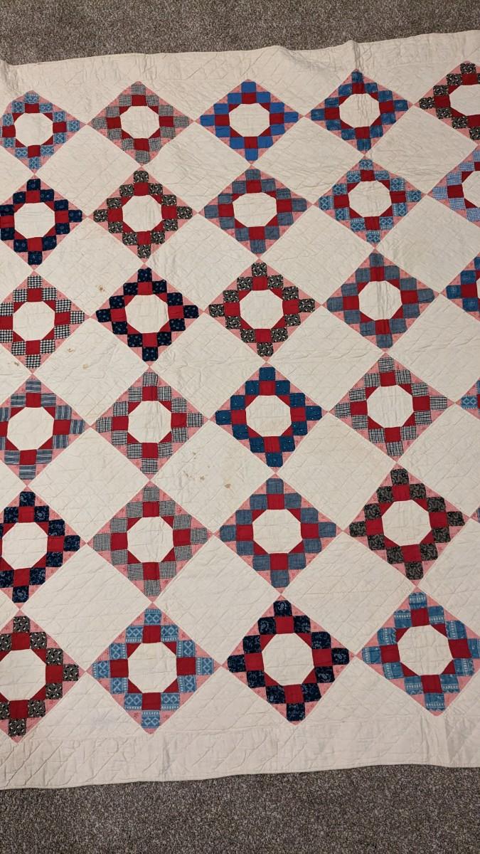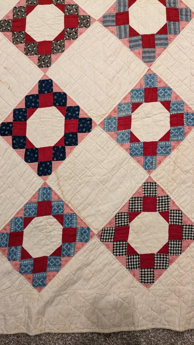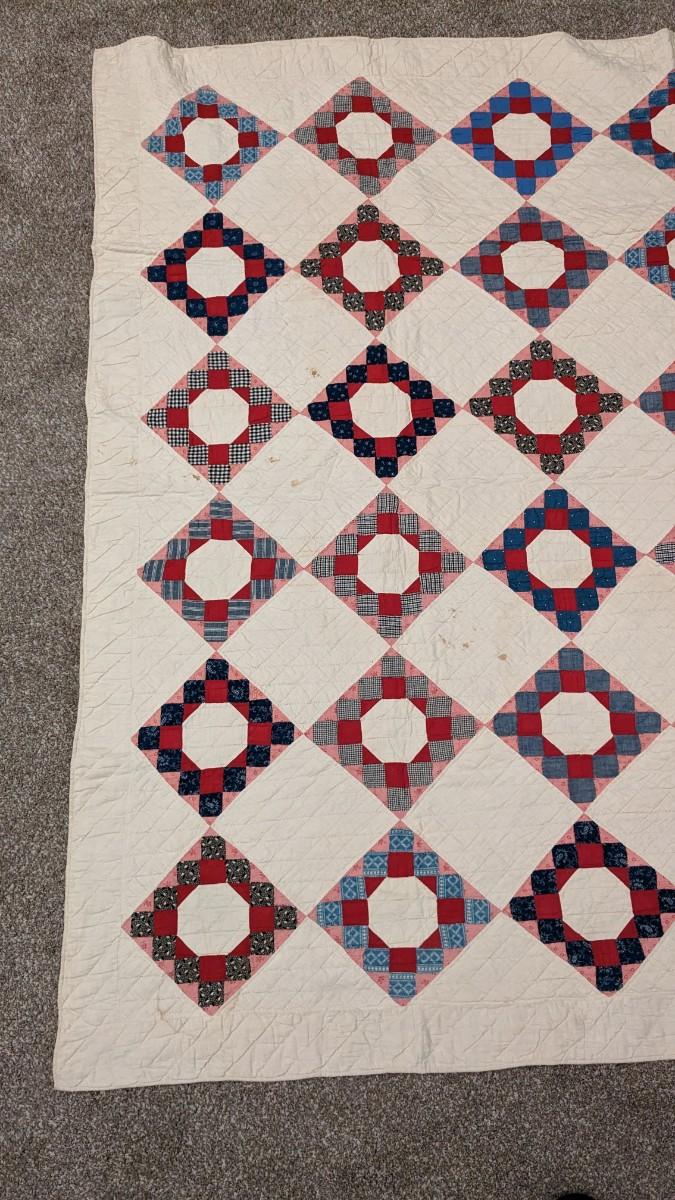 83.25"x68.5". Very early pink square quilt. No holes or tears detected but significant spotting and discoloration is present. Another stunning early example of this time honored craft. Note, bag is marked that it was made in 1898