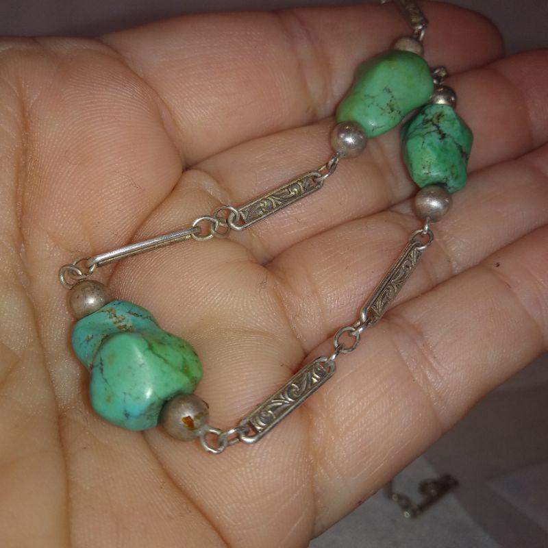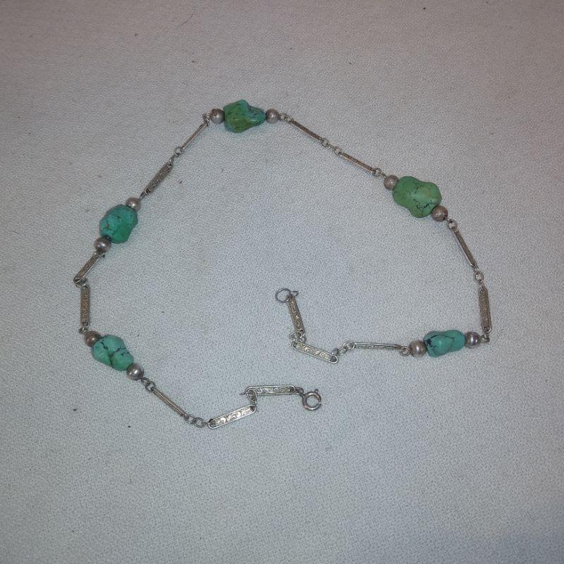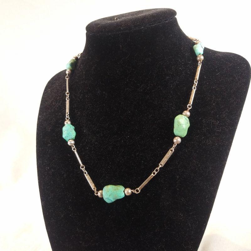 This very nice raw cut Turquoise and Sterling Silver Necklace measures 16-inches long and is in very good condition. Looks to be from the 20's and was believed to have been brought back by his late Aunt from a sight-seeing tour of the Southwestern States. Starting Bid/Reserve is $20.