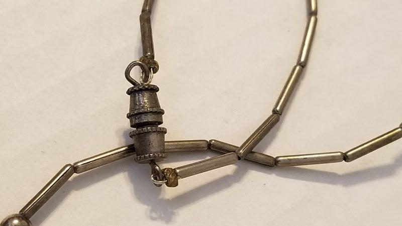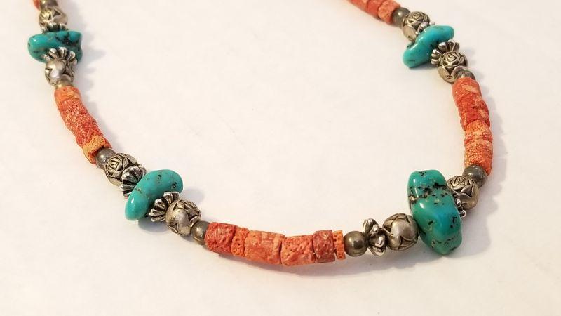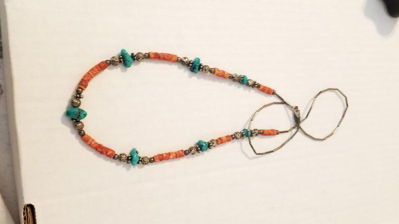 Vintage - Approx 24 inches long, Turquoise and coral with silver beads. It has a screw back fastener which seems to nit screw all the way, perhaps about half way. I do not want to put oil or break it but maybe you know a better way, or use the beads as parts?
