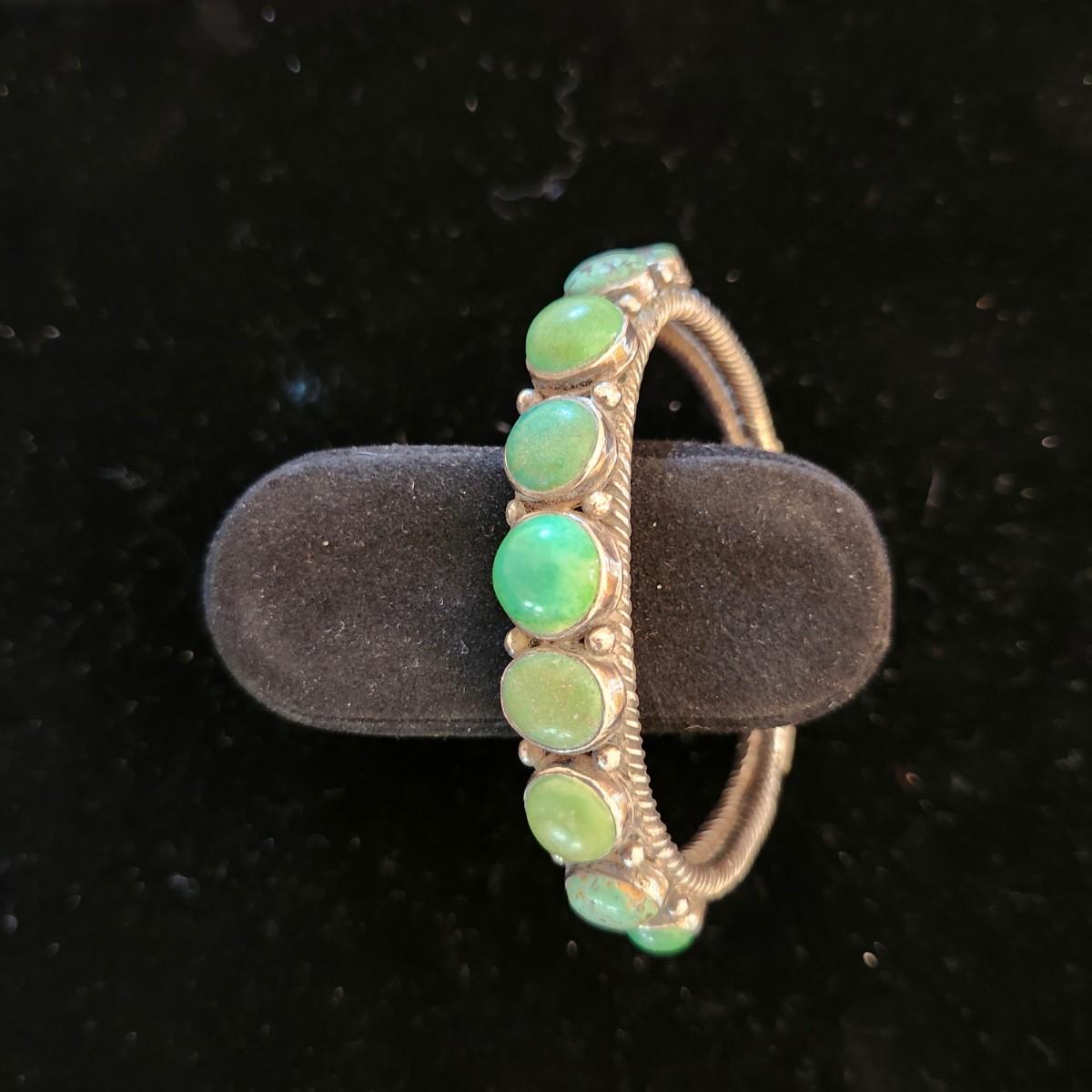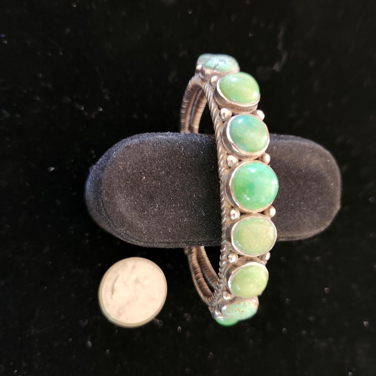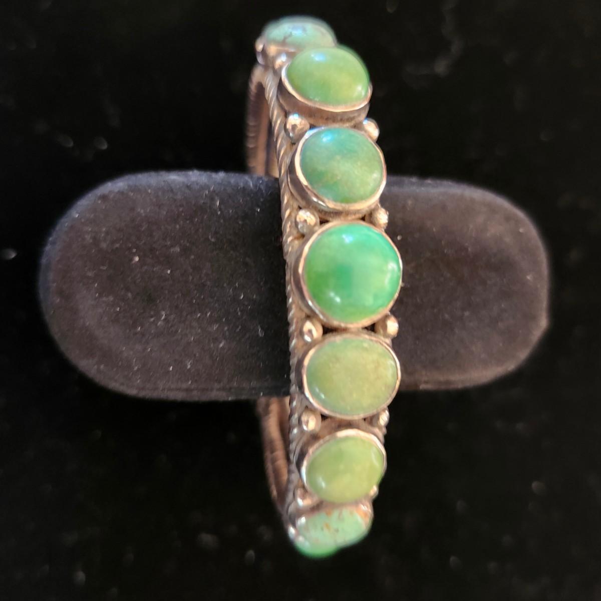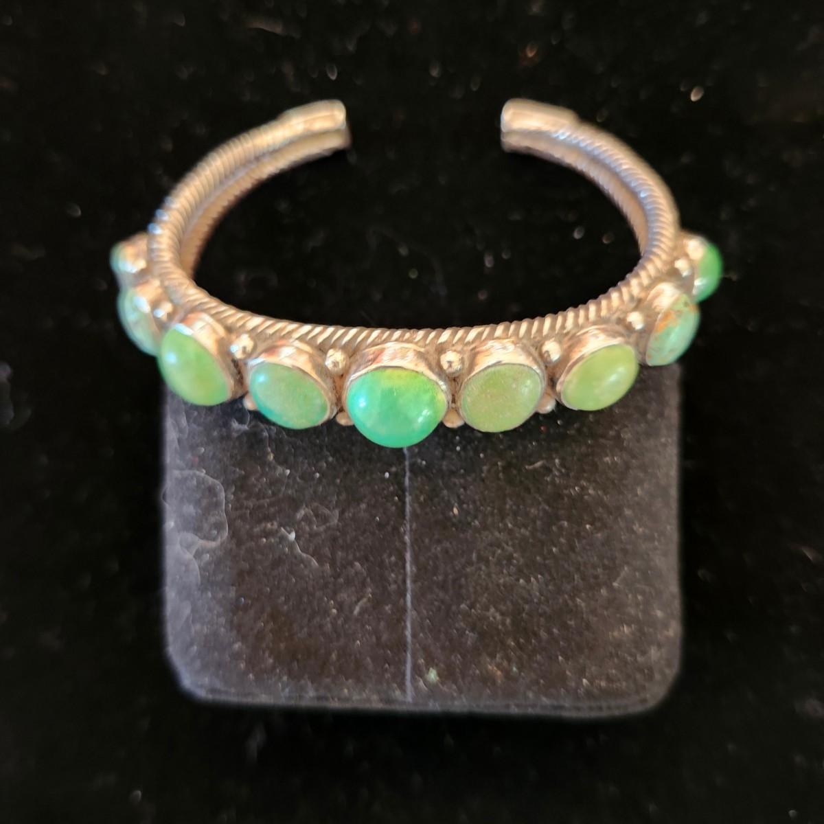 This is a beautiful bracelet with 3 or 4 colors of soft green turquoise stones. 9 stones total. No markings.