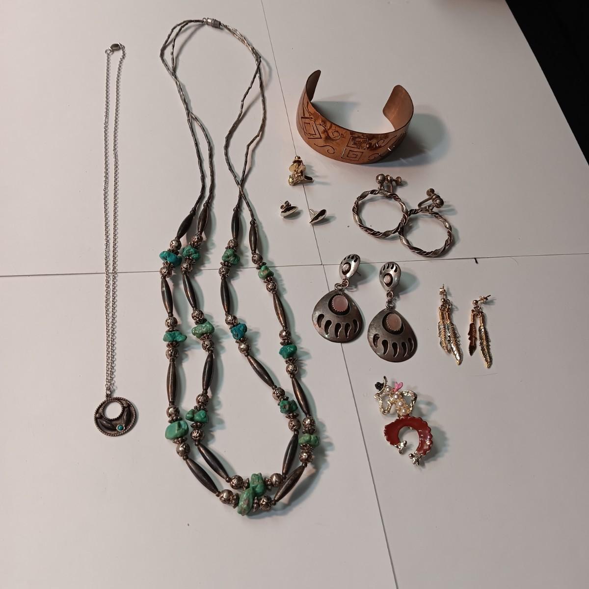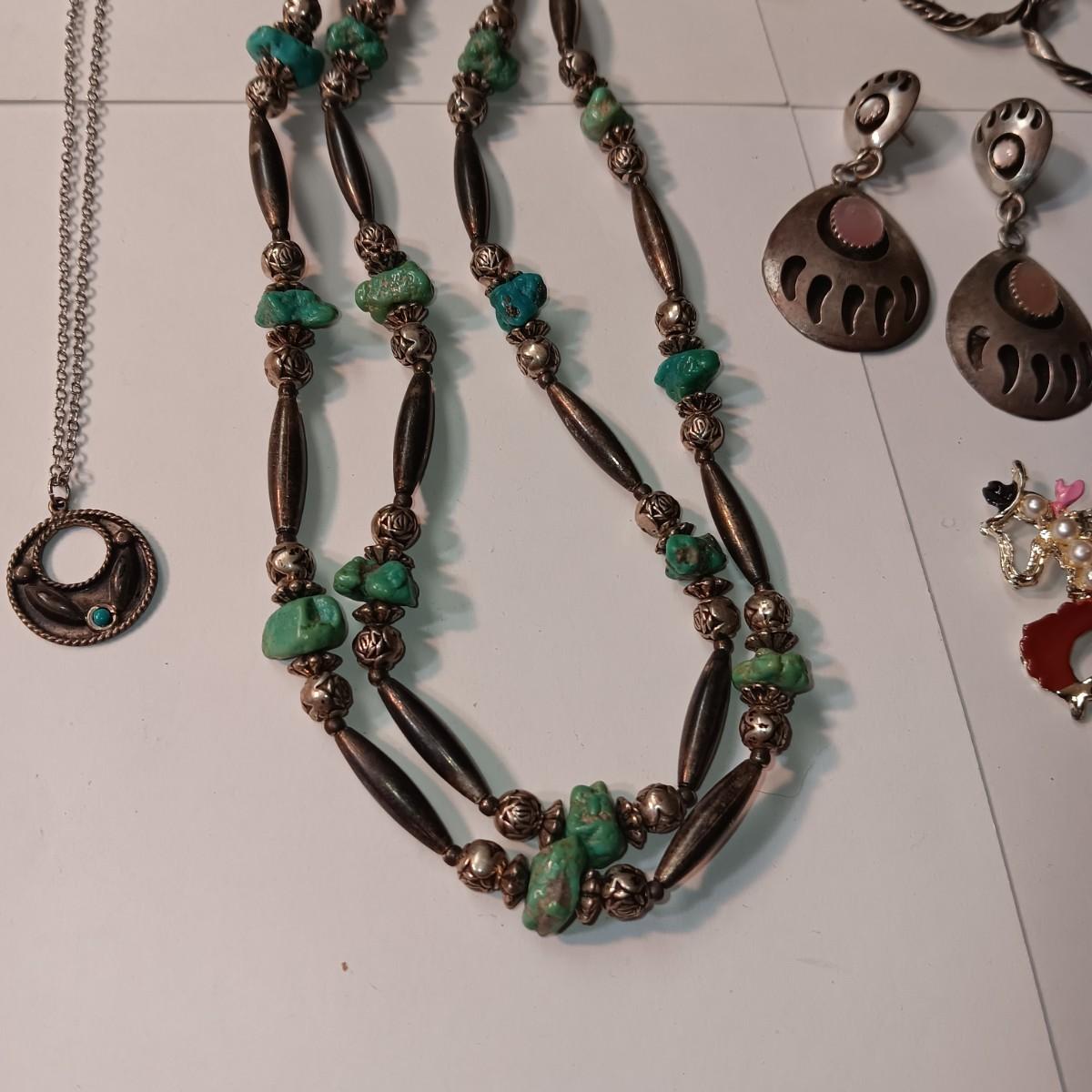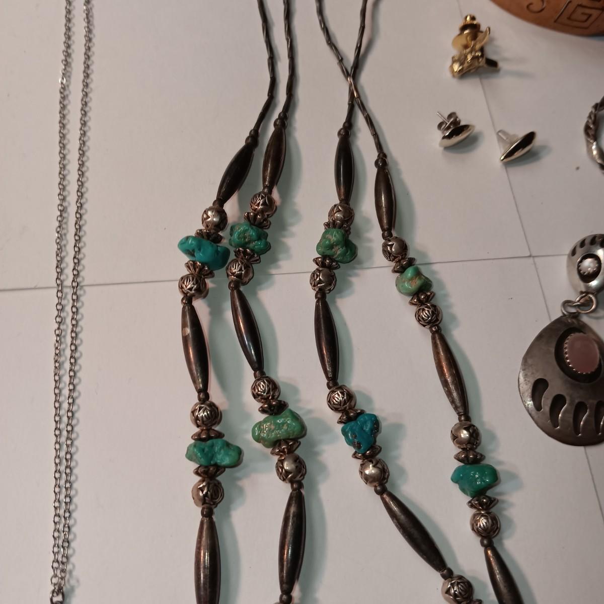 STERLING EARRINGS, TURQUOISE AND SILVER NECKLACE, EARRINGS, BRACELET AND WATCH