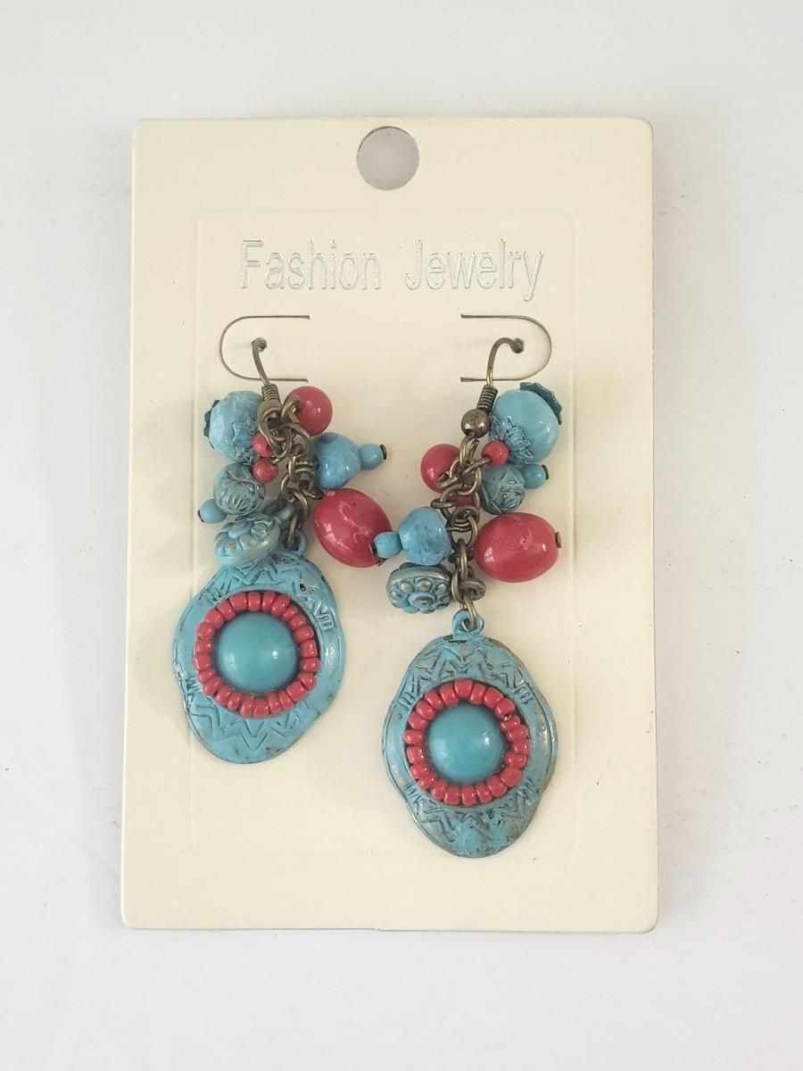 Dangling fashion earrings on original card featuring layered blue and coral tone beads with textured oval medallion drops. Each medallion has a raised central blue bead surrounded by small coral tone beads and etched decorative detailing. Clustered bead accents at the top add movement and dimension. Fishhook style ear wires. All details described strictly from visible features.