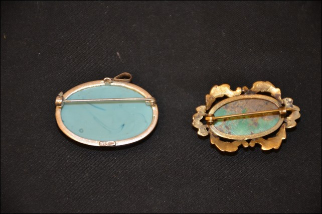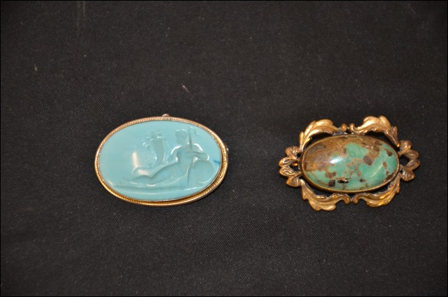 turquoise cameo pin with carved Greek scene and turquoise brooch with gold fill filigree