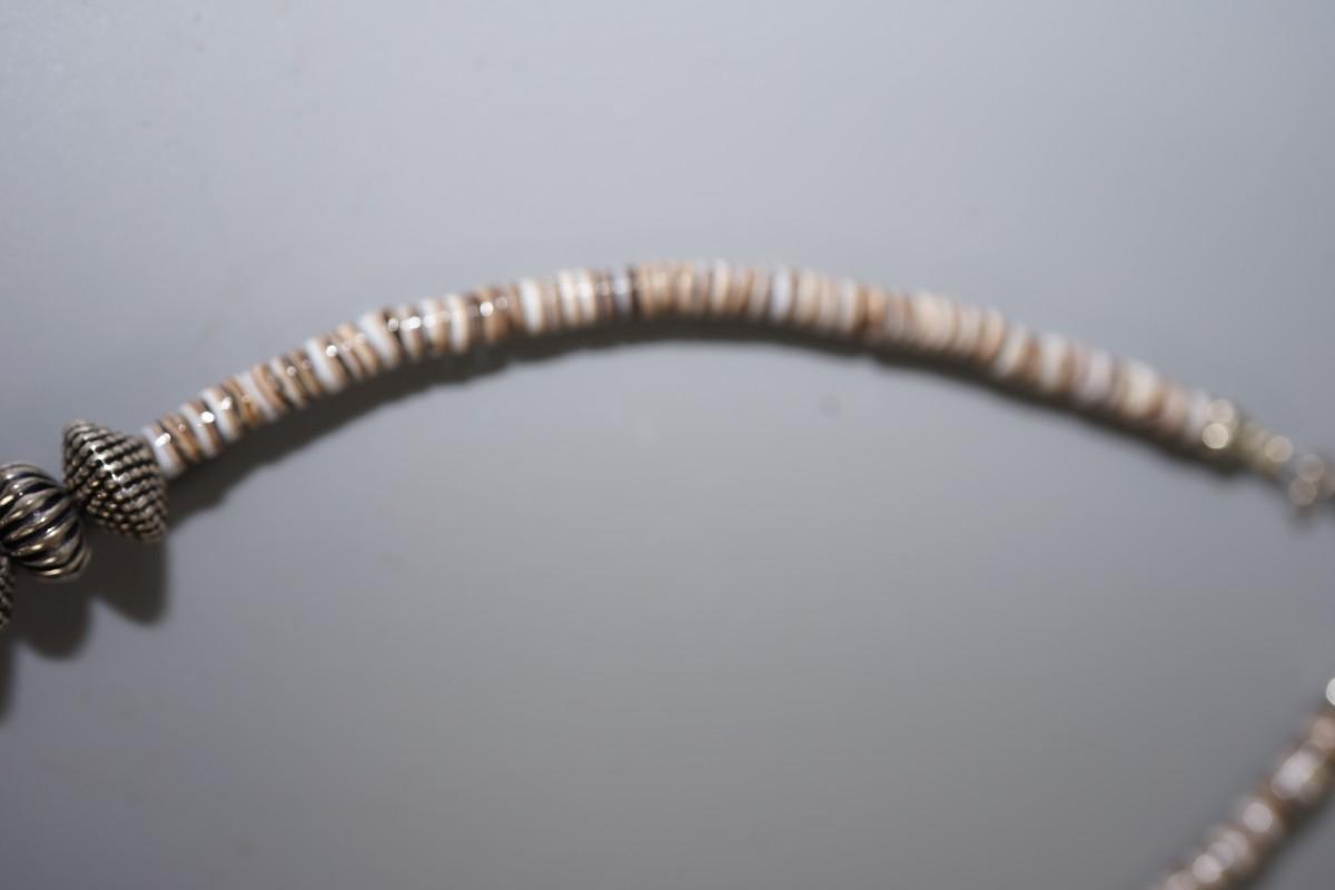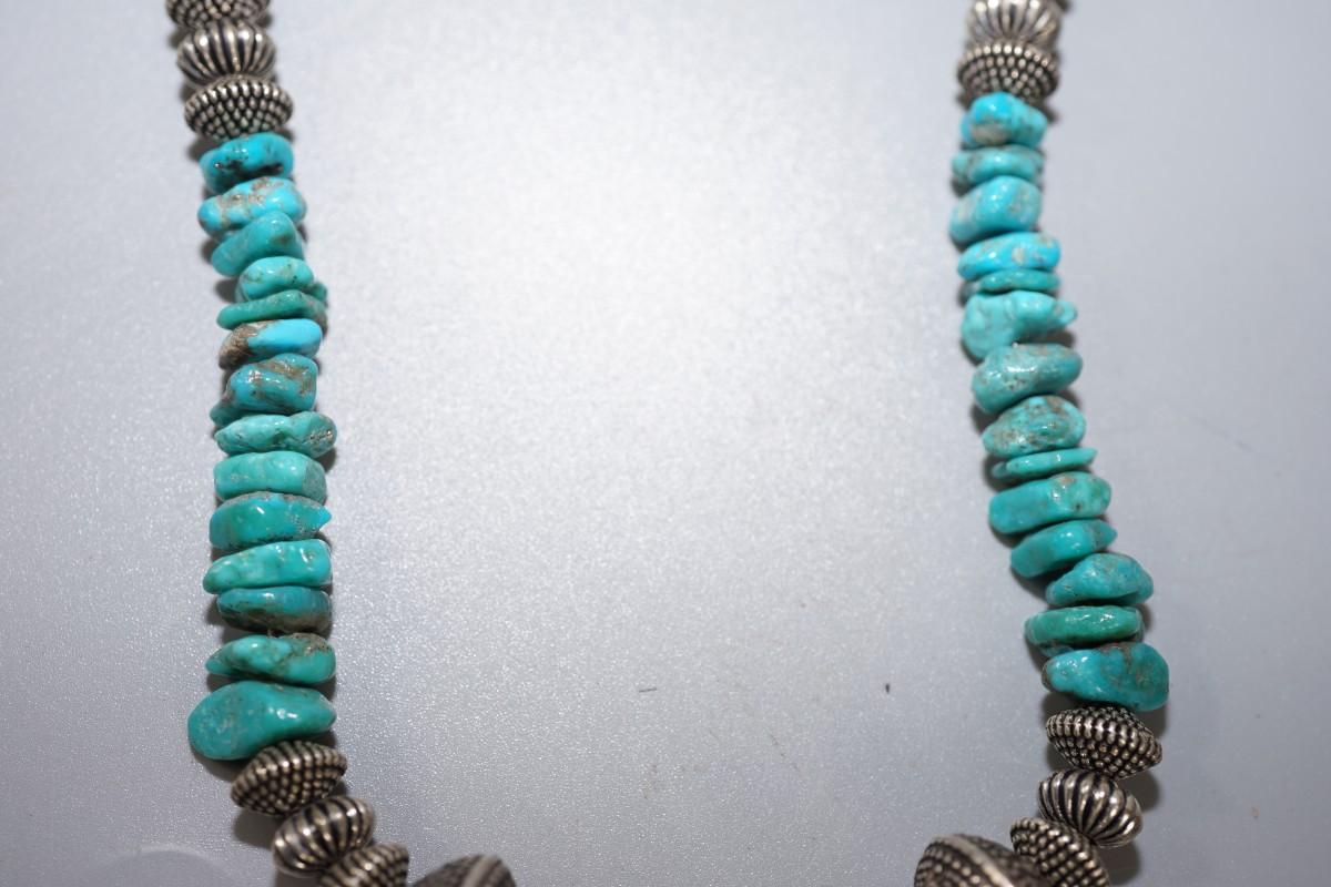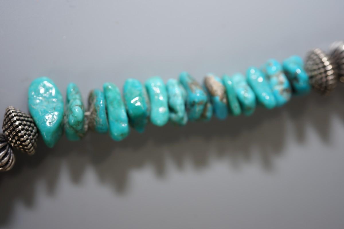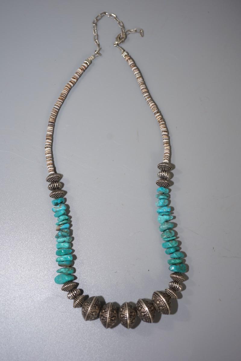 small chunks of turquoise. Clam shell heishi beads. and silver tone, not silver worked beads.