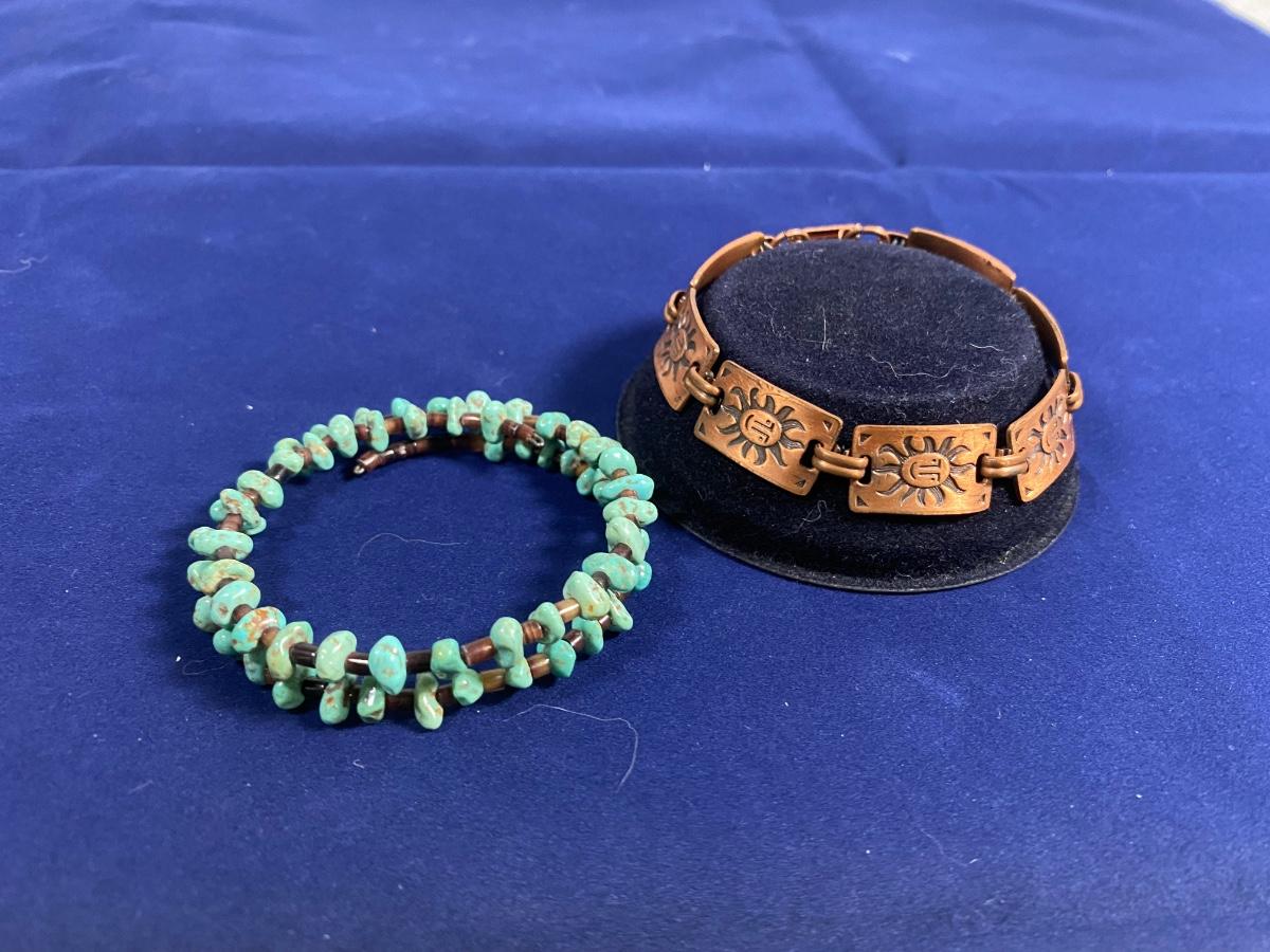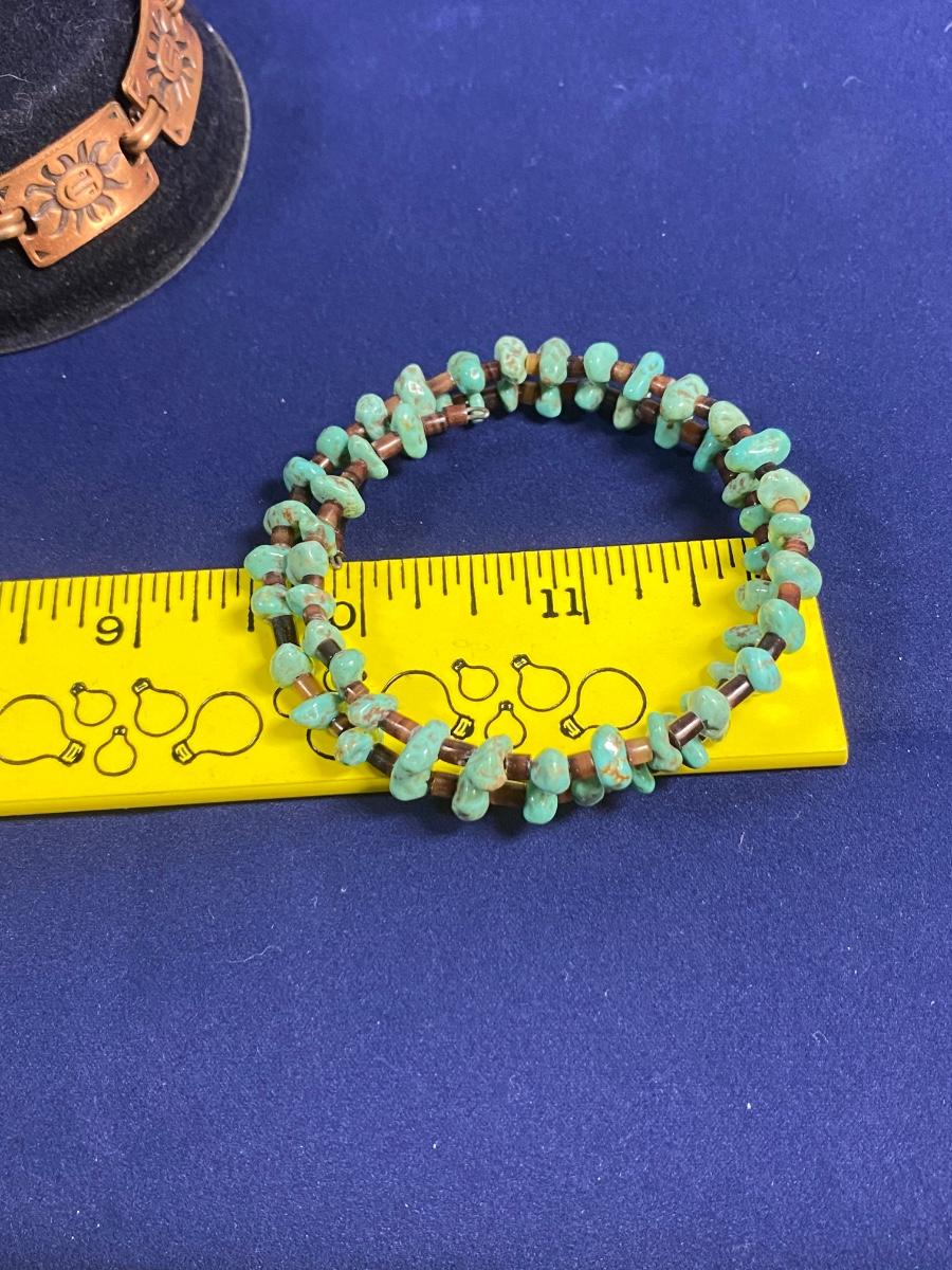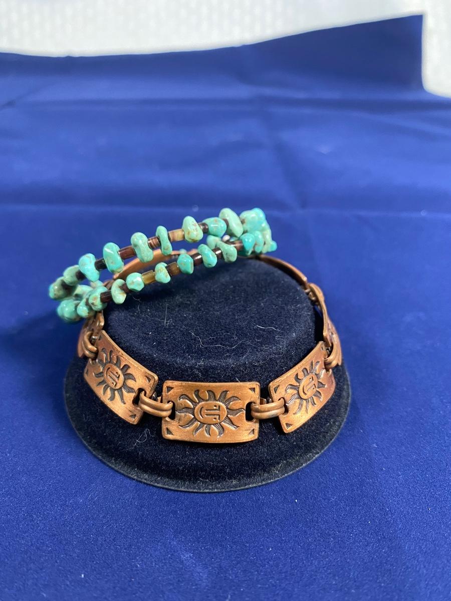 Turquoise Coil Bracelet & Copper Sun Stamped Link Bracelet. Good condition. Copper bracelet is about 7.5" length.