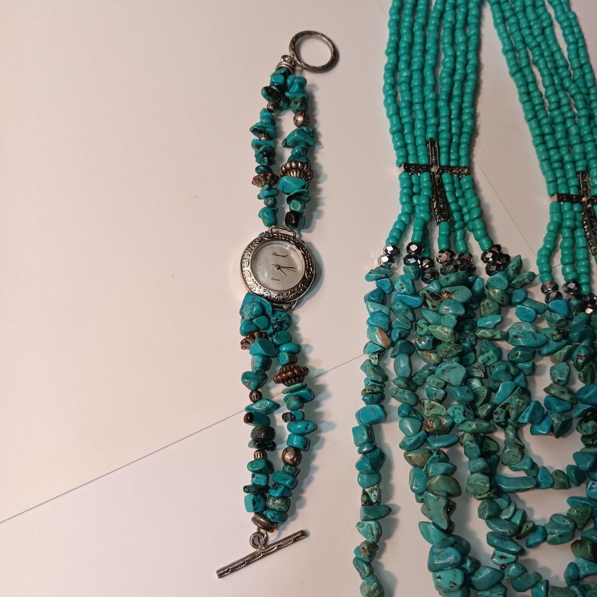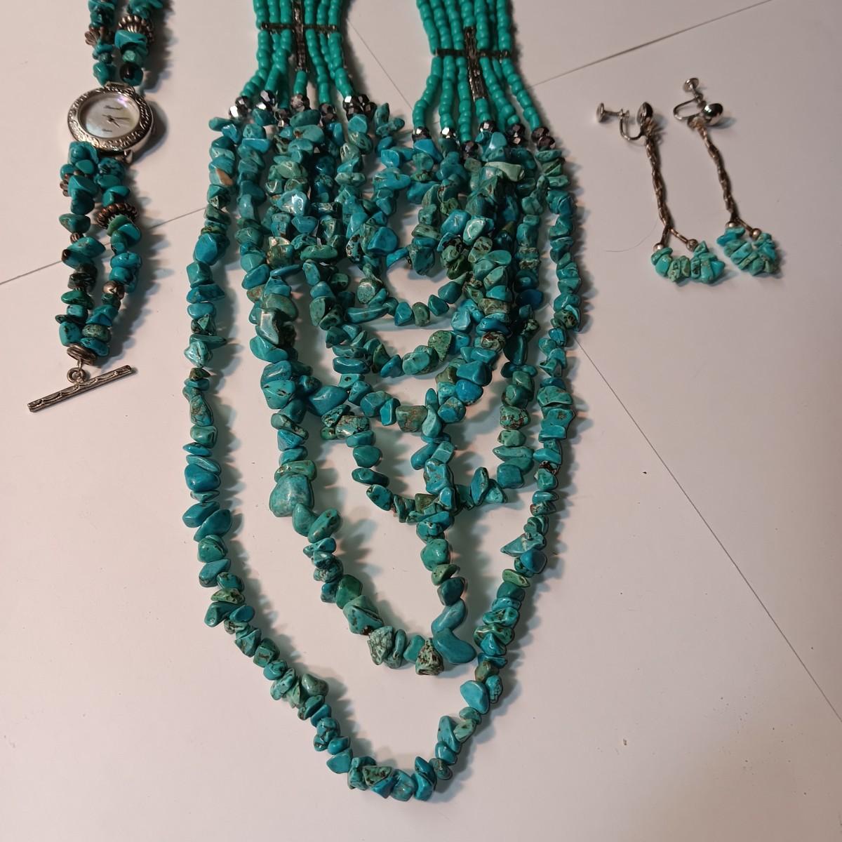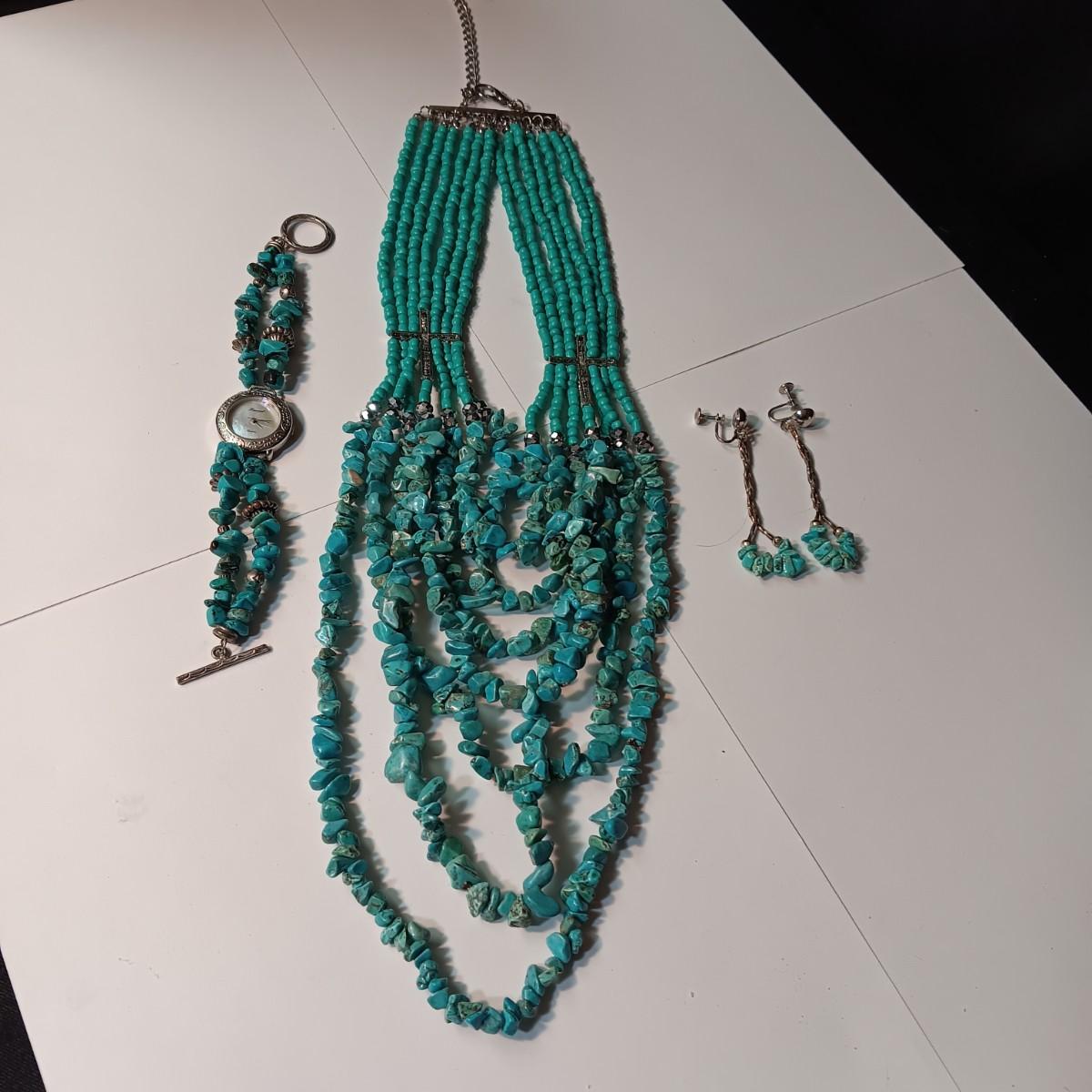 TURQUOISE COLORED BEADED NECKLACE, EARRINGS AND WATCH W/BAND