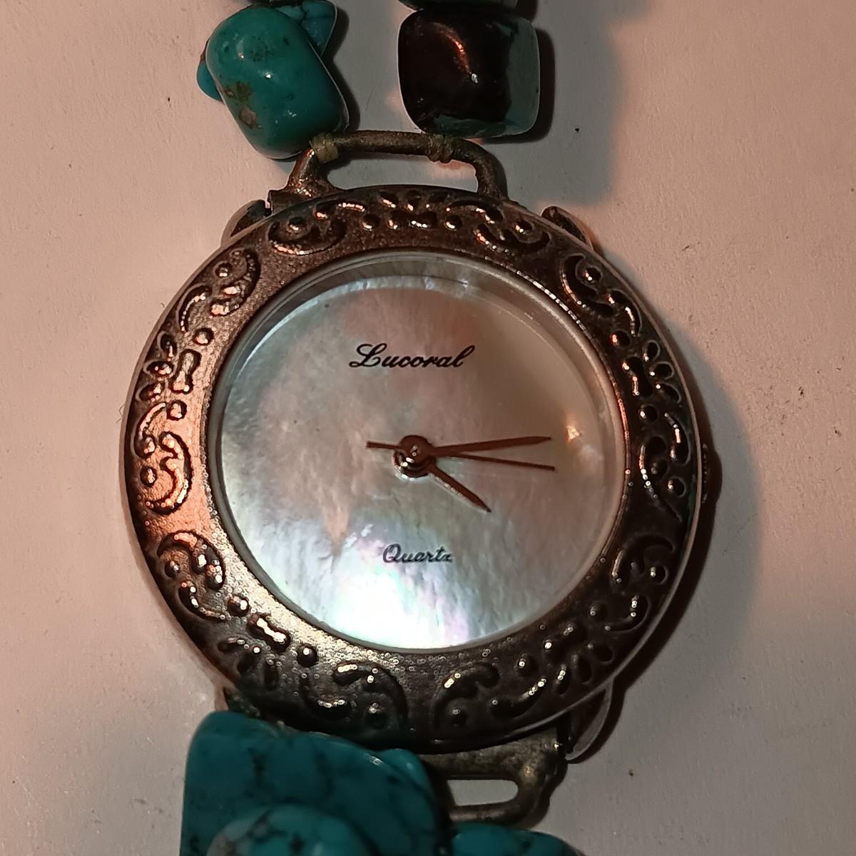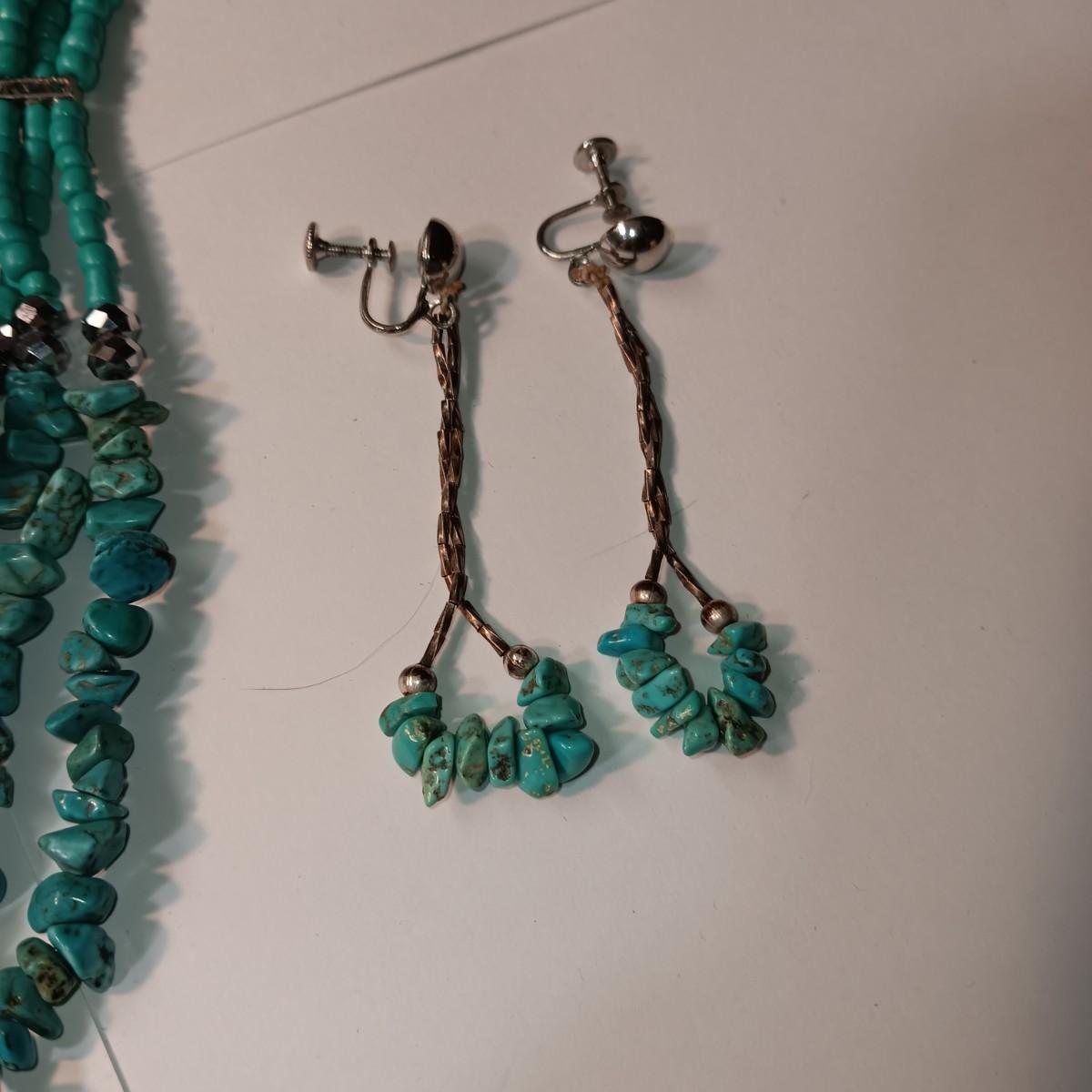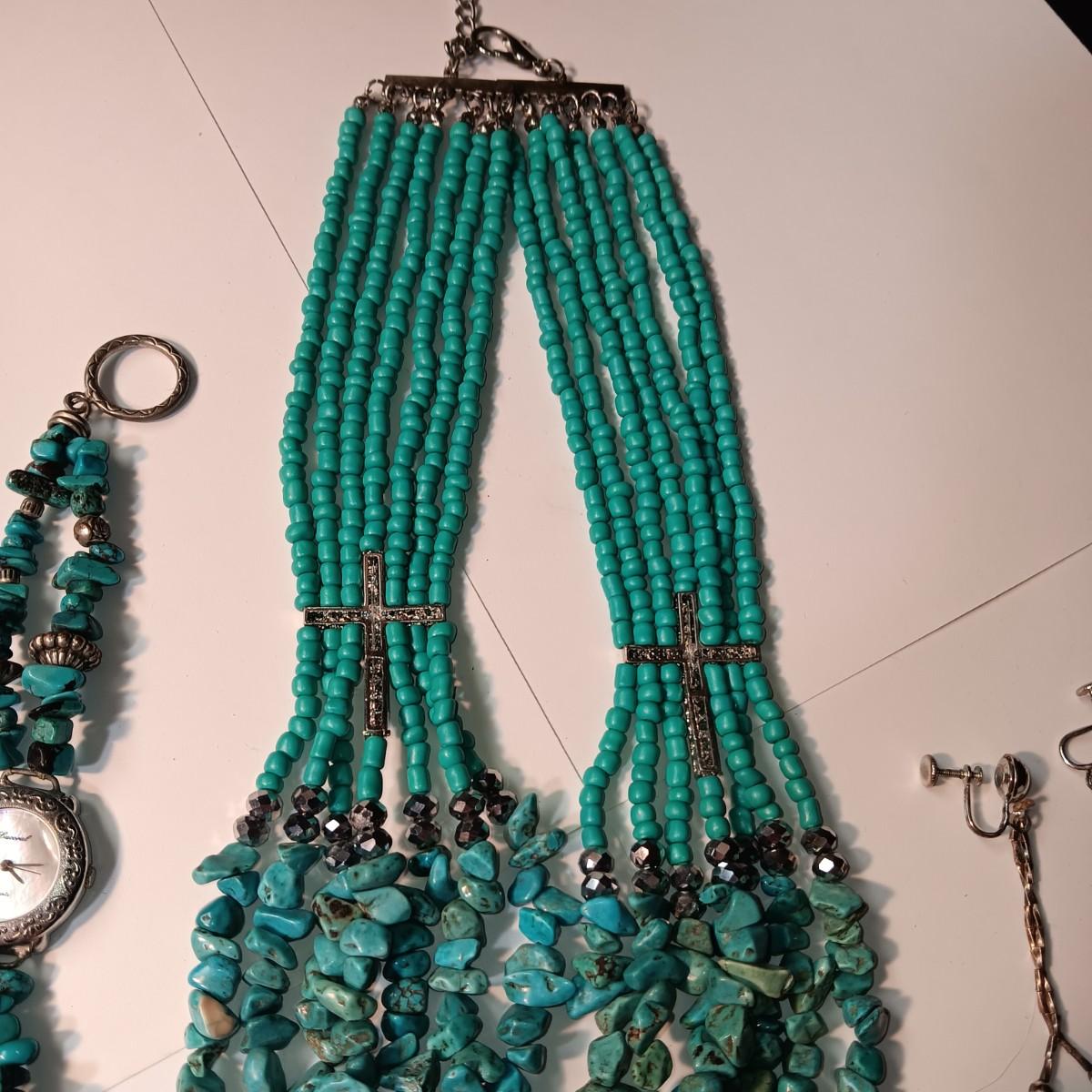TURQUOISE COLORED BEADED NECKLACE, EARRINGS AND WATCH W/BAND
