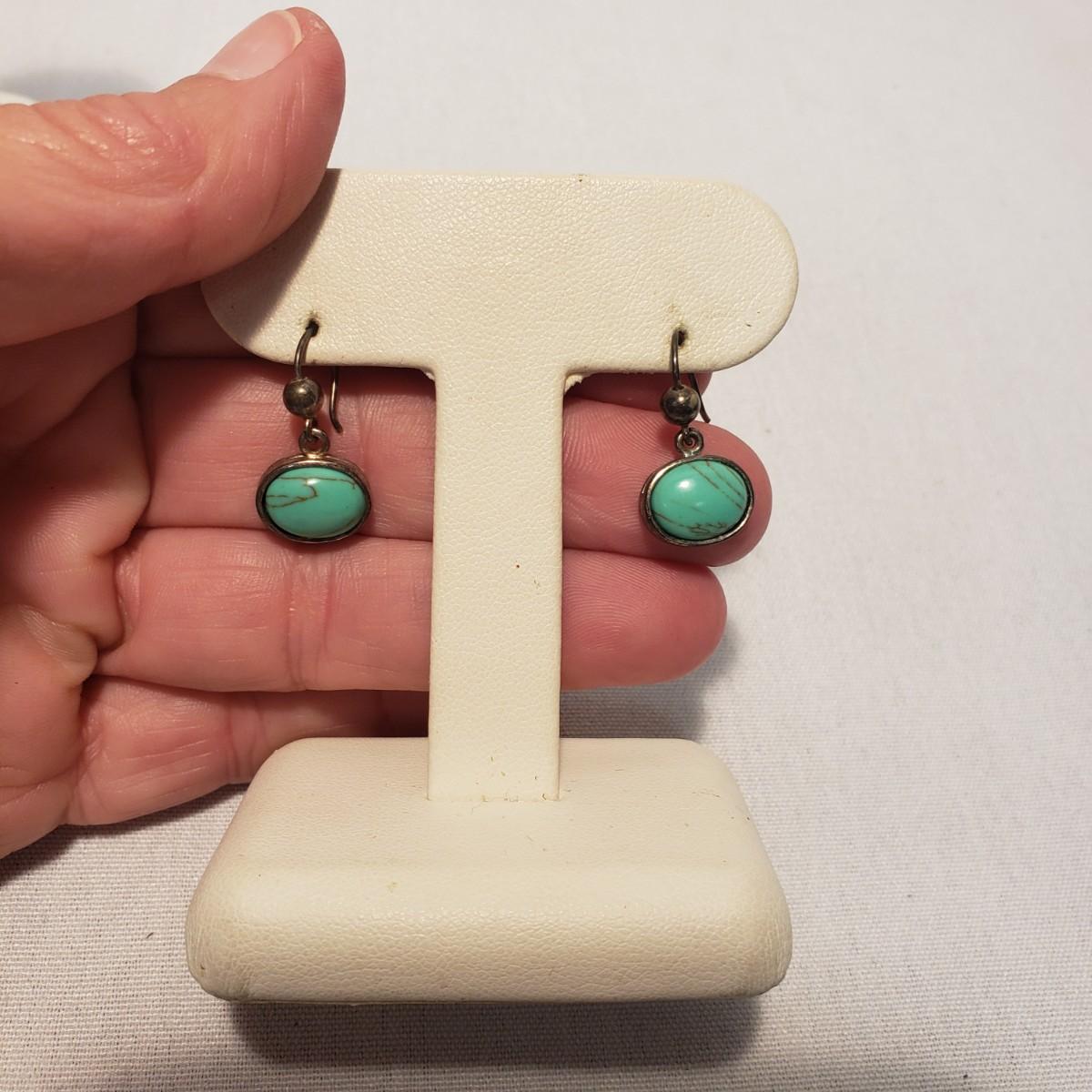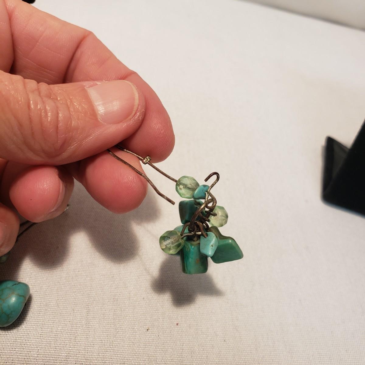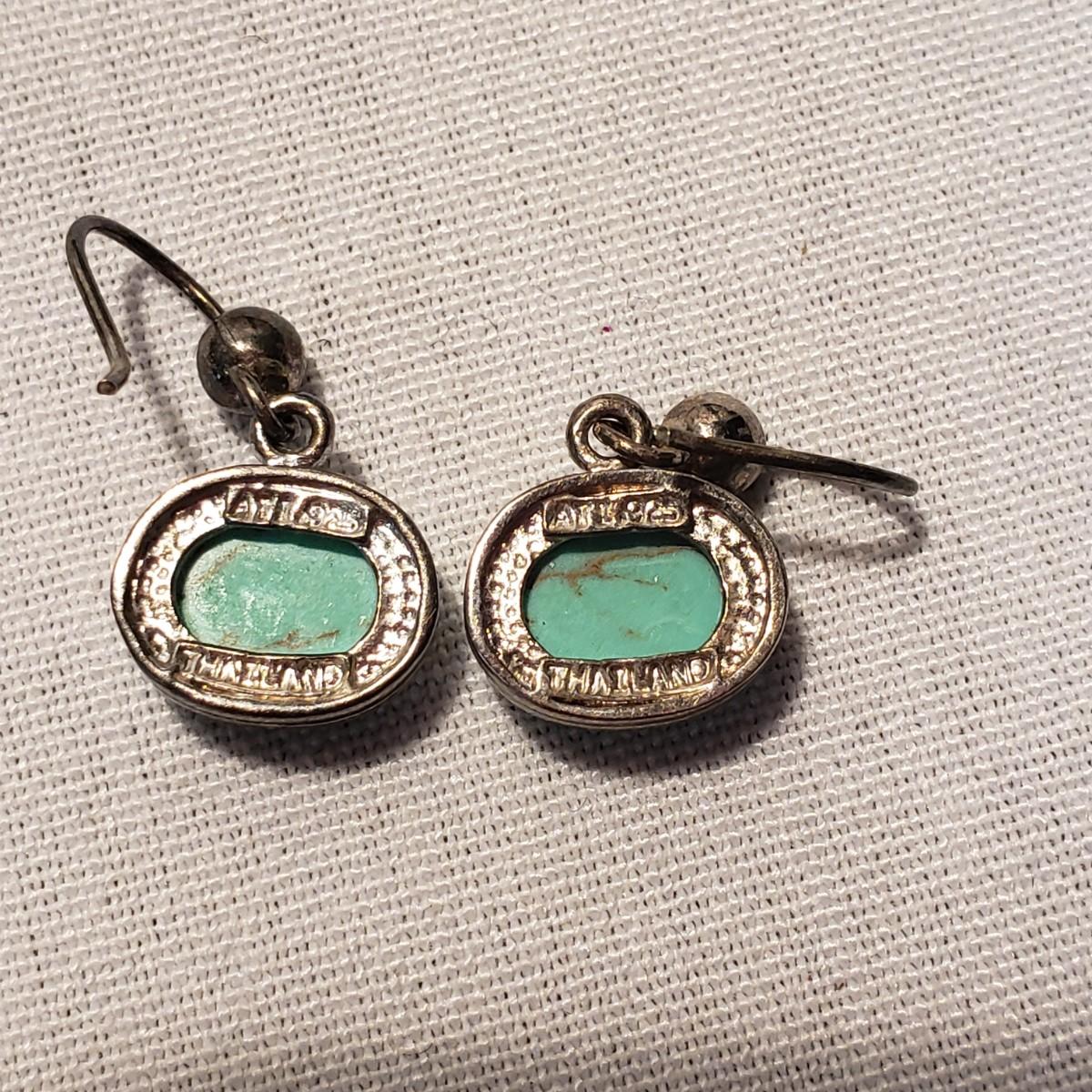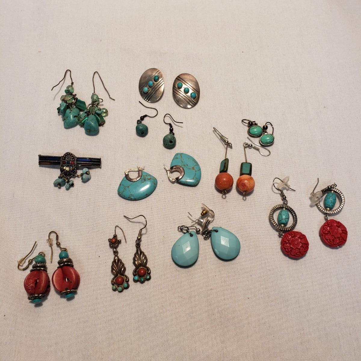 This Turquoise colored lot features 11 earrings (for pierced ears), 8 necklaces and 1 pin. The first necklace photographed with multiple stones/wooden beads measures 18". All the necklaces and some earrings appear to have Turquoise stones woven into their design. There are 11 pairs of earrings. All markings have been photographed, otherwise there was no visible marks. The smallest oval Turquoise earring are marked 925/Thailand. The other pair marked 925 have a Turquoise fan shape.