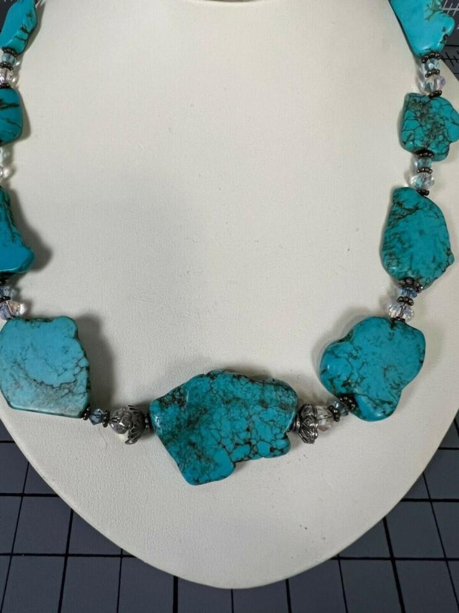 This exquisite necklace showcases unique turquoise stones complemented by crystal beads, offering a sophisticated touch. Its .925 silver clasp ensures secure wear, adding elegance to the design. Ideal for those seeking a timeless and striking accessory for their collection.