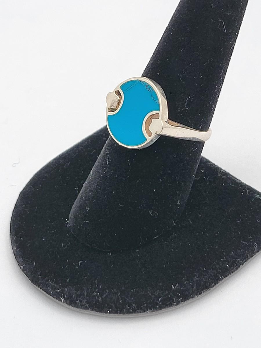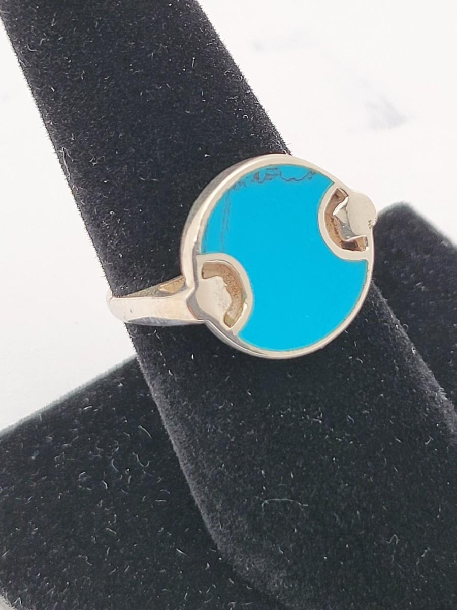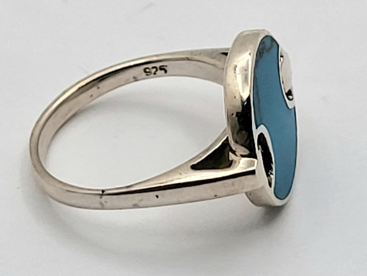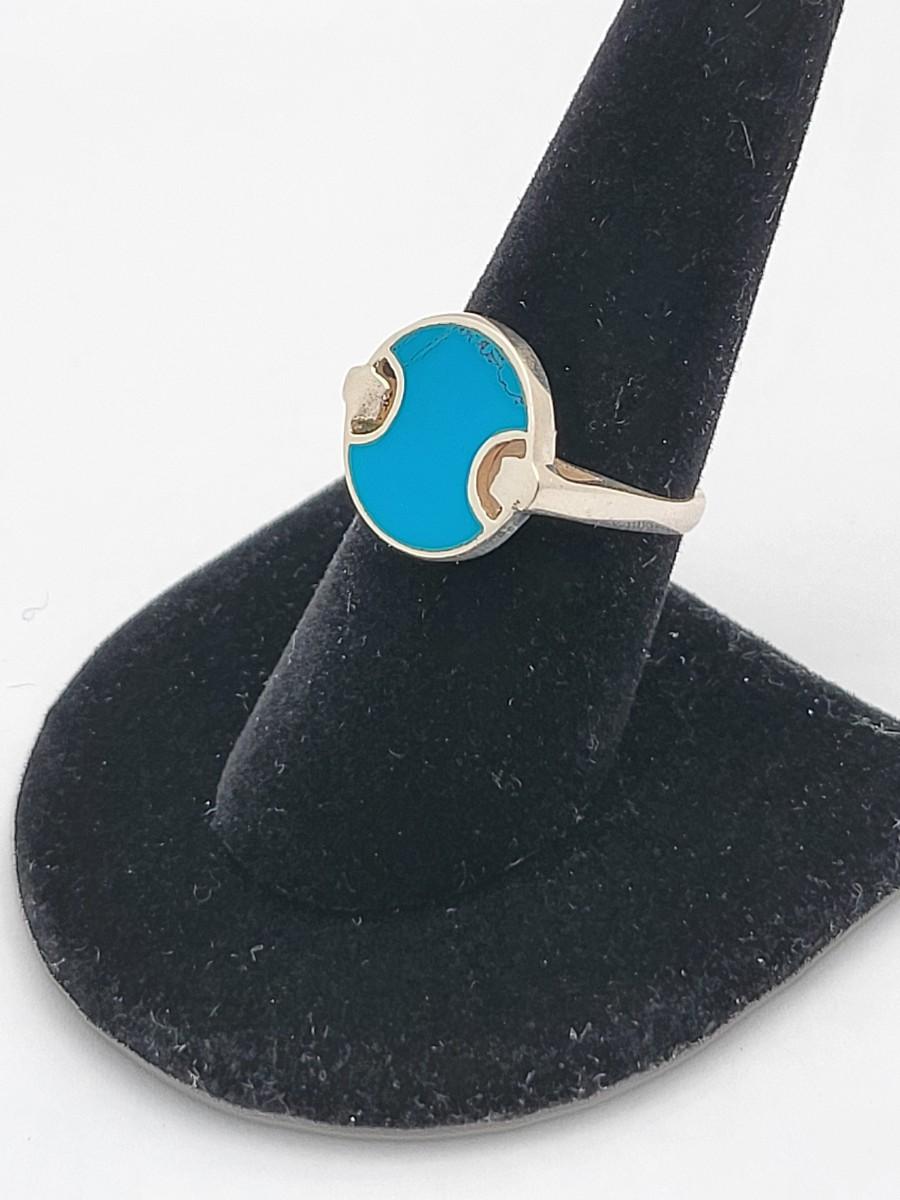 Unique flat, inlay Turquoise design ring in 925 sterling silver. Face of the ring is 1/2" round. Size 8. Weighs 5.1gr.