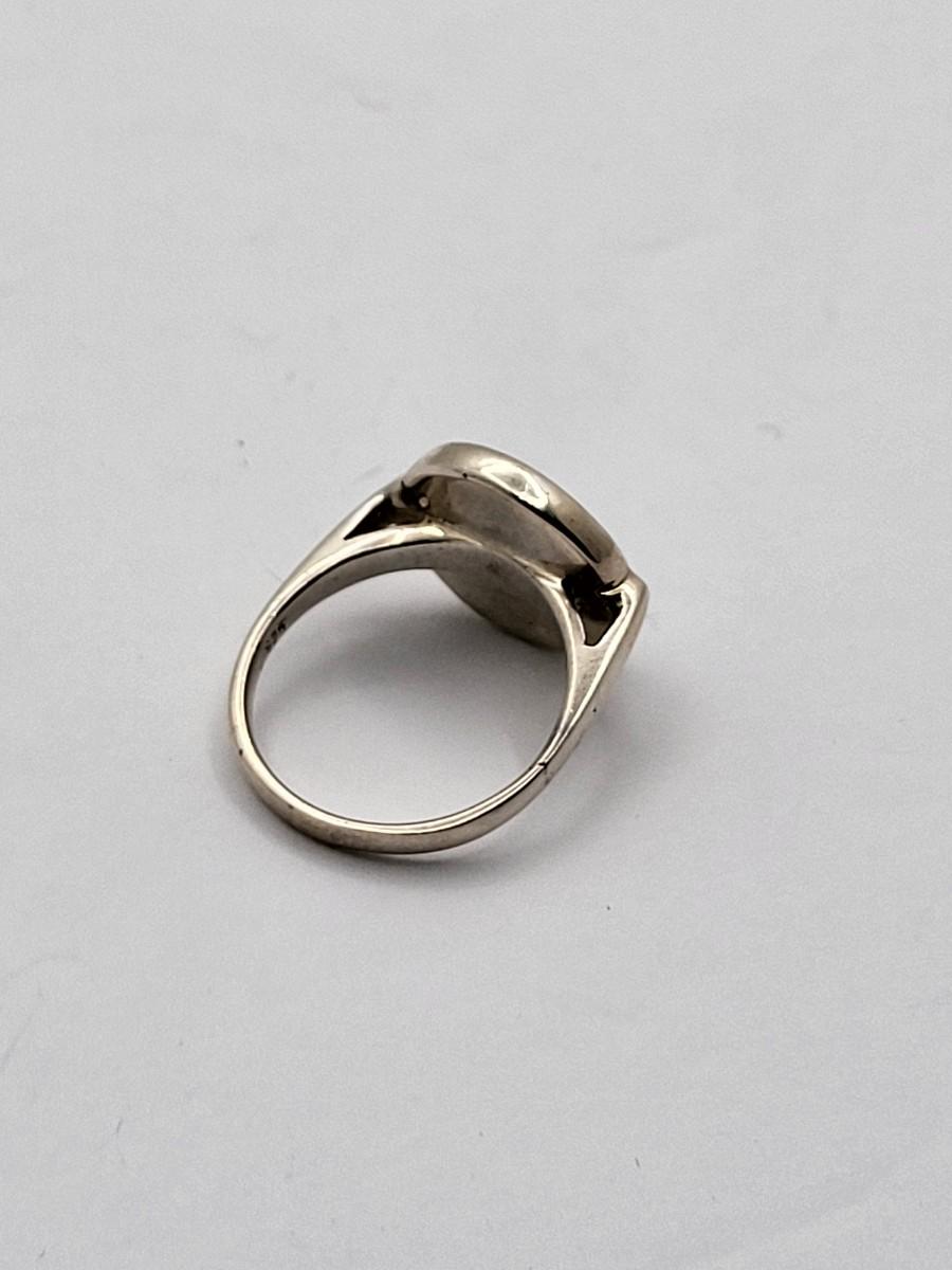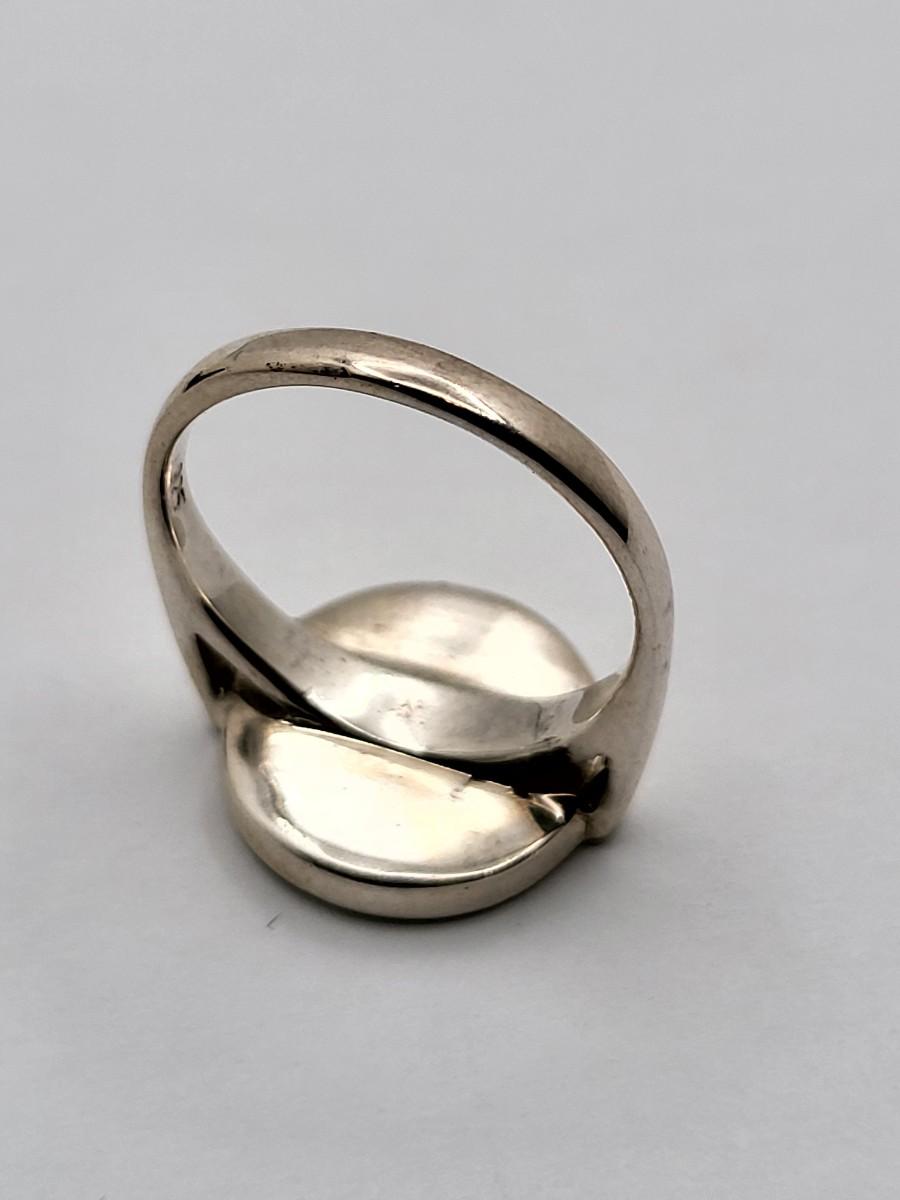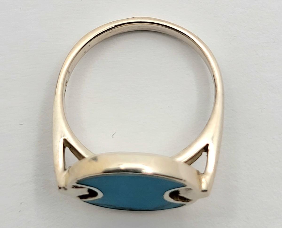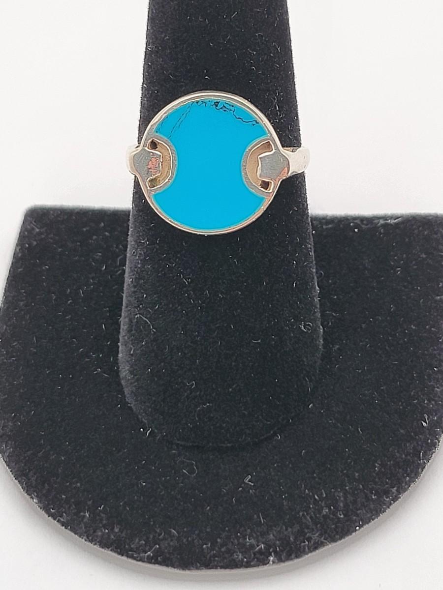 Unique flat, inlay Turquoise design ring in 925 sterling silver. Face of the ring is 1/2" round. Size 8. Weighs 5.1gr.