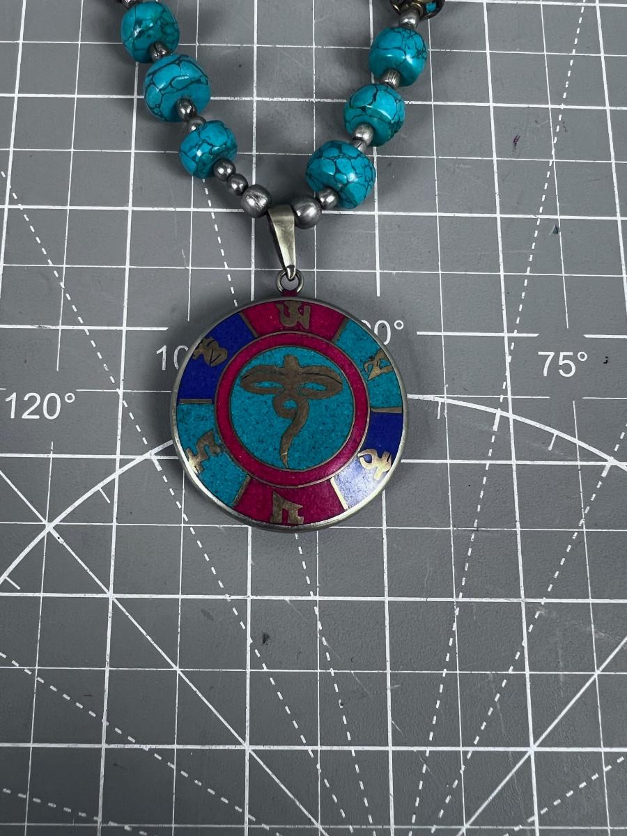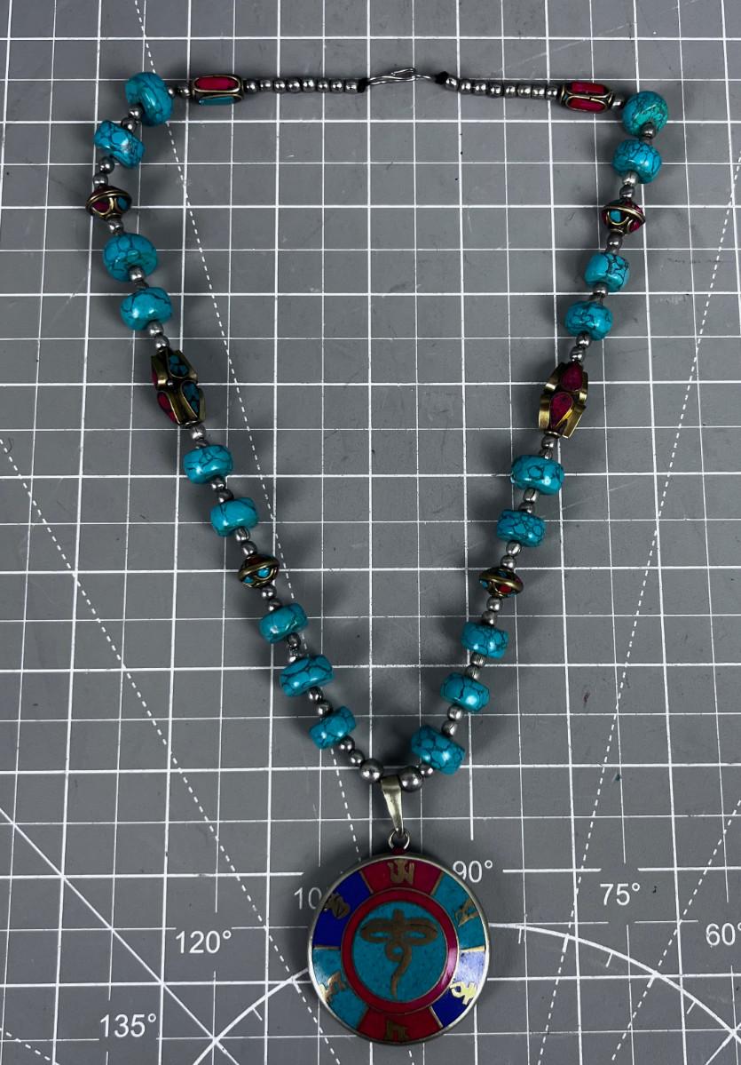 Turquoise Enamel Inlay Necklace INTERESTING! Tibetan Om