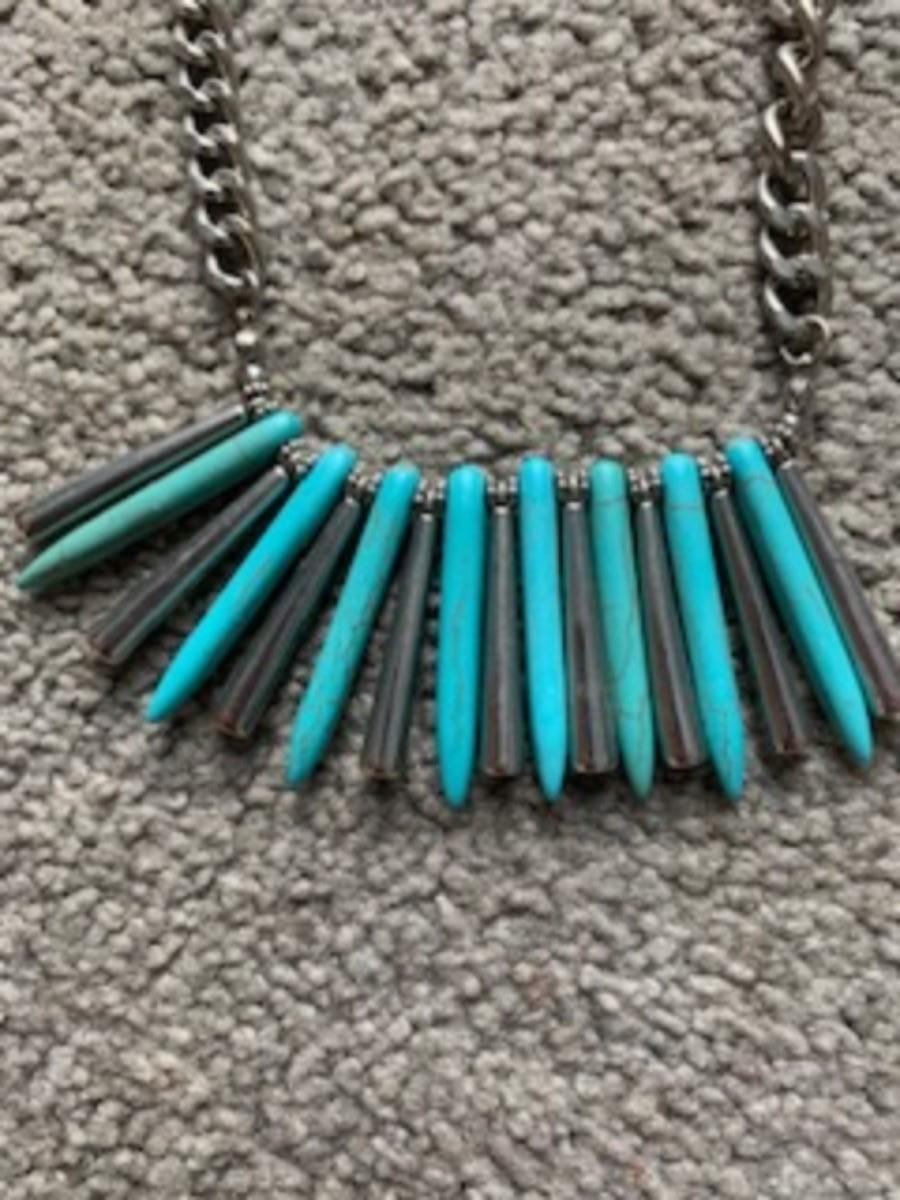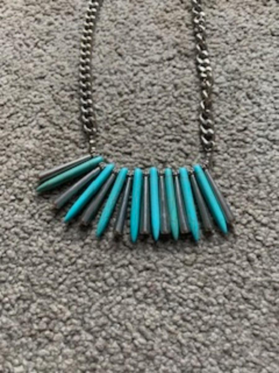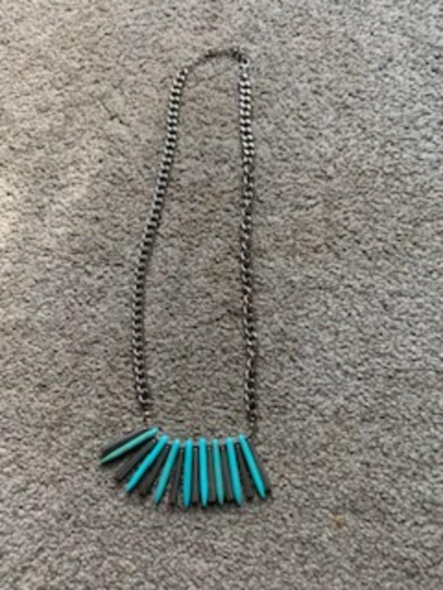 Turquoise pendant necklace, featuring nine vertical bars arranged in a graceful fan pattern.