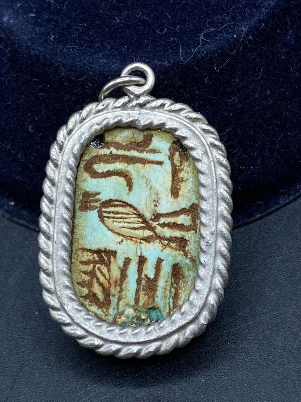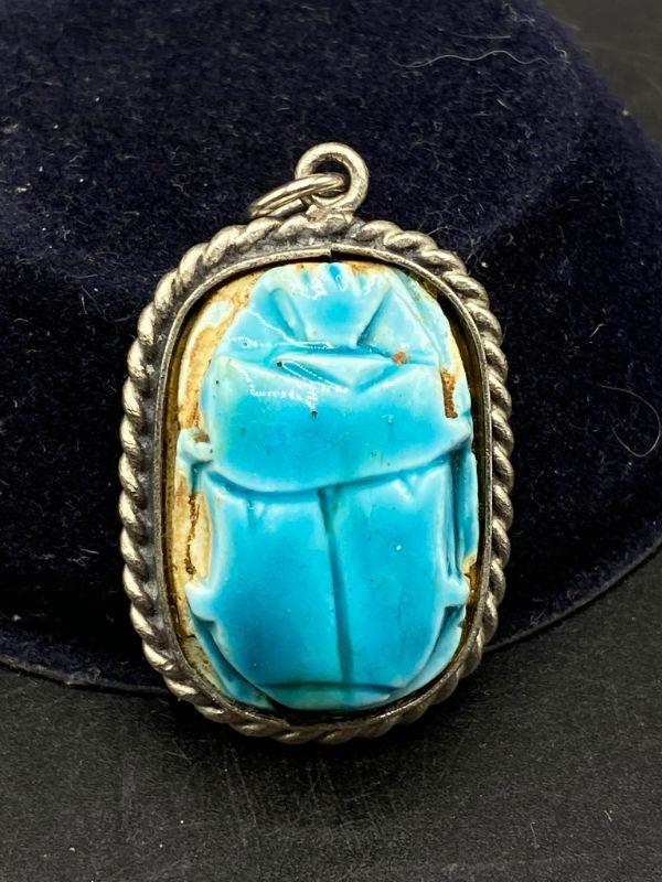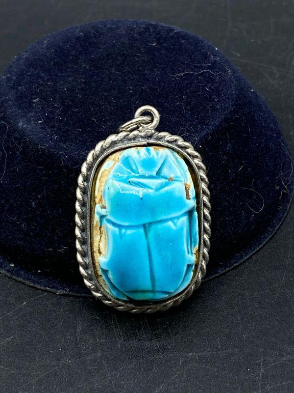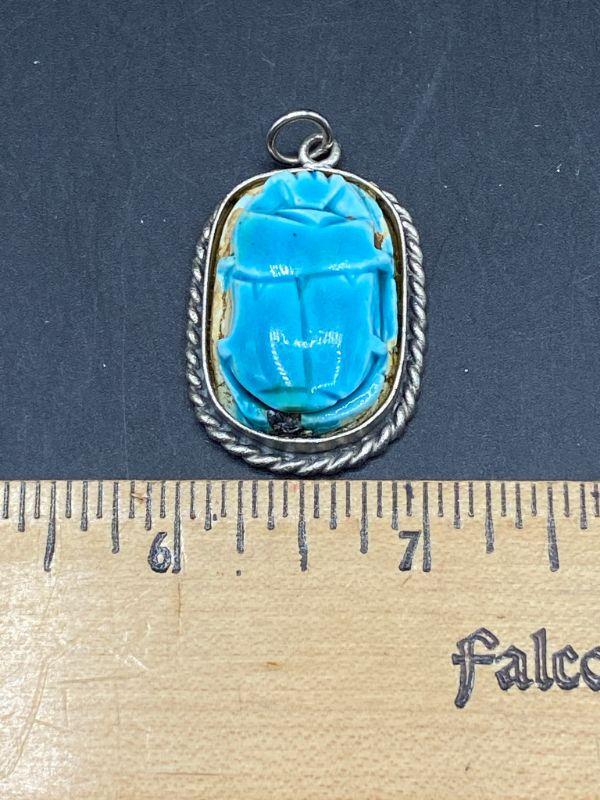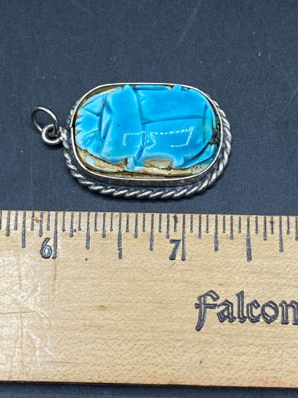 Turquoise glaze scarab pendant. Silvertone setting. One side is the scarab, the other side has hieroglyphics. Almost 1.5" size.