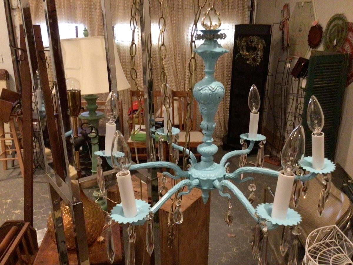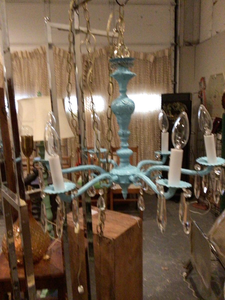 This is a great turquoise hanging chandelier, it has a plug and a switch works.