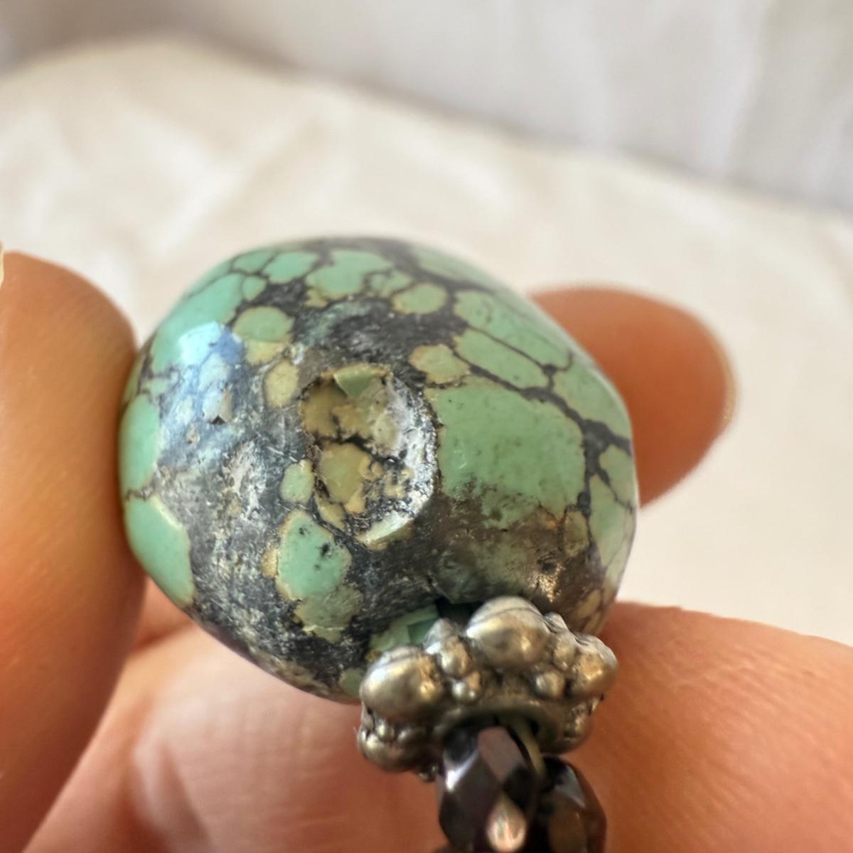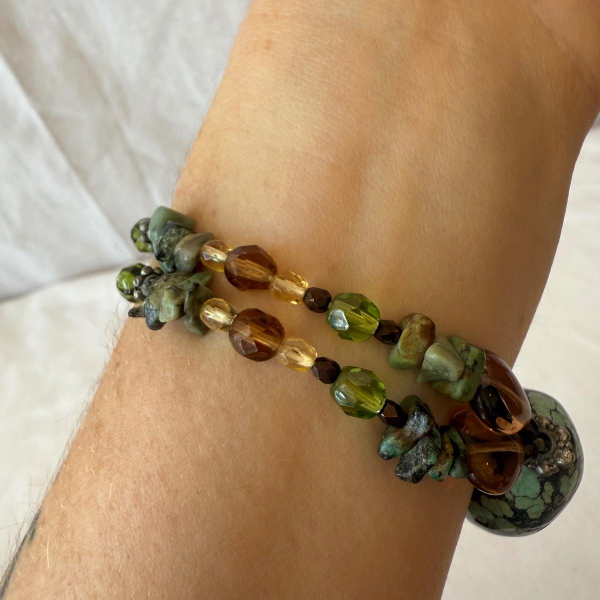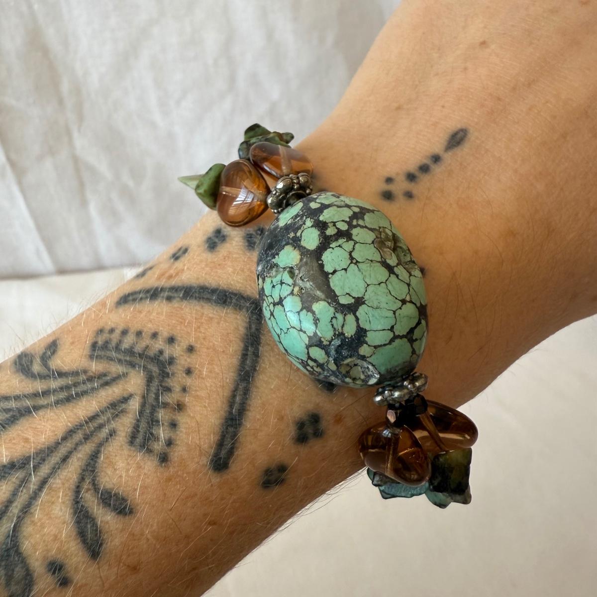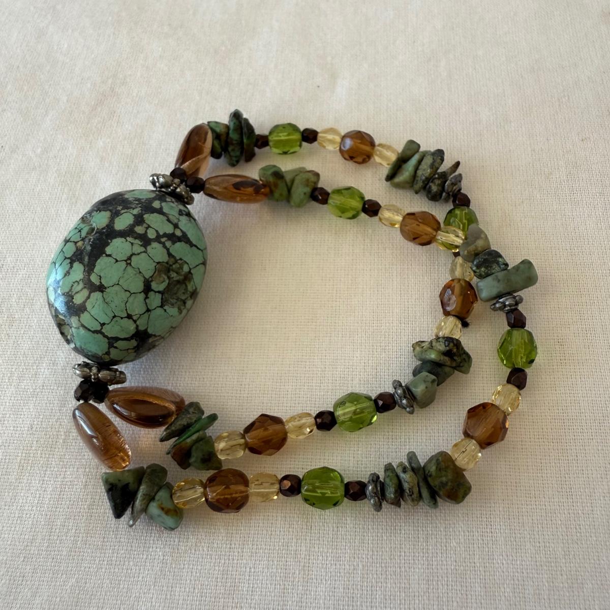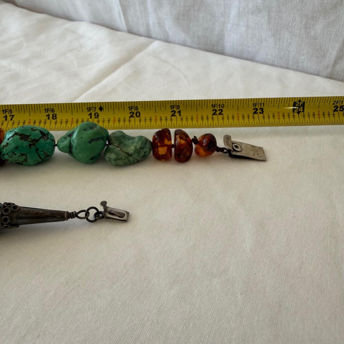 Two breathtaking necklaces plus a bracelet featuring turquoise stones. One necklace has large chunky turquoise and amber beads. The other has multiple strands of turquoise and pearls. Both have gorgeous clasps stamps 925. The bracelet has one large turquoise bead on two elastic strands with smaller turquoise and glass beads.