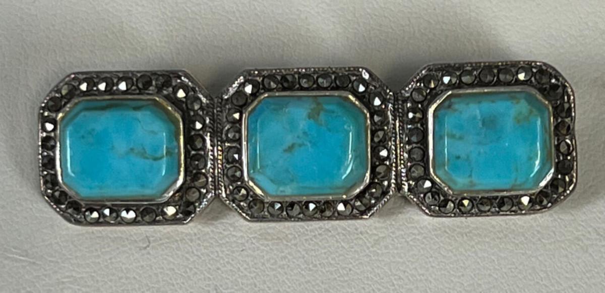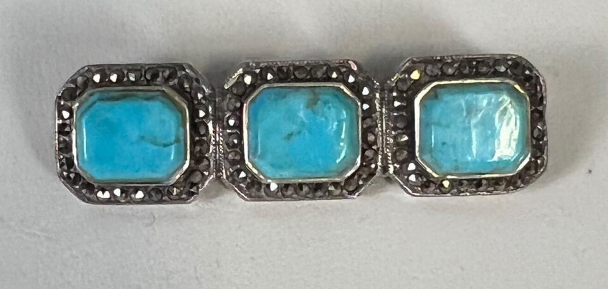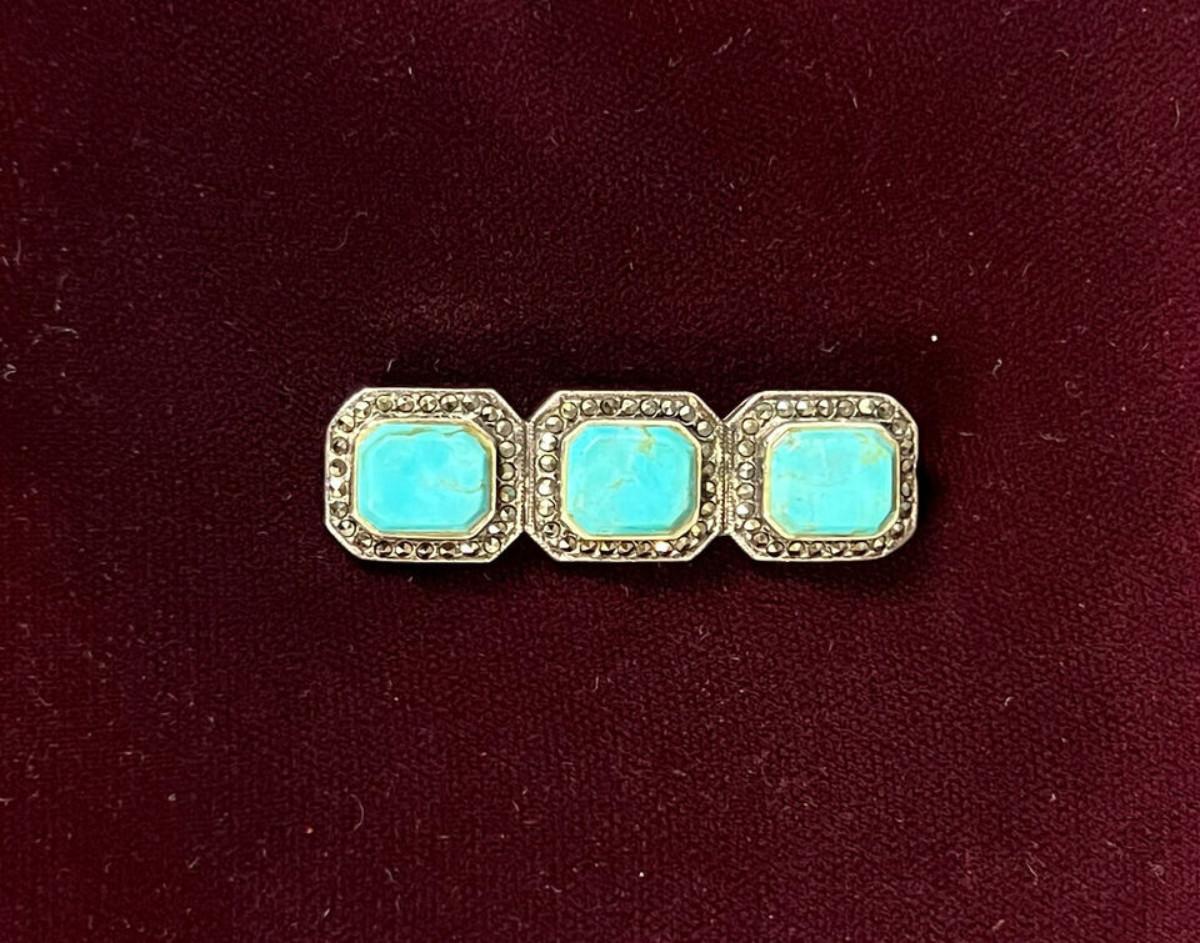 Elegant vintage-inspired brooch featuring turquoise and marcasite in a stunning deco style. Perfect for adding a touch of sophistication to any outfit. weight is 10 grams