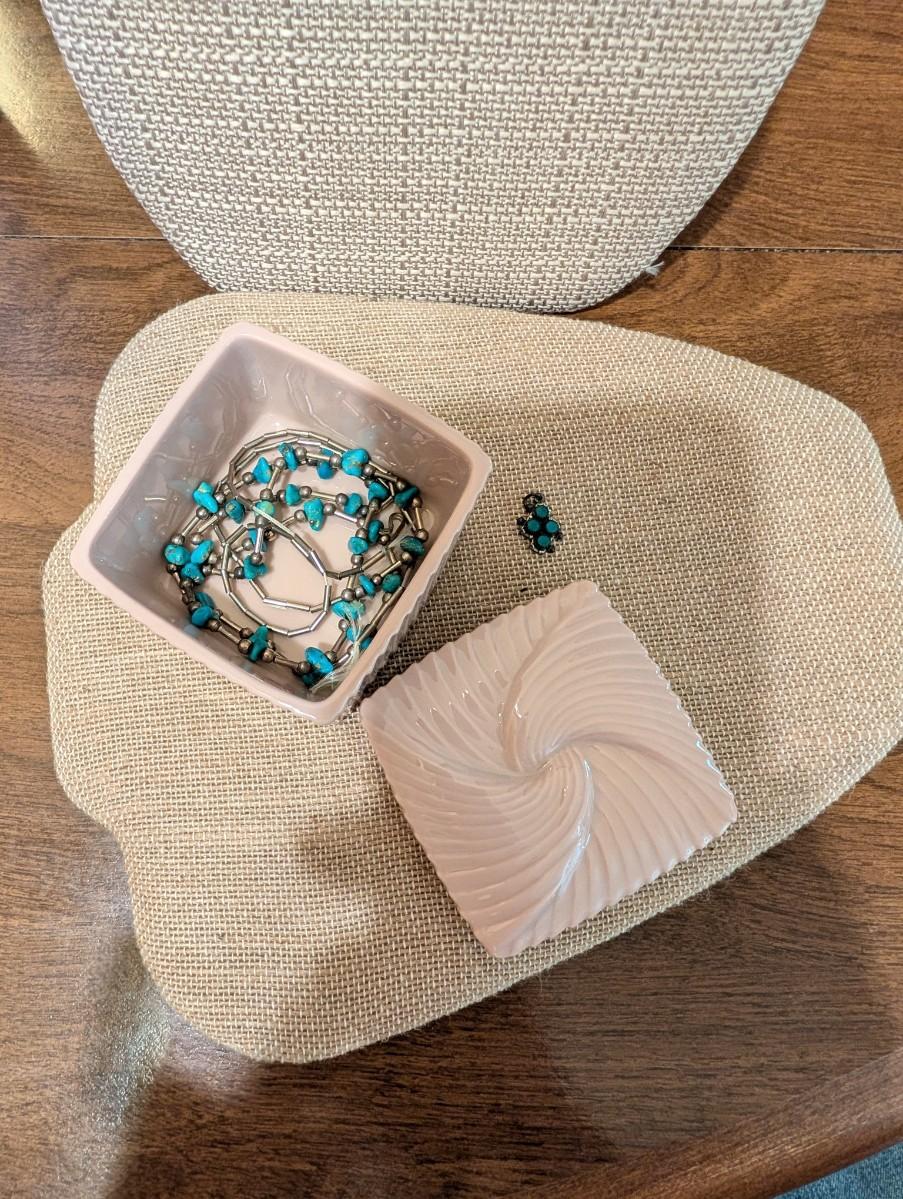 31-In turquoise necklace clasp is broken. Sterling vintage Southwest turquoise pendant porcelain Avon trinket box