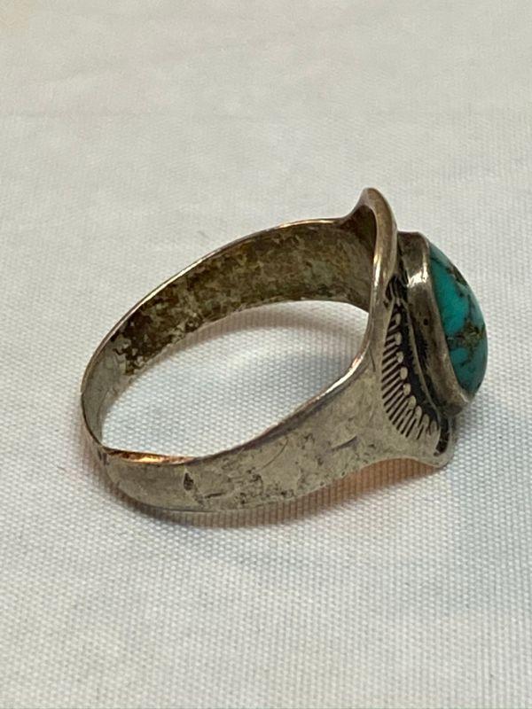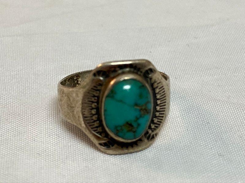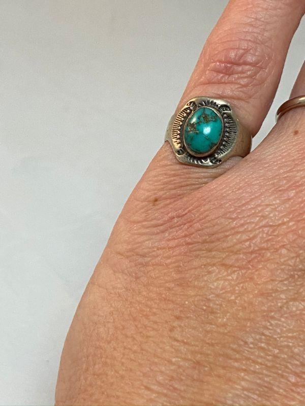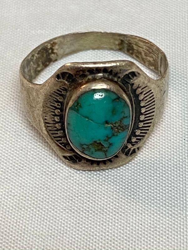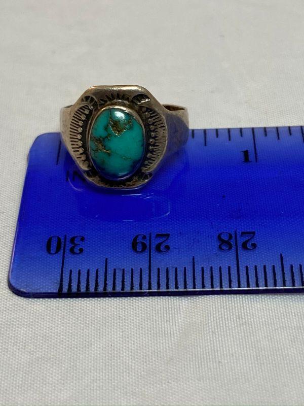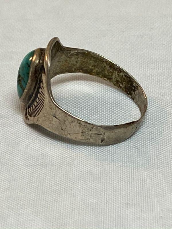 Southwestern Turquoise Ring. Small, a size 4 maybe a 4.5. No sterling marks noticed but it did shine up like silver with a dry cloth.