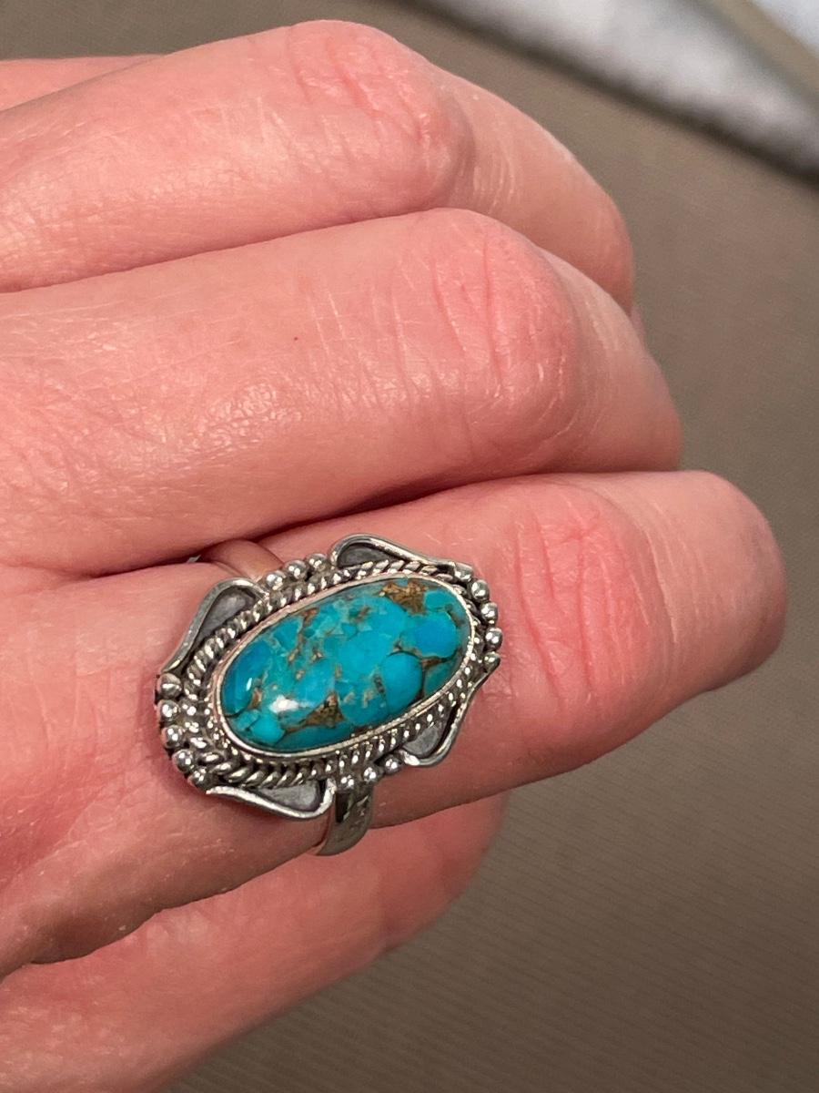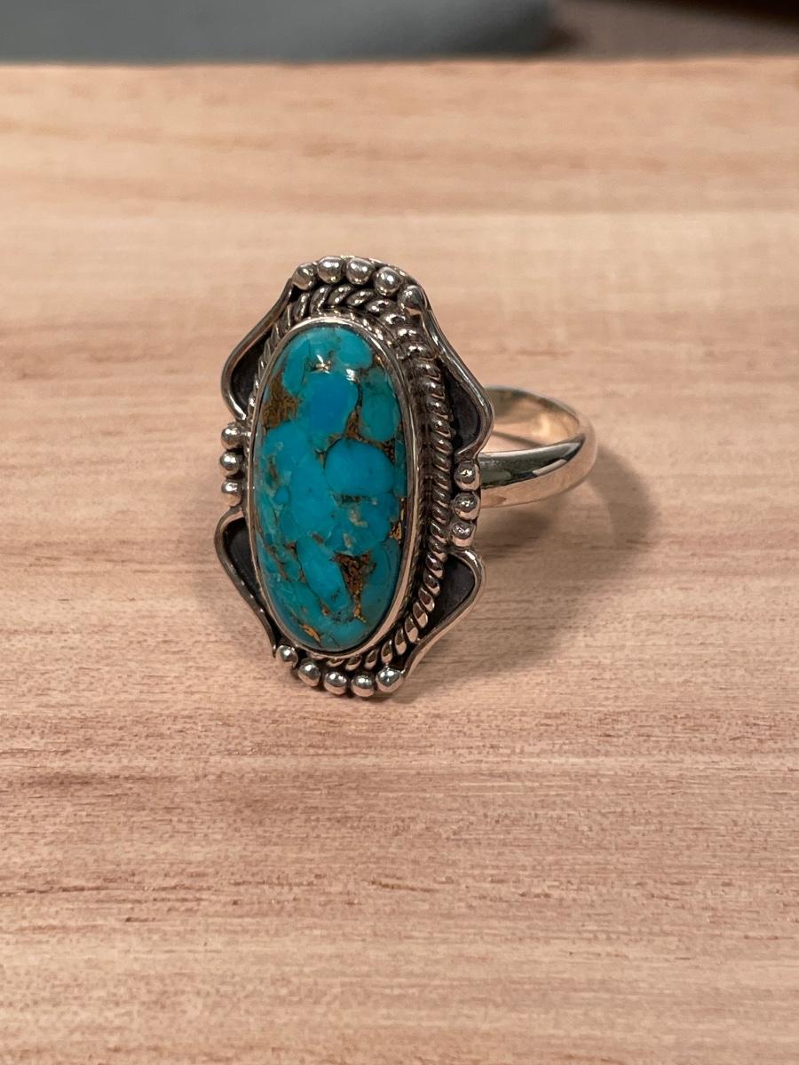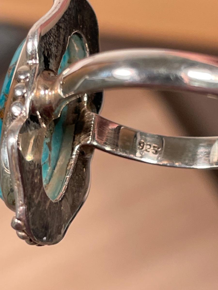Stone has copper in the matrix. Metal is 925 sterling silver.. Size 9