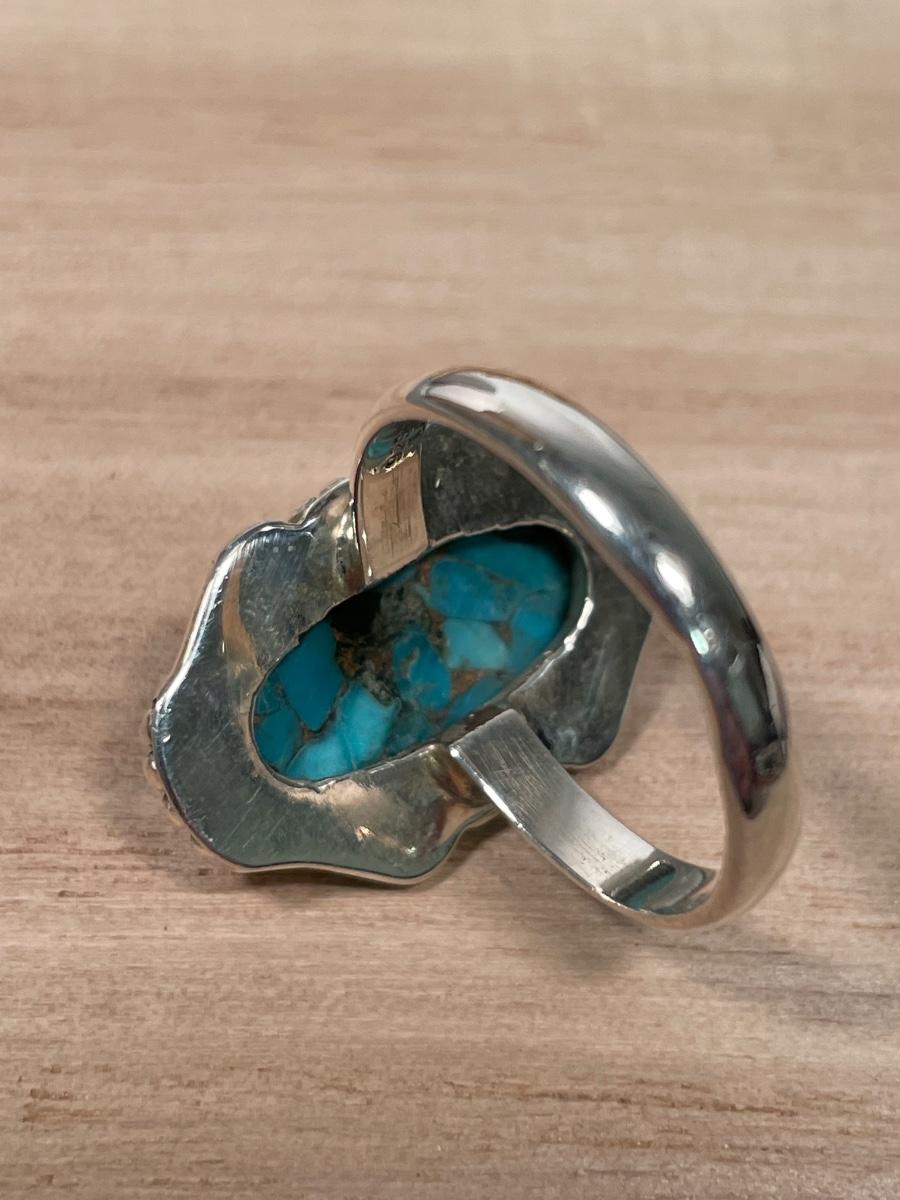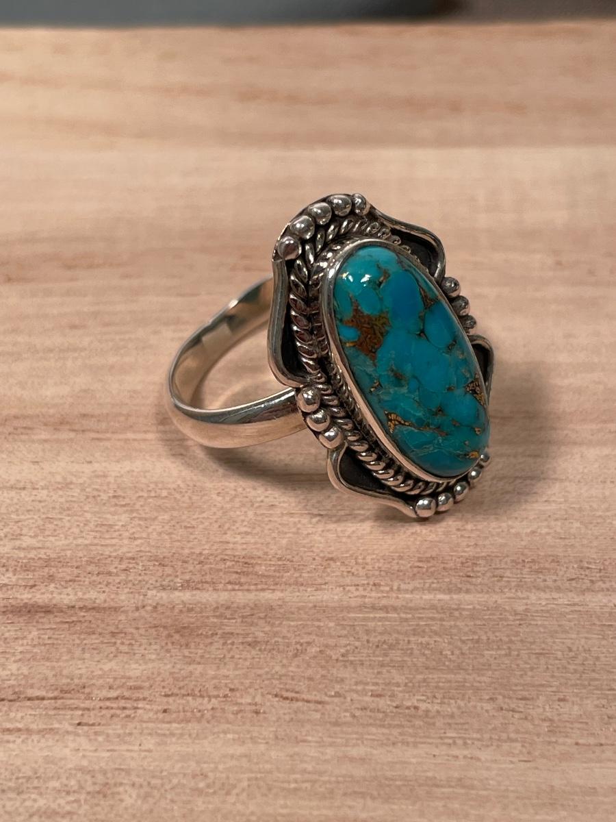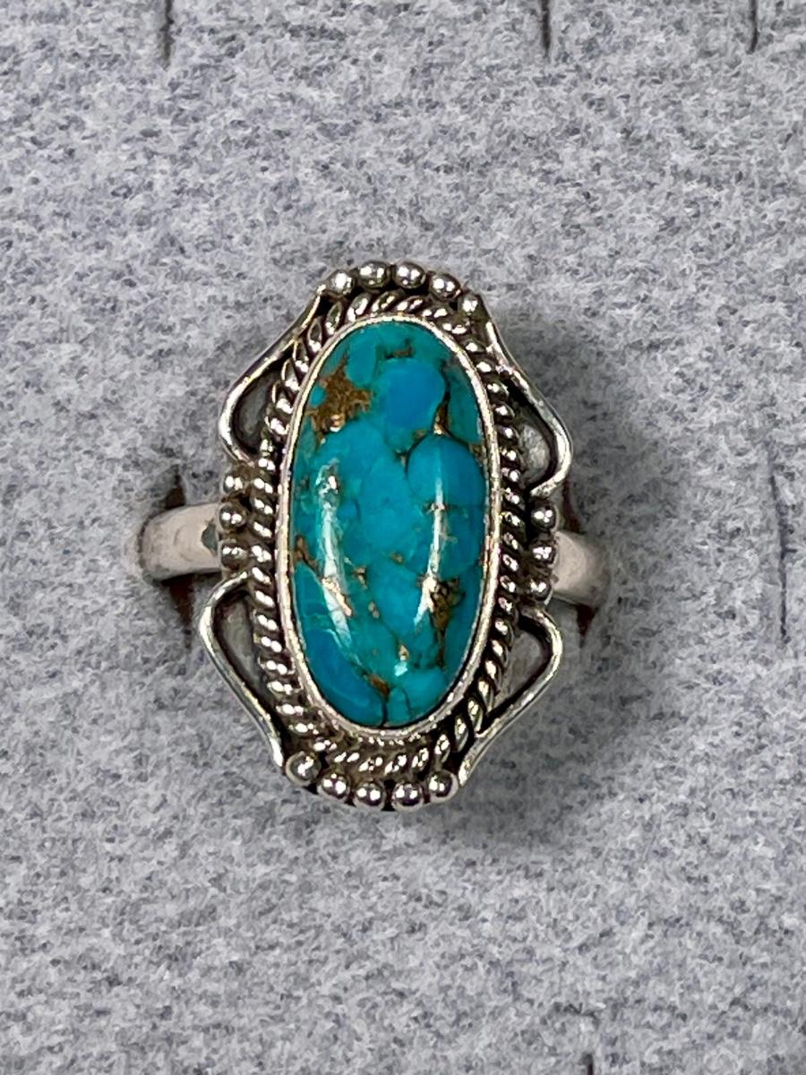 Stone has copper in the matrix. Metal is 925 sterling silver.. Size 9