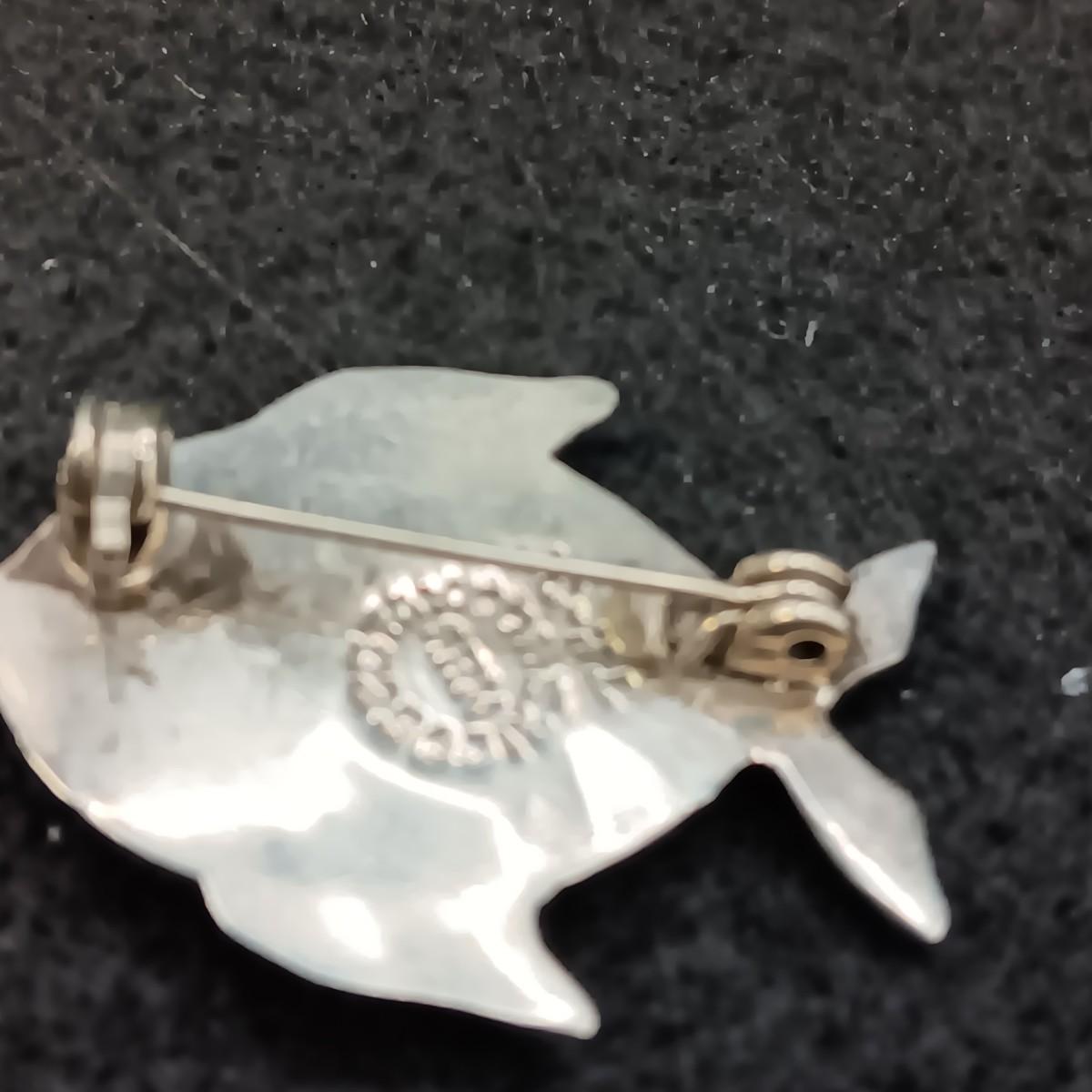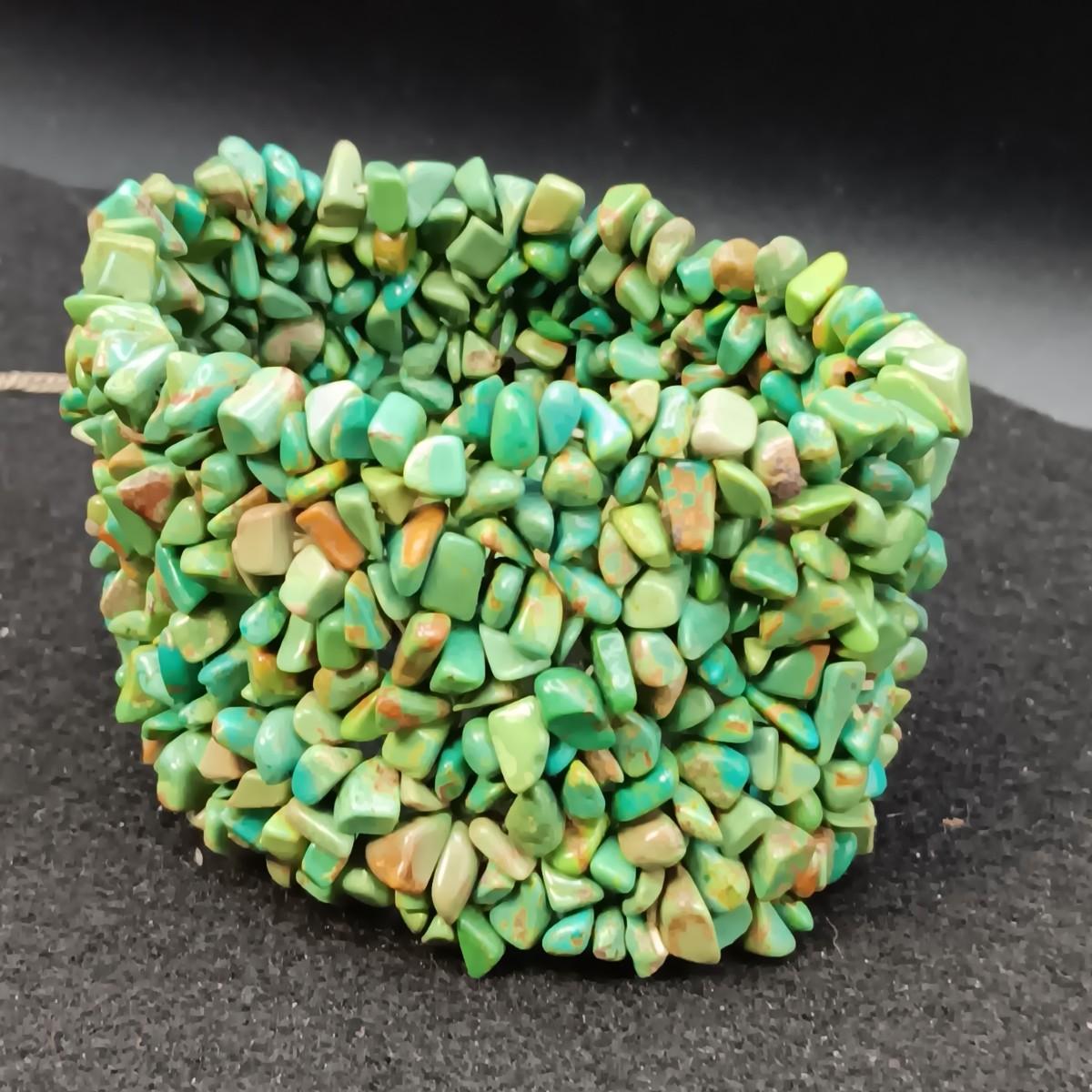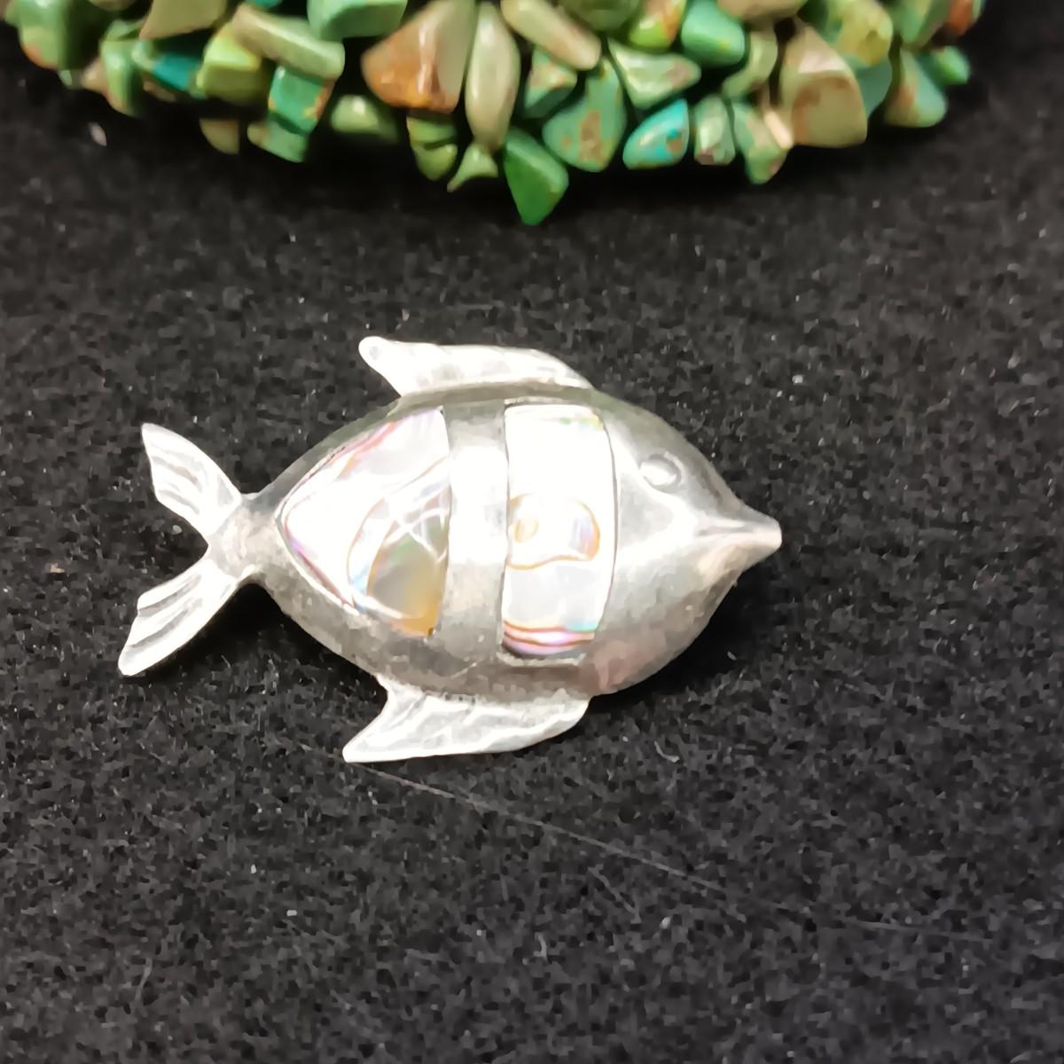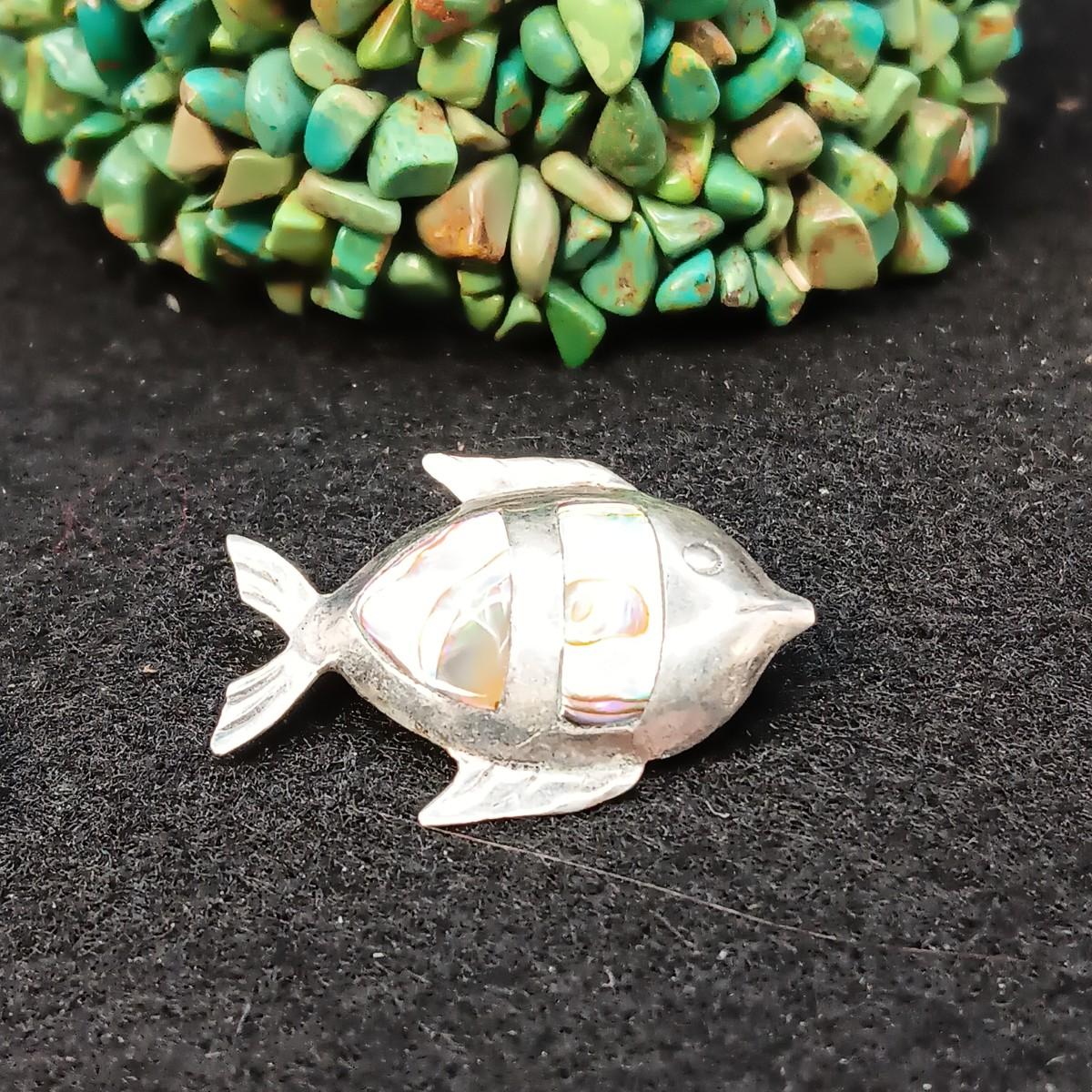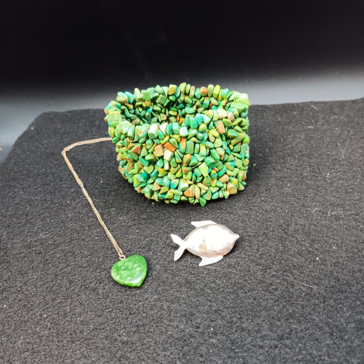 TURQUOISE CHIPS STRETCH BRACELET, ABALONE & SILVER FISH PIN AND A HEART NECKLACE