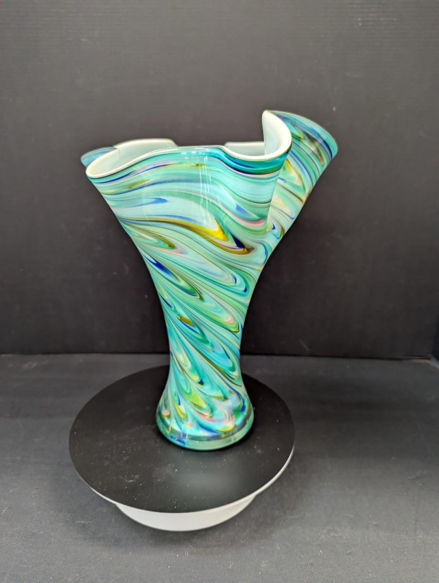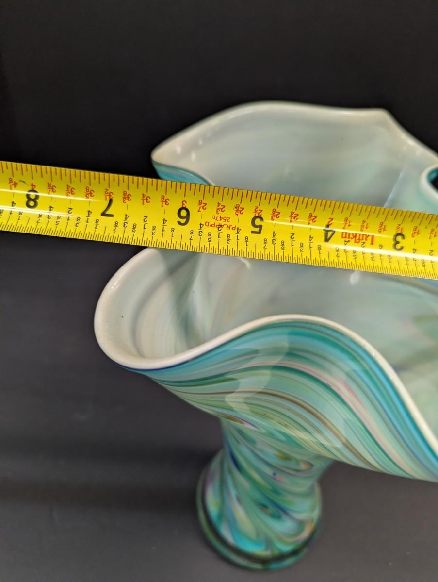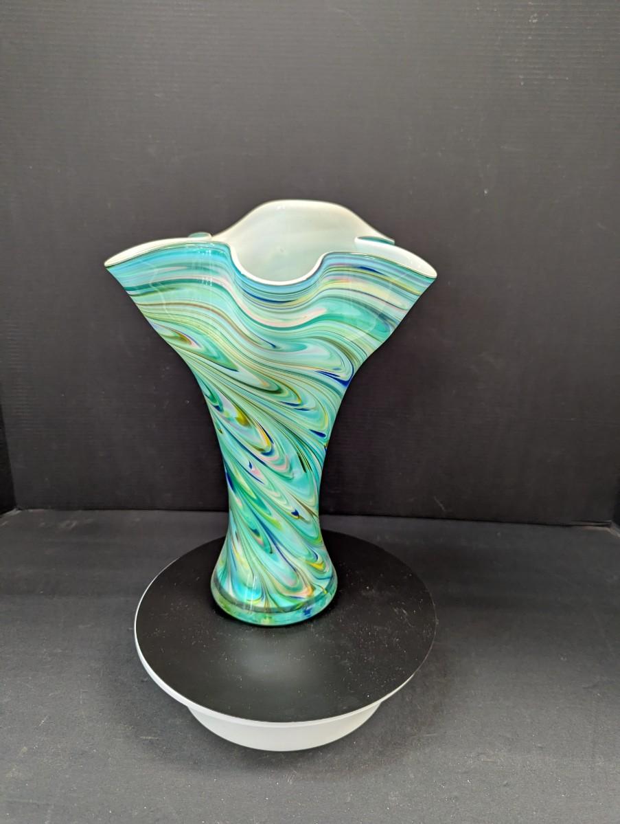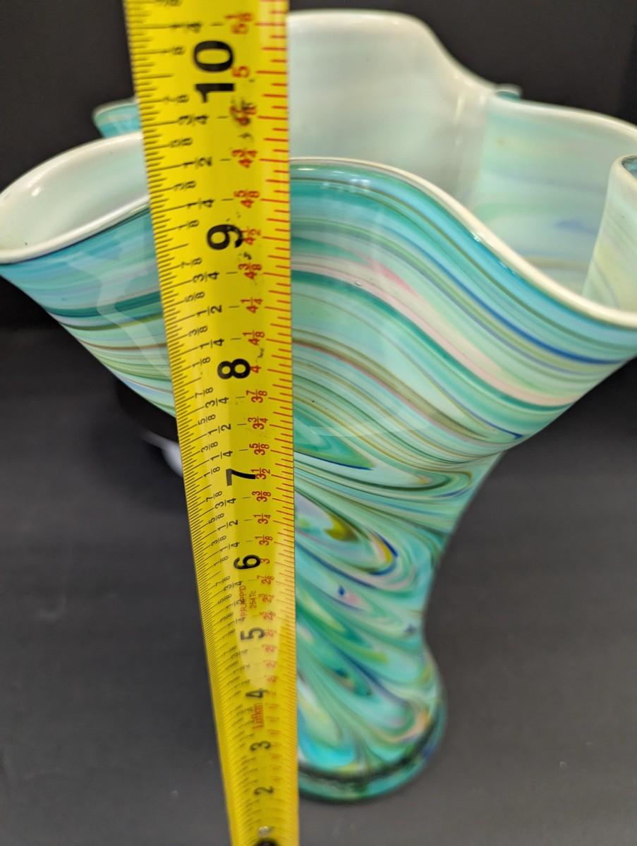 Turquoise Tapered Color Swirl Glass Art Vase With Fluted Rim