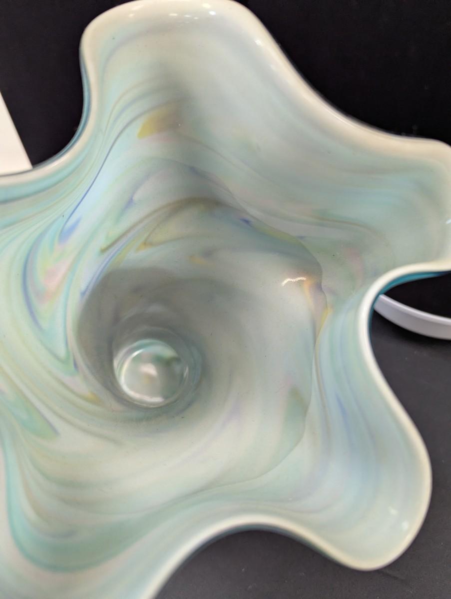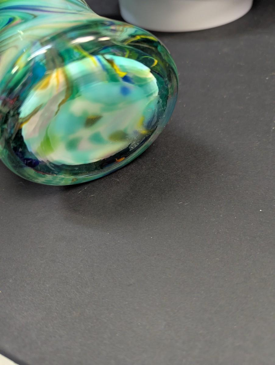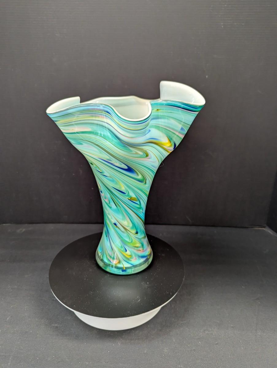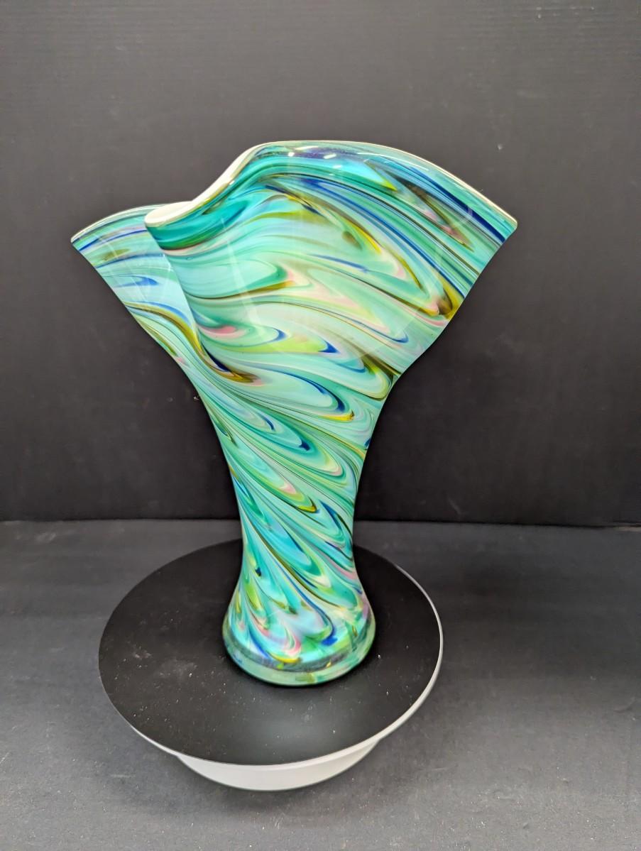 Turquoise Tapered Color Swirl Glass Art Vase With Fluted Rim