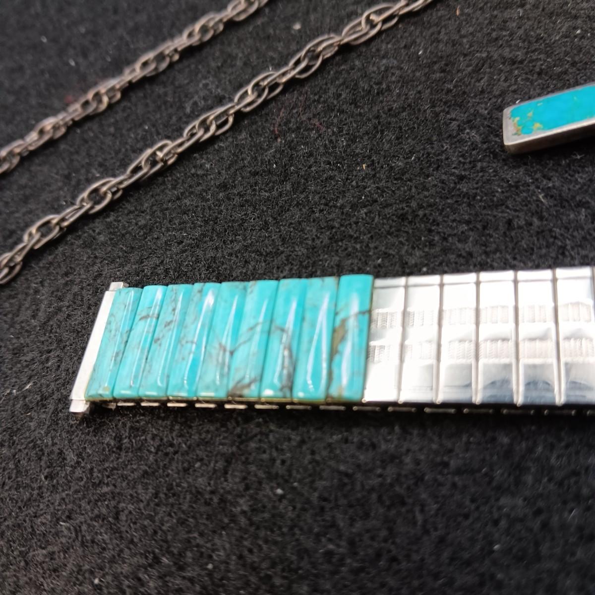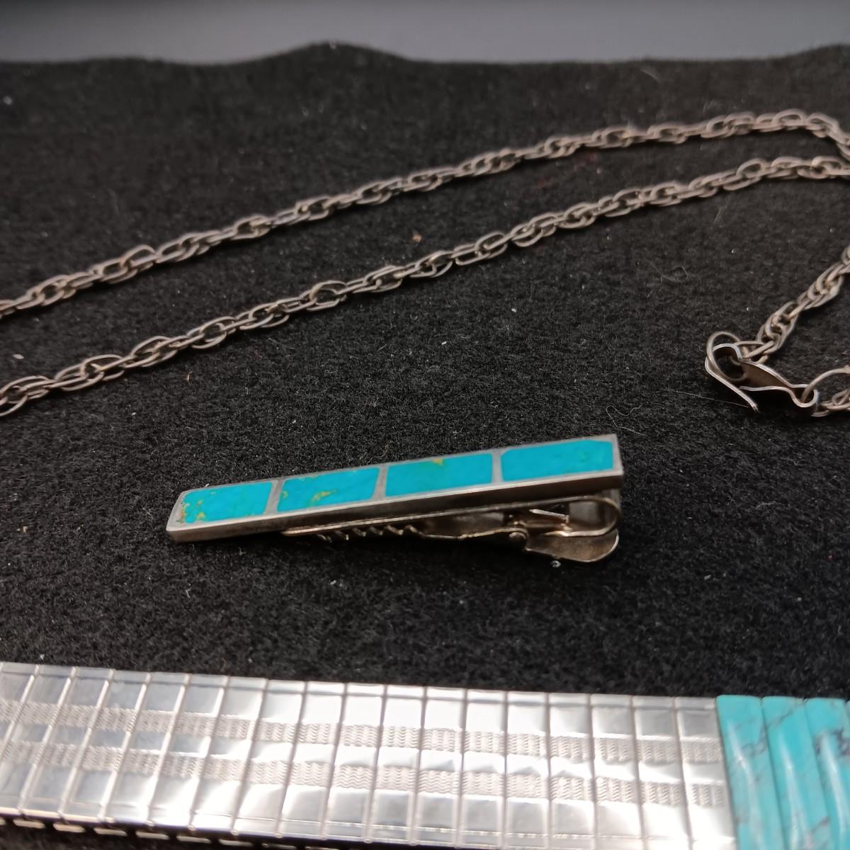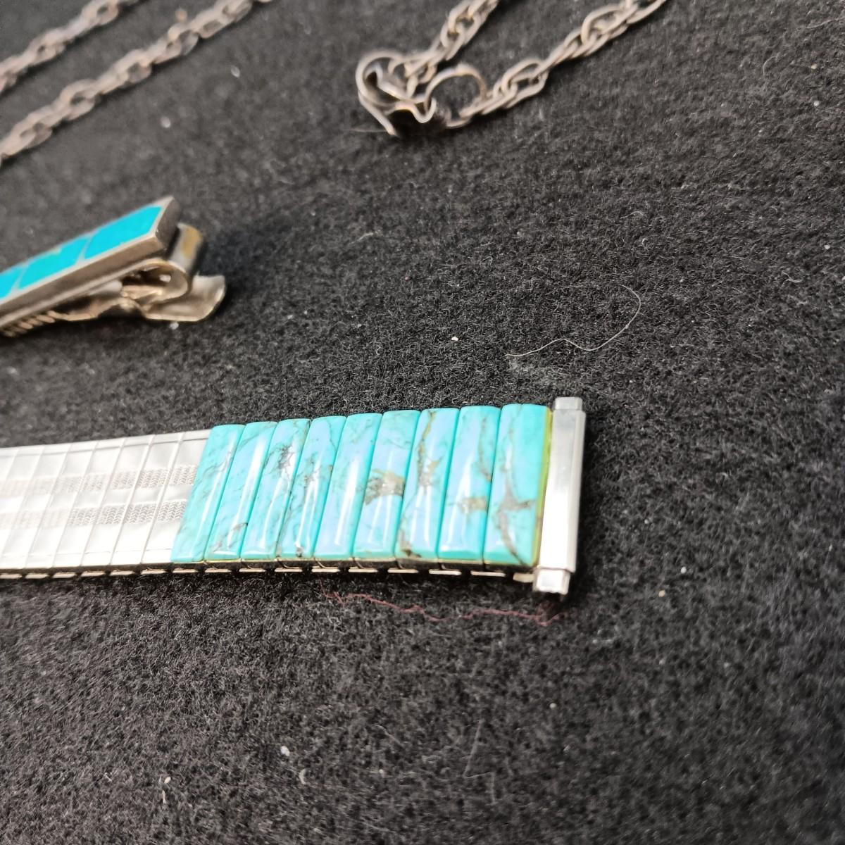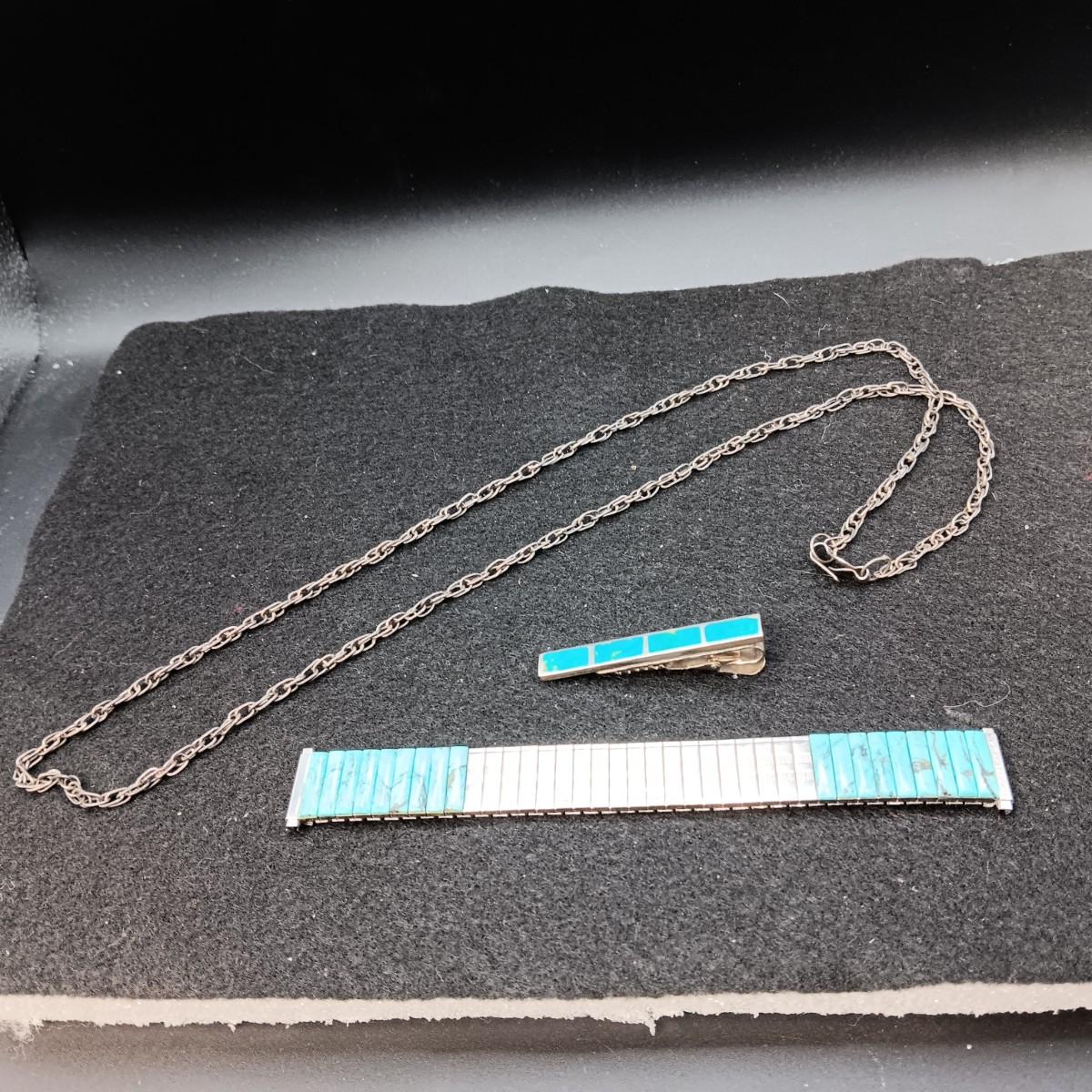 TURQUOISE WATCH BAND & TIE CLIP PLUS A STERLING CHAIN