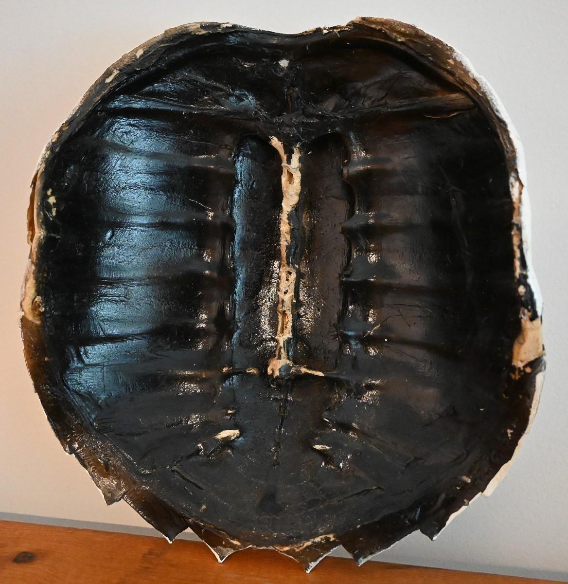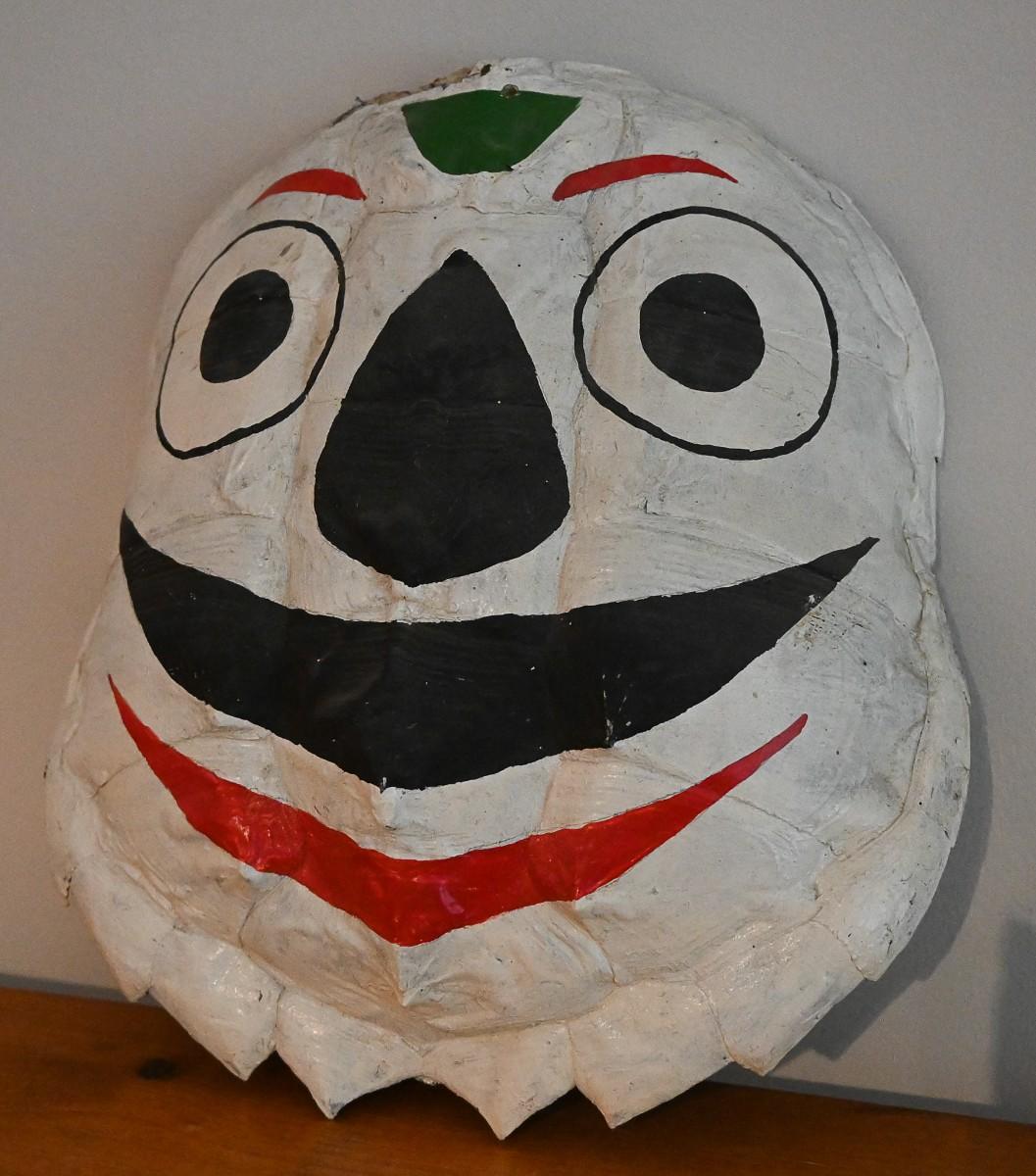 A mask painted by an unknown artist, possibly for use in the circus. Turtle shell, mixed media. Approx. 10" x 10" x 2". Please note, one of the shell's painted segments has fallen off, up and to the left of the green forehead emblem. Edie B Estate Sales is not responsible for additional lost segments during shipment.