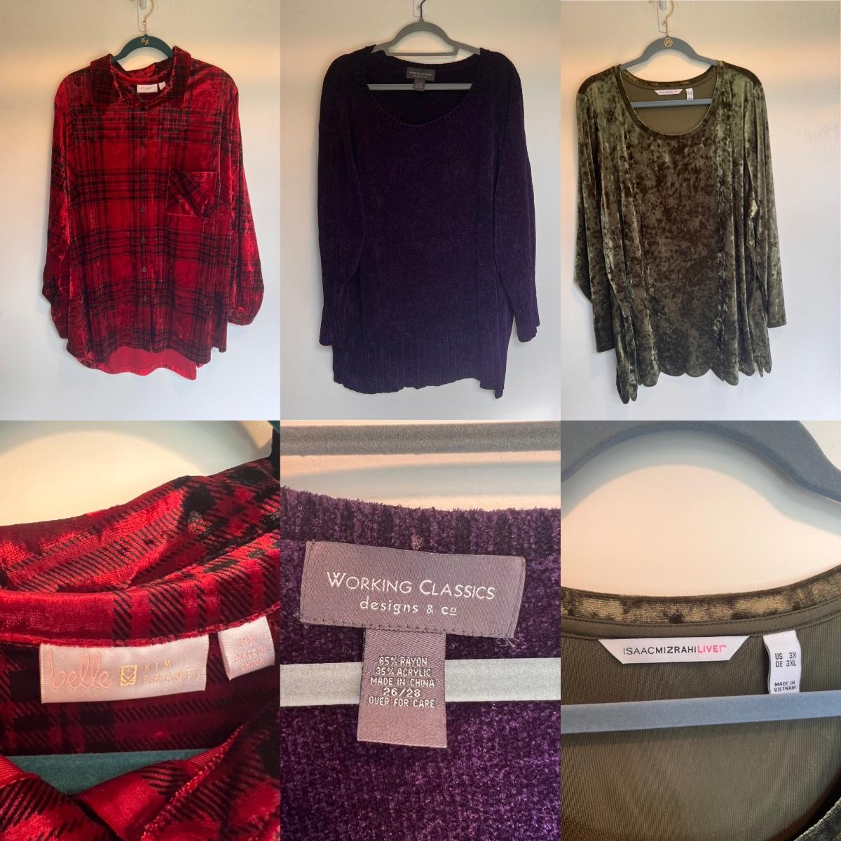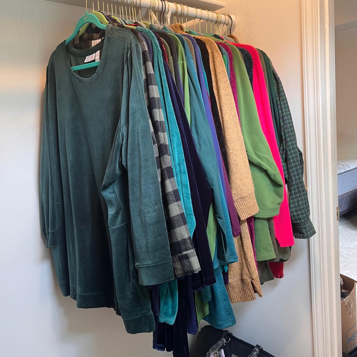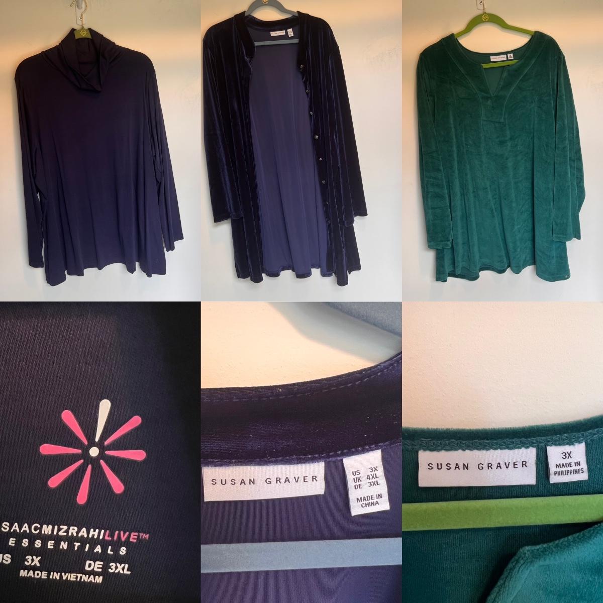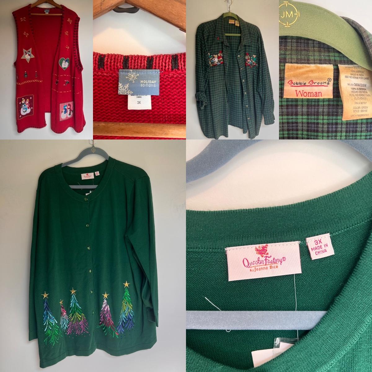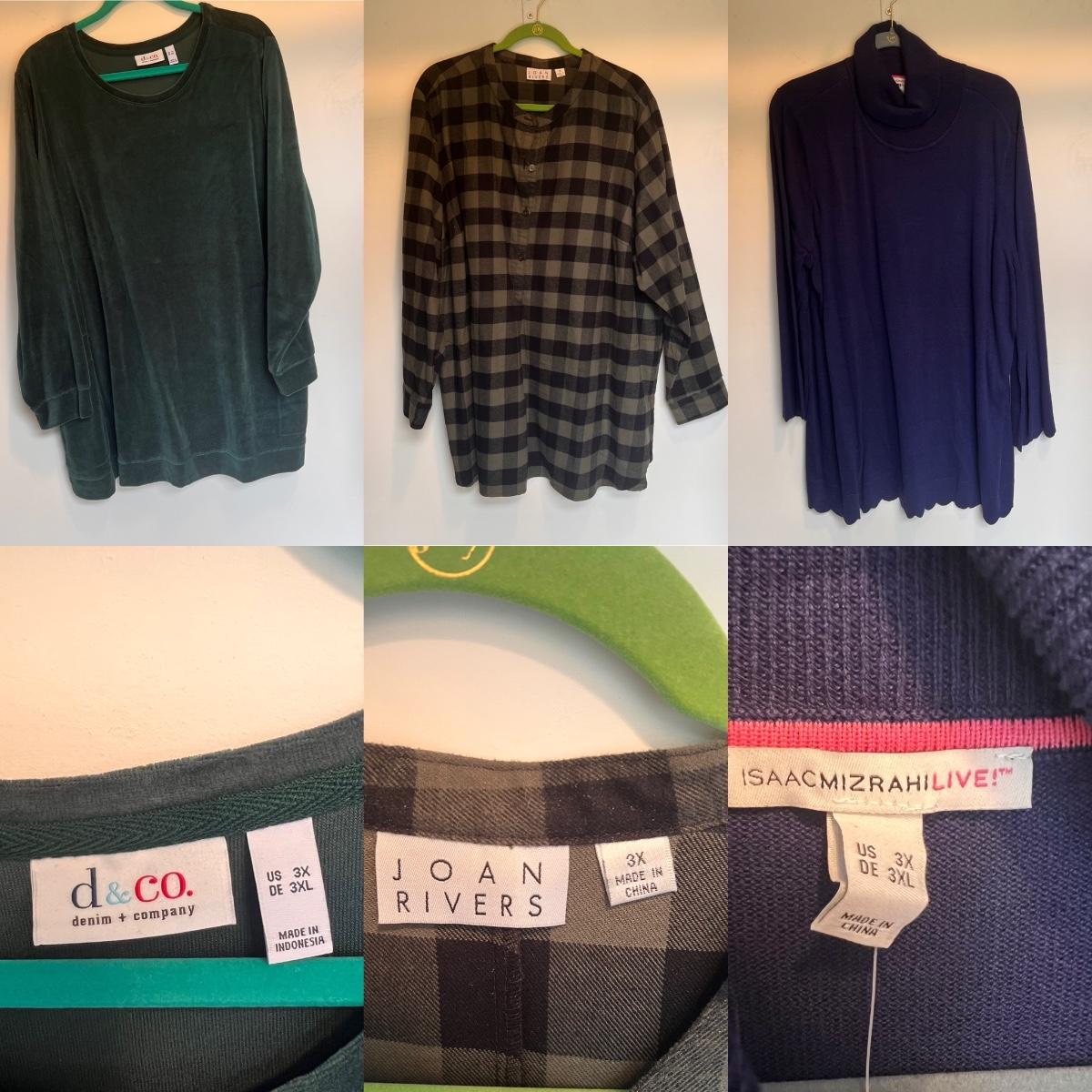 This clothing lot includes over 35 pieces of cooler weather items. There are Isaac Mizrahi sweaters, D&CO turtlenecks, H by Halston turtlenecks, Joan Rivers flannels, Susan Graver cardigans, and more. Also, there are a few Christmas themed pieces. Most pieces range from size 3XL to 4XL. Shipping available.