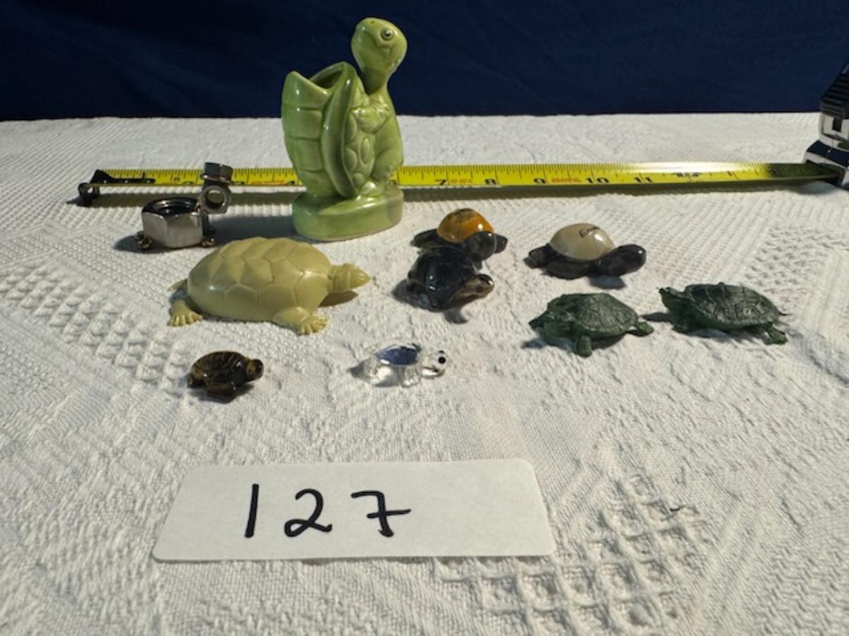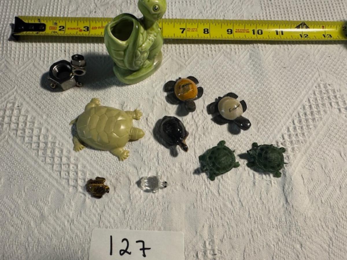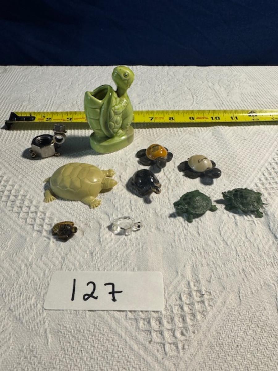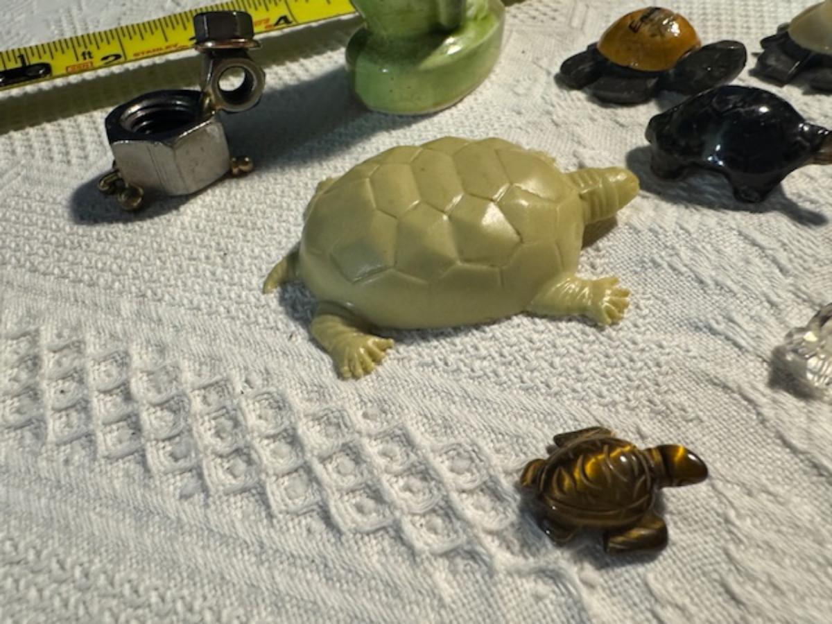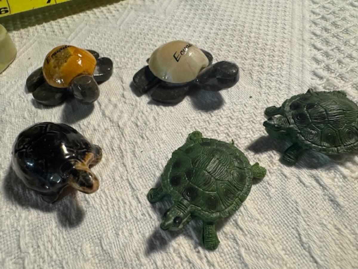 1 ceramic turtle toothpick holder perhaps, 1 metal nut turtle, 1 plastic pencil sharpener turtle. 1 tiger's eye turtle, 1 mini crystal turtle, 2 small plastic turtles, 2 Ecuador stone turtles (one with small chip), and 1 small pottery type turtle.