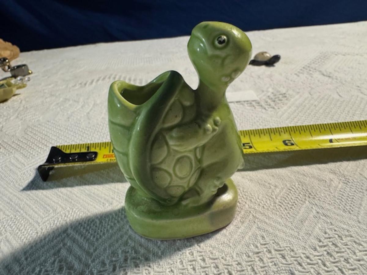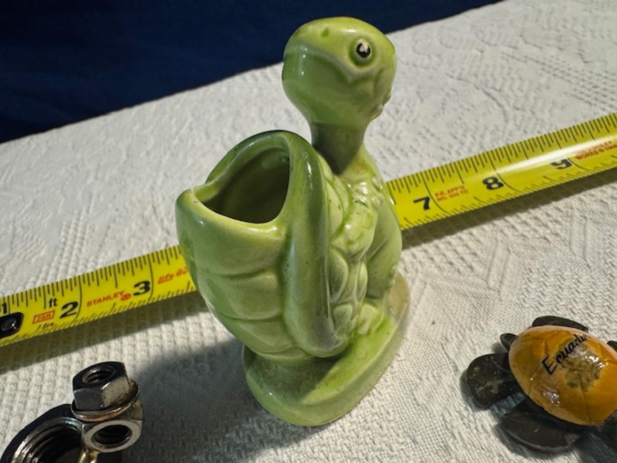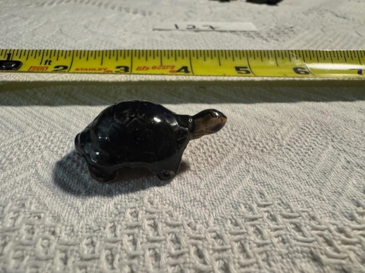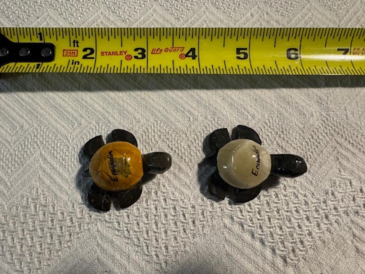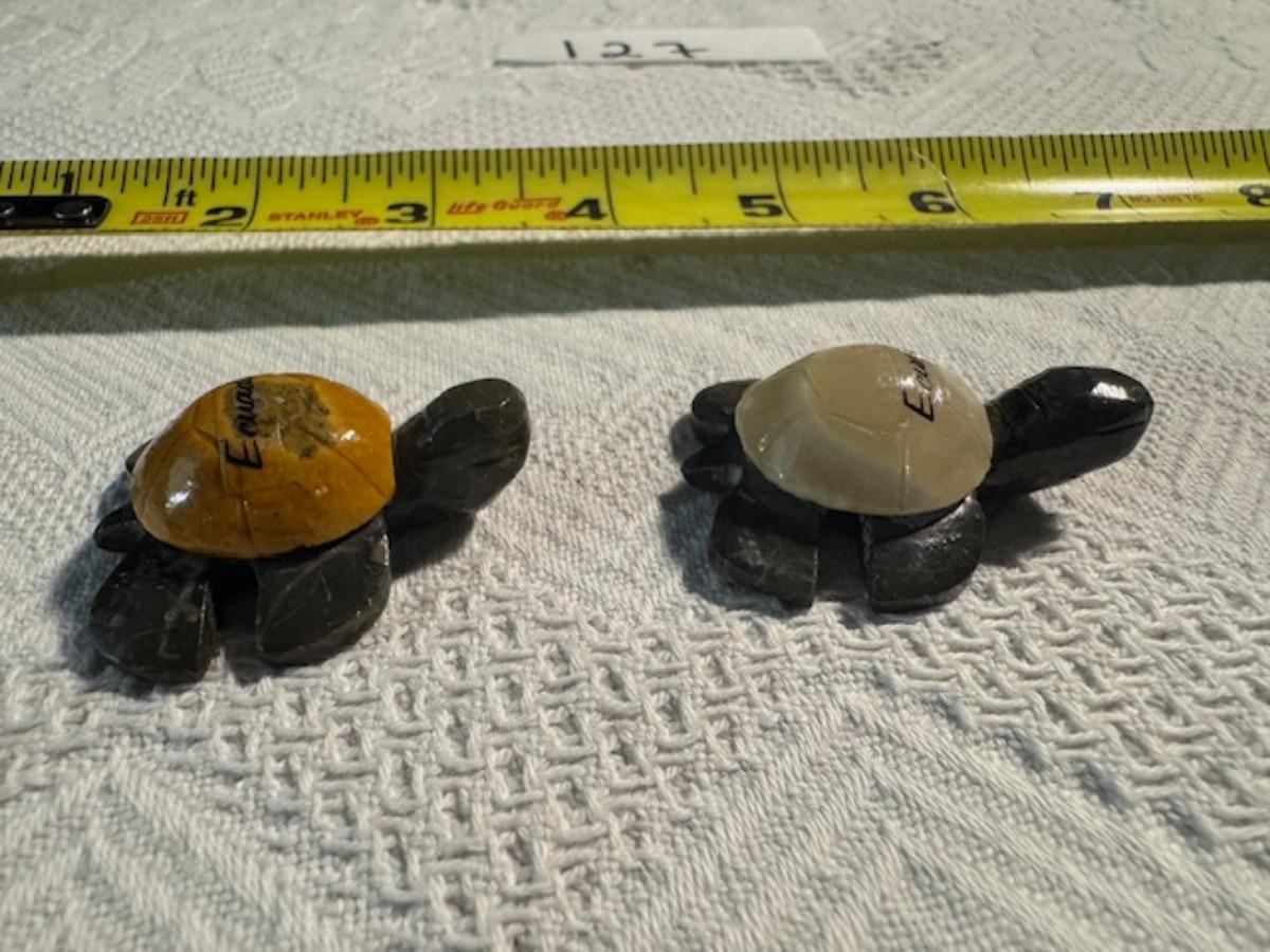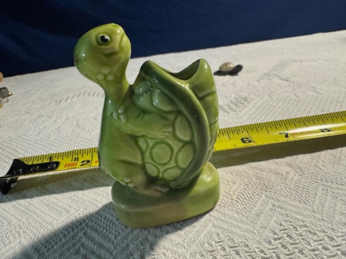1 ceramic turtle toothpick holder perhaps, 1 metal nut turtle, 1 plastic pencil sharpener turtle. 1 tiger's eye turtle, 1 mini crystal turtle, 2 small plastic turtles, 2 Ecuador stone turtles (one with small chip), and 1 small pottery type turtle.