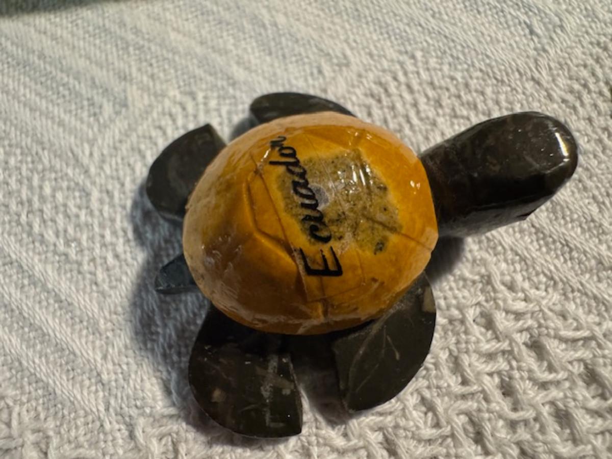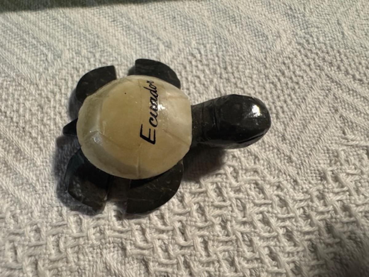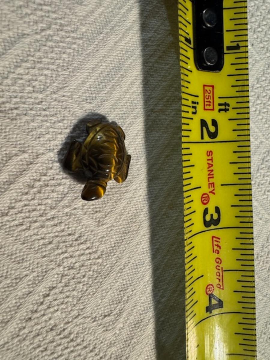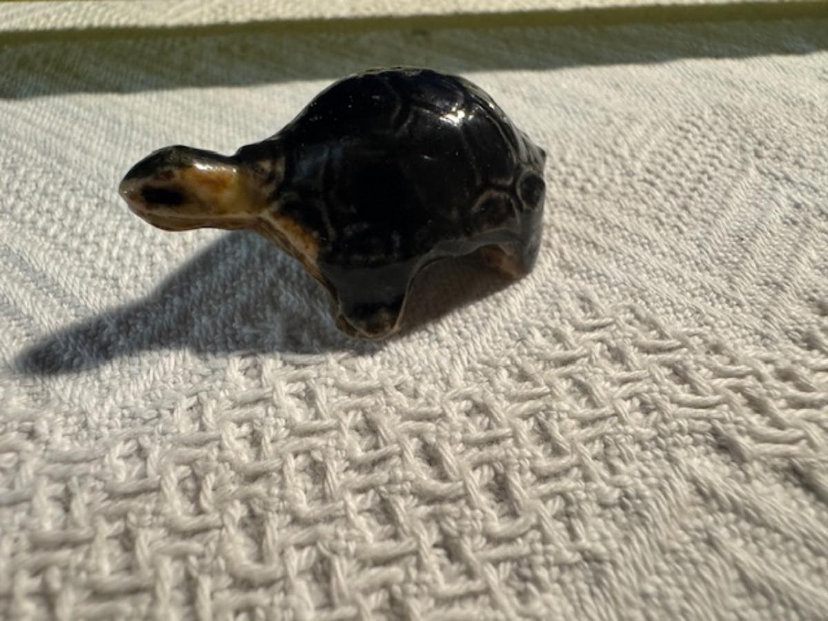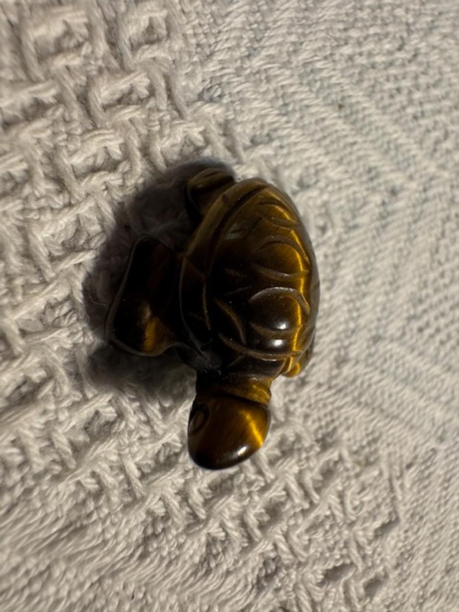 1 ceramic turtle toothpick holder perhaps, 1 metal nut turtle, 1 plastic pencil sharpener turtle. 1 tiger's eye turtle, 1 mini crystal turtle, 2 small plastic turtles, 2 Ecuador stone turtles (one with small chip), and 1 small pottery type turtle.