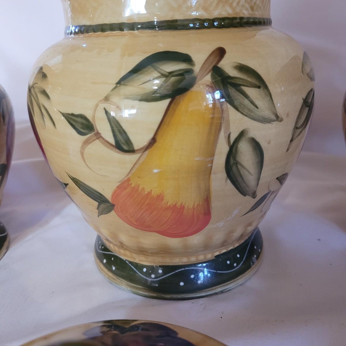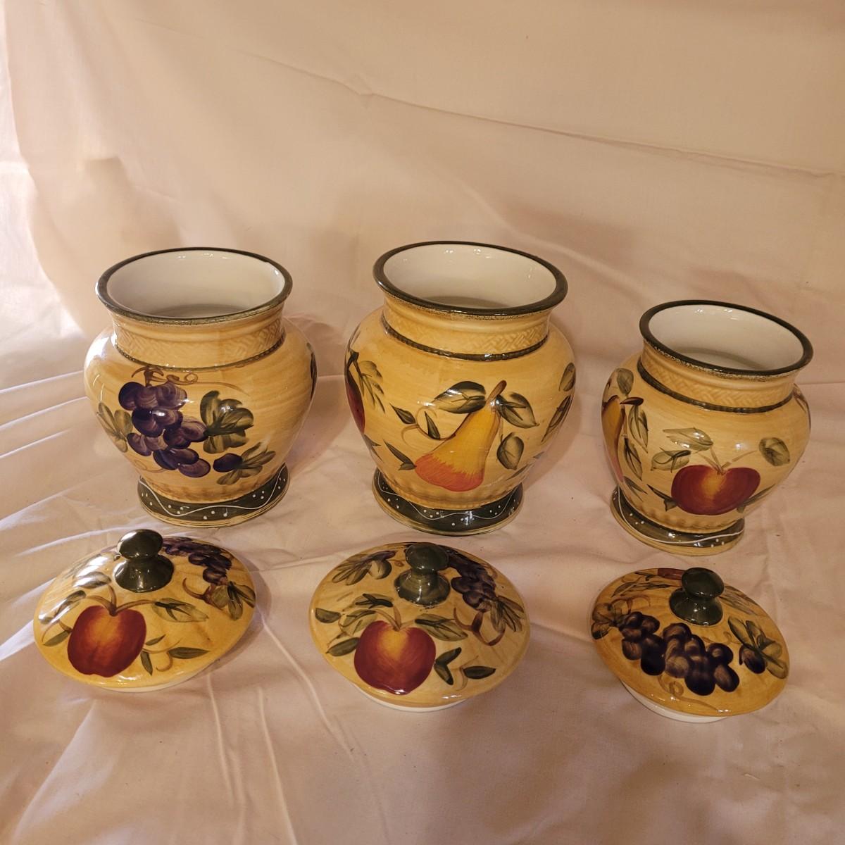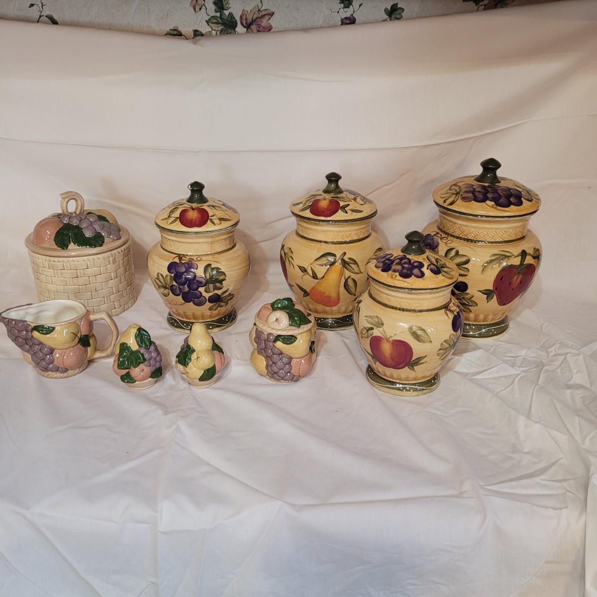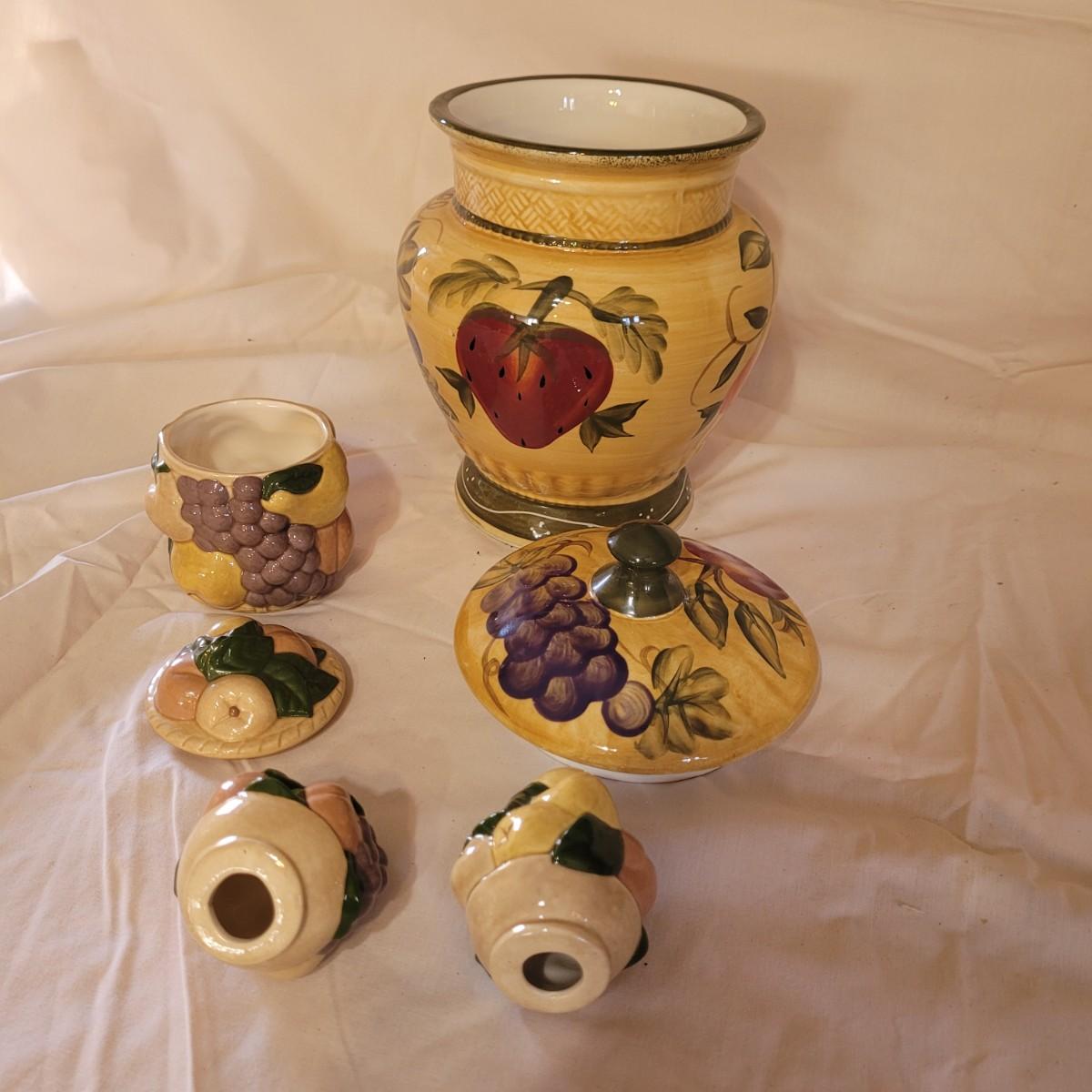 This Tuscan style ceramic ware collection includes six lidded jars of various sizes, a small creamer and salt and pepper shakers (bottom seals are missing - see photos). One jar does have a minor chip on its lid. Largest jar measures approximately 5.5"DIA at opening x 11"H.