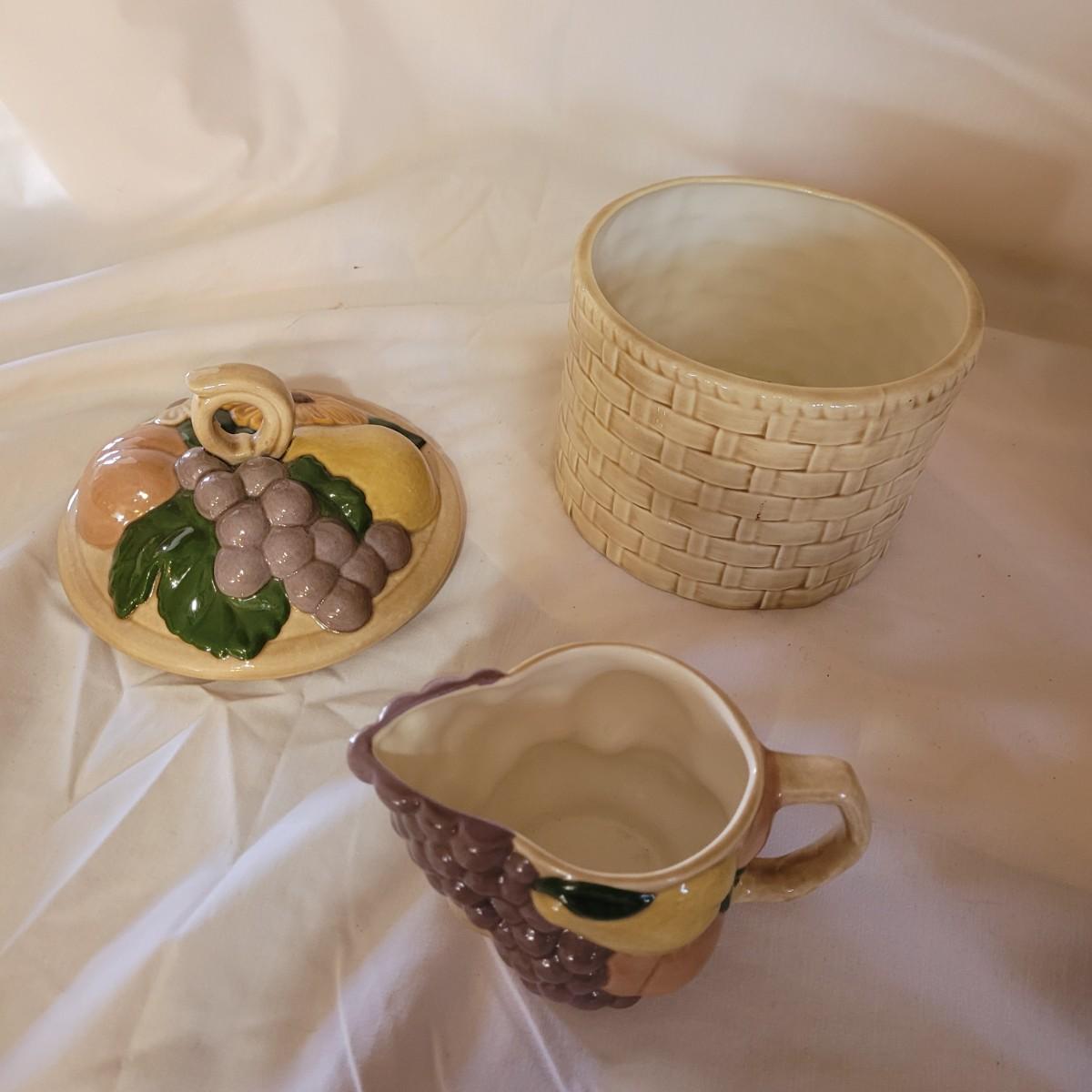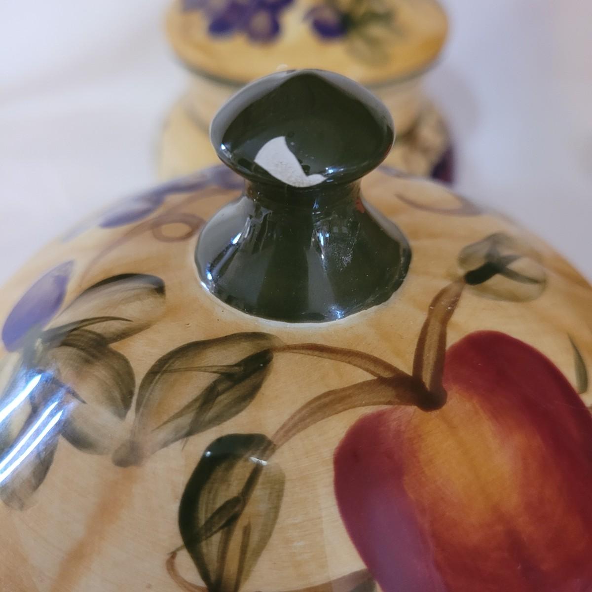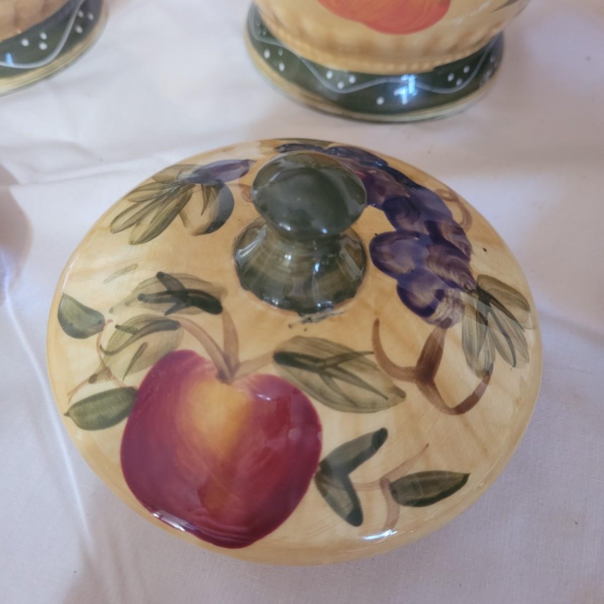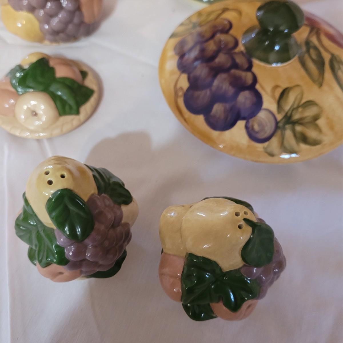 This Tuscan style ceramic ware collection includes six lidded jars of various sizes, a small creamer and salt and pepper shakers (bottom seals are missing - see photos). One jar does have a minor chip on its lid. Largest jar measures approximately 5.5"DIA at opening x 11"H.
